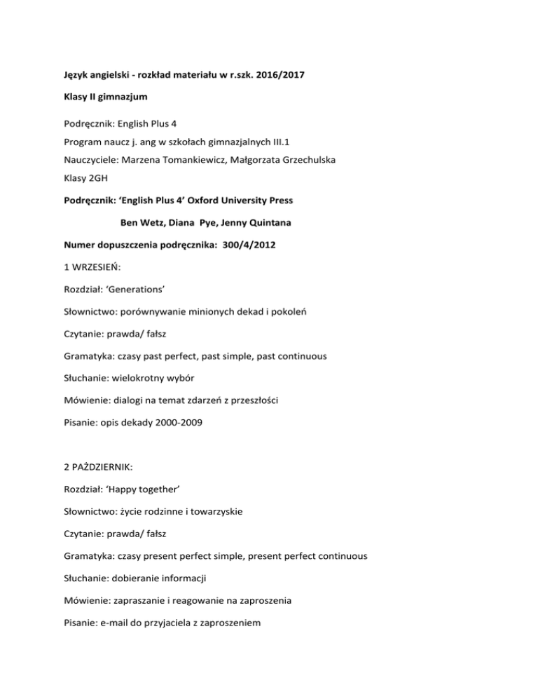 Język angielski - rozkład materiału w r.szk. 2016/2017 Klasy II gimnazjum Podręcznik: English Plus 4 Program naucz j. ang w szkołach gimnazjalnych III.1 Nauczyciele: Marzena Tomankiewicz, Małgorzata Grzechulska Klasy 2GH Podręcznik: ‘English Plus 4’ Oxford University Press Ben Wetz, Diana Pye, Jenny Quintana Numer dopuszczenia podręcznika: 300/4/2012 1 WRZESIEŃ: Rozdział: ‘Generations’ Słownictwo: porównywanie minionych dekad i pokoleń Czytanie: prawda/ fałsz Gramatyka: czasy past perfect, past simple, past continuous Słuchanie: wielokrotny wybór Mówienie: dialogi na temat zdarzeń z przeszłości Pisanie: opis dekady 2000-2009 2 PAŻDZIERNIK: Rozdział: ‘Happy together’ Słownictwo: życie rodzinne i towarzyskie Czytanie: prawda/ fałsz Gramatyka: czasy present perfect simple, present perfect continuous Słuchanie: dobieranie informacji Mówienie: zapraszanie i reagowanie na zaproszenia Pisanie: e-mail do przyjaciela z zaproszeniem 3 LISTOPAD / GRUDZIEŃ: Rozdział: ‘Health matters’ Słownictwo: zdrowie Czytanie: słowotwórstwo Gramatyka: czasowniki modalne Słuchanie: ćwiczenie pytań Mówienie: wymiana opinii Pisanie: rozprawka 4 STYCZEŃ / LUTY: Rozdział 4: ‘Let’s go’ Słownictwo: podróżowanie i turystyka Gramatyka: wyrazanie przyszłosci za pomocą czasów present simple, present continuons, future simple i konstrukcji ‘be going to’ Słuchanie: wielokrotny wybór Mówienie: pytanie i udzielanie informacji Pisanie: e-mail do przyjaciela opisujący plany na weekend 5 MARZEC: Rozdział: ‘Image and identity’ Słownictwo: człowiek, wygląd, moda Czytanie: dobieranie Gramatyka: zaimki zwrotne, strona czynna i bierna Słuchanie: dobieranie Mówienie: zakupy w sklepie odzieżowym Pisanie: list formalny(reklamacja), notatka 6 KWIECIEŃ: Rozdział: ‘A perfect world’ Słownictwo: życie społeczne i polityczne Czytanie: dobieranie Gramatyka: pierwszy i drugi tryb warunkowy Słuchanie: dobieranie Mówienie: wyrażanie życzeń i żalu Pisanie: rozprawka, zaproszenie 7 MAJ: Rozdział: ‘Ups and downs’ Słownictwo: człowiek, cechy charakteru, uczucia Czytanie: wielokrotny wybór Gramatyka: trzeci tryb warunkowy, zdania przydawkowe Słuchanie: wielokrotny wybór Mówienie: wyrażanie współczucia Pisanie: list do przyjaciela 8 CZERWIEC: Rozdział: ‘Honestly’ Słownictwo: życie rodzinne i towarzyskie Czytanie: dobieranie Gramatyka: mowa zależna-zmiana czasów, pytania pośrednie Słuchanie: dobieranie Mówienie: opisywanie zdarzeń (wyjaśnianie, co zaszło) Pisanie: opowiadanie, wiadomość
