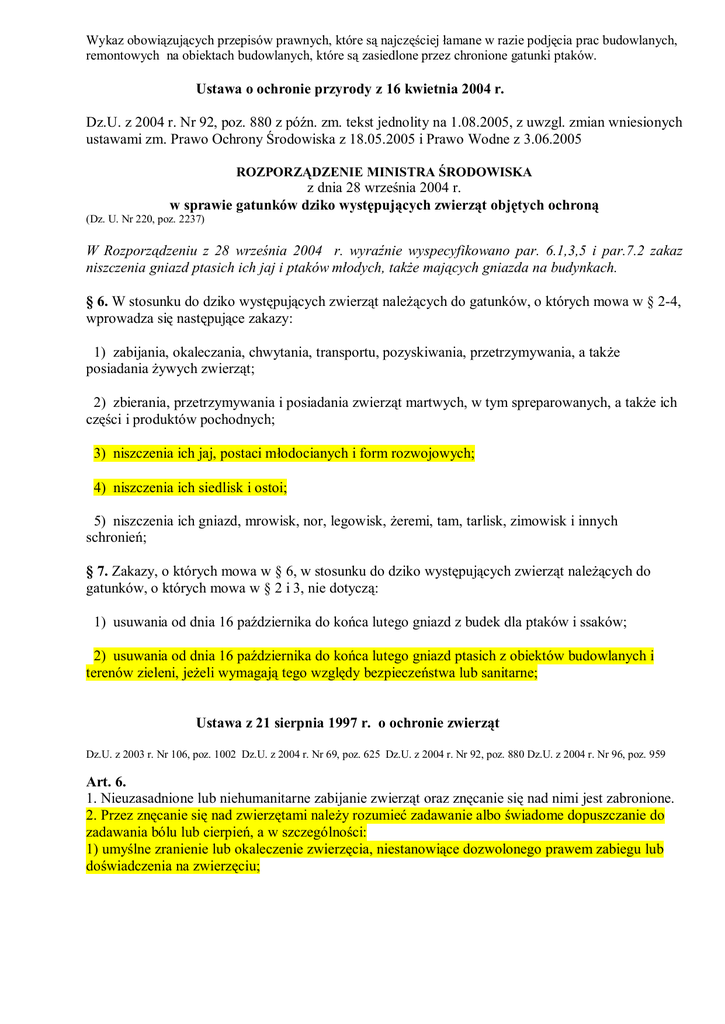 Wykaz obowi zuj cych przepisów prawnych, które s najcz ciej amane w razie podj cia prac budowlanych, remontowych na obiektach budowlanych, które s zasiedlone przez chronione gatunki ptaków. Ustawa o ochronie przyrody z 16 kwietnia 2004 r. Dz.U. z 2004 r. Nr 92, poz. 880 z pó n. zm. tekst jednolity na 1.08.2005, z uwzgl. zmian wniesionych ustawami zm. Prawo Ochrony rodowiska z 18.05.2005 i Prawo Wodne z 3.06.2005 ROZPORZ DZENIE MINISTRA RODOWISKA z dnia 28 wrze nia 2004 r. w sprawie gatunków dziko wyst puj cych zwierz t obj tych ochron (Dz. U. Nr 220, poz. 2237) W Rozporz dzeniu z 28 wrze nia 2004 r. wyra nie wyspecyfikowano par. 6.1,3,5 i par.7.2 zakaz niszczenia gniazd ptasich ich jaj i ptaków m odych, tak e maj cych gniazda na budynkach. § 6. W stosunku do dziko wyst puj cych zwierz t nale cych do gatunków, o których mowa w § 2-4, wprowadza si nast puj ce zakazy: 1) zabijania, okaleczania, chwytania, transportu, pozyskiwania, przetrzymywania, a tak e posiadania ywych zwierz t; 2) zbierania, przetrzymywania i posiadania zwierz t martwych, w tym spreparowanych, a tak e ich cz ci i produktów pochodnych; 3) niszczenia ich jaj, postaci m odocianych i form rozwojowych; 4) niszczenia ich siedlisk i ostoi; 5) niszczenia ich gniazd, mrowisk, nor, legowisk, eremi, tam, tarlisk, zimowisk i innych schronie ; § 7. Zakazy, o których mowa w § 6, w stosunku do dziko wyst puj cych zwierz t nale cych do gatunków, o których mowa w § 2 i 3, nie dotycz : 1) usuwania od dnia 16 pa dziernika do ko ca lutego gniazd z budek dla ptaków i ssaków; 2) usuwania od dnia 16 pa dziernika do ko ca lutego gniazd ptasich z obiektów budowlanych i terenów zieleni, je eli wymagaj tego wzgl dy bezpiecze stwa lub sanitarne; Ustawa z 21 sierpnia 1997 r. o ochronie zwierz t Dz.U. z 2003 r. Nr 106, poz. 1002 Dz.U. z 2004 r. Nr 69, poz. 625 Dz.U. z 2004 r. Nr 92, poz. 880 Dz.U. z 2004 r. Nr 96, poz. 959 Art. 6. 1. Nieuzasadnione lub niehumanitarne zabijanie zwierz t oraz zn canie si nad nimi jest zabronione. 2. Przez zn canie si nad zwierz tami nale y rozumie zadawanie albo wiadome dopuszczanie do zadawania bólu lub cierpie , a w szczególno ci: 1) umy lne zranienie lub okaleczenie zwierz cia, niestanowi ce dozwolonego prawem zabiegu lub do wiadczenia na zwierz ciu;