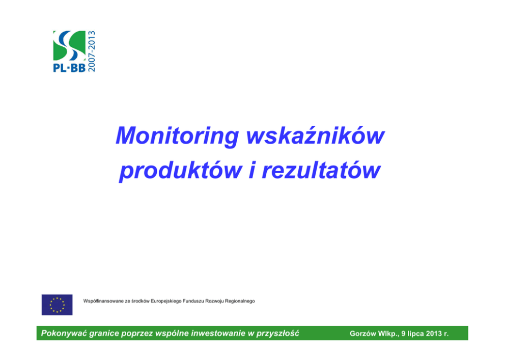 Monitoring wskaźników produktów i rezultatów Współfinansowane ze środków Europejskiego Funduszu Rozwoju Regionalnego Pokonywać granice poprzez wspólne inwestowanie w przyszłość Gorzów Wlkp., 9 lipca 2013 r. Definiowanie wskaźników w projekcie Postęp we wdrażaniu projektu oceniany jest za pośrednictwem systemu wskaźników, które definiują rezultaty i produkty projektu. System wskaźników opiera się na mierzalnych wskaźnikach na dwóch poziomach: Programu i projektu. W każdym projekcie zakłada się zdefiniowanie spodziewanych rezultatów, a także opisanie, w jaki sposób planuje się osiągnięcie rezultatu. Dodatkowo w projekcie powinny zostać sprecyzowane i określone produkty. Współfinansowane ze środków Europejskiego Funduszu Rozwoju Regionalnego Pokonywać granice poprzez wspólne inwestowanie w przyszłość Gorzów Wlkp., 9 lipca 2013 r. Wskaźniki produktów Wskaźnik produktu – oznacza bezpośredni, natychmiastowy efekt projektu oceniany w jednostkach fizycznych lub monetarnych (np. długość wybudowanej drogi, ilość zakupionych komputerów). Współfinansowane ze środków Europejskiego Funduszu Rozwoju Regionalnego Pokonywać granice poprzez wspólne inwestowanie w przyszłość Gorzów Wlkp., 9 lipca 2013 r. Wskaźniki rezultatów Wskaźnik rezultatu – odnosi się do bezpośrednich i natychmiastowych efektów Programu dla bezpośrednich beneficjentów. Dostarcza informacji o zmianach np. w zachowaniu, zdolności wytwórczej lub wydajności beneficjentów. Wskaźnik rezultatu może być o charakterze: • fizycznym (np. skrócenie przejazdu, liczba wyszkolonych, liczba wypadków samochodowych itd.) lub • finansowym (inwestycje sektora prywatnego, zmniejszenie kosztów transportu itd.). Współfinansowane ze środków Europejskiego Funduszu Rozwoju Regionalnego Pokonywać granice poprzez wspólne inwestowanie w przyszłość Gorzów Wlkp., 9 lipca 2013 r. Wskaźniki a budżet projektu • W przypadku, gdy projekt ma specyficzny charakter, możliwe jest dodanie nowych wskaźników, które oddawałyby charakter projektu. • Jednakże, aby wyczerpująco zaprezentować rezultaty Programu, zalecane jest użycie wskaźników określonych w Podręczniku. Nie wykonanie wskaźników produktu i/lub rezultatu ma duży wpływ na budżet całego projektu. Współfinansowane ze środków Europejskiego Funduszu Rozwoju Regionalnego Pokonywać granice poprzez wspólne inwestowanie w przyszłość Gorzów Wlkp., 9 lipca 2013 r. Prawidłowy monitoring wskaźniki produktów i rezultatów w realizowanych projektach • Prawidłowy podział wskaźników na poszczególnych partnerów, w celu uniknięcia ich przekroczeń lub niewypełnienia (np. w Porozumieniu partnerskim). • Stałe śledzenie zmian wartości wskaźników projektu przez każdego z partnerów oraz zgłaszanie wszelkich ich zmian do BW Współfinansowane ze środków Europejskiego Funduszu Rozwoju Regionalnego Pokonywać granice poprzez wspólne inwestowanie w przyszłość Gorzów Wlkp., 9 lipca 2013 r. Konsekwencje związane z przekroczeniem lub niewypełnieniem wartości wskaźników 1. Każdy przypadek dot. zmian wskaźników traktowany jest indywidualnie. 2. Każda zmiana wskaźnika wymaga stosownego wyjaśnienia/uzasadnienia. 3. Kwestia zmiany wartości wskaźnika wpływającej bezpośrednio lub pośrednio na budżet projektu. 4. Kwestia zmiany wartości wskaźników nie mających wpływu na budżet projektu. Współfinansowane ze środków Europejskiego Funduszu Rozwoju Regionalnego Pokonywać granice poprzez wspólne inwestowanie w przyszłość Gorzów Wlkp., 9 lipca 2013 r. Zmiany (zwiększenie lub zmniejszenie) wartości wskaźników w projekcie Zmiany dotyczące wartości danego wskaźnika projektu (zwiększenie lub zmniejszenie wartości wskaźnika) należy ustalać indywidualnie z WST, zgodnie z procedurą opisaną w punkcie 2.1. W przypadku zmian dotyczących tylko i wyłącznie wskaźników projektu nie ma konieczności załączania dokumentu Załącznik nr 1. Zmiana szczegółowego budżetu projektu. Wprowadzone zmiany są odnotowywane przez IZ w rejestrze zmian. Współfinansowane ze środków Europejskiego Funduszu Rozwoju Regionalnego Pokonywać granice poprzez wspólne inwestowanie w przyszłość Gorzów Wlkp., 9 lipca 2013 r. Zmiany (zwiększenie lub zmniejszenie) wartości wskaźników w projekcie Zmiany wartości wskaźników nie mające wpływu na Harmonogram rzeczowo-finansowy i/lub budżet projektu (np. bezkosztowe informacje prasowe, większe zainteresowanie konferencją itp.) należy zgłaszać wraz z najbliższym raportem z postępu realizacji projektu (z opisem zmiany w treści). W przypadku pozostałych zmian dotyczących wskaźników ma zastosowanie zapis mówiący o konieczności złożenia dokumentów na 14 tygodni przed planowanym terminem wprowadzenia zmiany. Zmniejszenie wartości danego wskaźnika może powodować zmniejszenie wartości całego budżetu, co skutkuje zmniejszeniem dofinansowania, wprowadzonym w drodze aneksu do umowy o dofinansowanie projektu. Współfinansowane ze środków Europejskiego Funduszu Rozwoju Regionalnego Pokonywać granice poprzez wspólne inwestowanie w przyszłość Gorzów Wlkp., 9 lipca 2013 r. Wskaźniki osiągnięte w ramach Priorytetu I część 1/2 Wartość osiągnięta Wartość docelowa Liczba partnerów projektu 142 100 Liczba projektów dot. rozbudowy i poprawy infrastruktury 44 15 Liczba projektów służących wspólnemu wykorzystaniu infrastruktury 36 15 Liczba projektów wspierających i poprawiających wspólną ochronę środowiska oraz zarządzanie 10 10 Liczba projektów, które dot. regionalnego rozwoju i planowania 23 10 Nazwa wskaźnika Współfinansowane ze środków Europejskiego Funduszu Rozwoju Regionalnego Pokonywać granice poprzez wspólne inwestowanie w przyszłość Gorzów Wlkp., 9 lipca 2013 r. Wskaźniki osiągnięte w ramach Priorytetu I część 2/2 Nazwa wskaźnika Wartość osiągnięt