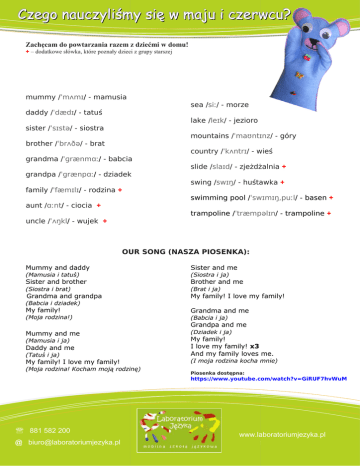 Czego nauczyliśmy się w maju i czerwcu? Zachęcam cam do powtarzania razem z dziećmi w domu! + – dodatkowe słówka, które poznały dzieci z grupy starszej mummy /ˈmʌmɪ/ - mamusia sea /siː/ - morze daddy /ˈdædɪ/ - tatuś lake /leɪk/ - jezioro sister /ˈsɪstə/ - siostra mountains /ˈmaʊntɪnz ˈmaʊntɪnz/ - góry brother /ˈbrʌðə/ - brat country /ˈkʌntrɪ/ - wieś grandma /ˈɡrænmɑː/ - babcia slide /slaɪd/ - zjeżdżalnia + grandpa /ˈɡrænpɑː/ - dziadek swing /swɪŋ/ - huśtawka + family /ˈfæmɪlɪ/ - rodzina + swimming pool /ˈswɪmɪŋ ˈswɪmɪŋ,puːl/ - basen + aunt /ɑːnt/ - ciocia + trampoline /ˈtræmpəlɪn ˈtræmpəlɪn/ - trampoline + uncle /ˈʌŋkl/ - wujek + OUR SONG (NASZA PIOSENKA): Mummy and daddy Sister and me (Mamusia i tatuś) (Siostra i ja) Sister and brother Brother and me (Siostra i brat) (Brat i ja) Grandma and grandpa My family! I love my family! (Babcia i dziadek) My family! (Moja rodzina!) Grandma and me (Babcia i ja) Grandpa and me Mummy and me (Dziadek i ja) (Tatuś i ja) My family! I love my family! x3 And my family loves me. My family! I love my family! (I moja rodzina kocha mnie) (Mamusia i ja) Daddy and me (Moja rodzina! Kocham moją rodzinę) Piosenka dostępna: https://www.youtube.com/watch?v=GiRUF7hvWuM ℡ 881 582 200 @ [email protected] www.laboratoriumjezyka.pl www.laboratoriumjezyka.pl