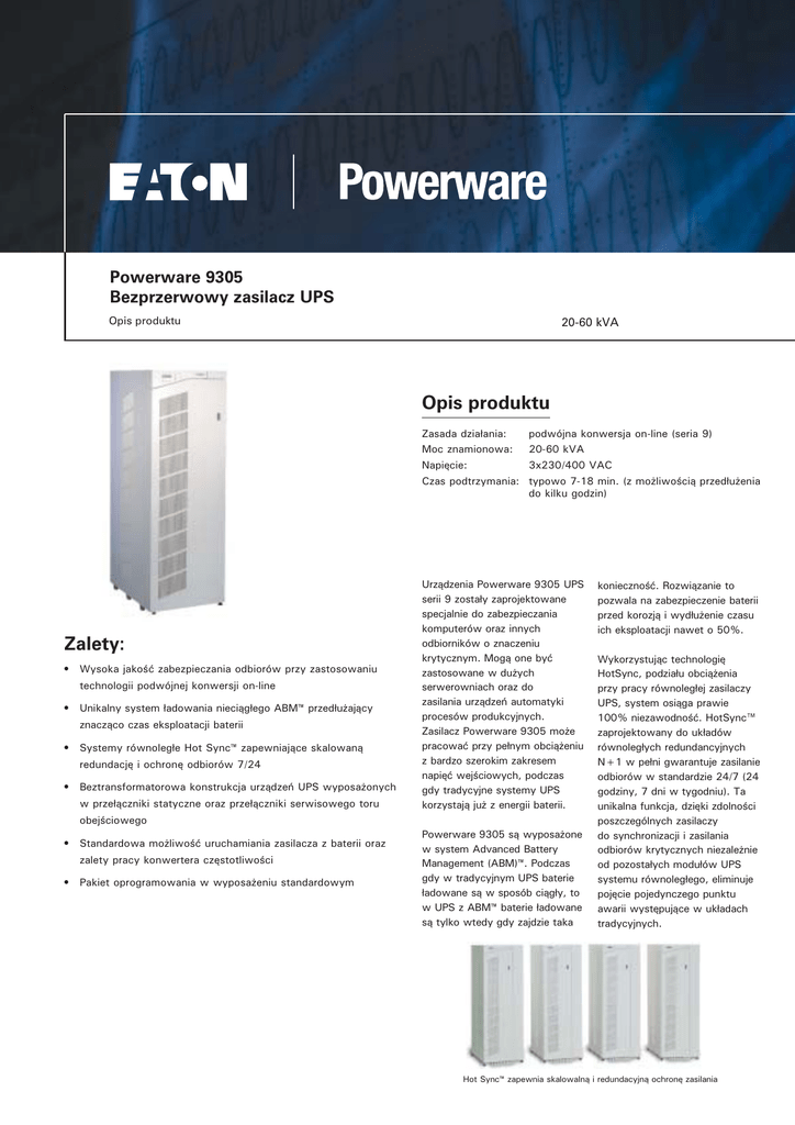 Powerware 9305 Bezprzerwowy zasilacz UPS Opis produktu 20-60 kVA Opis produktu Zasada działania: Moc znamionowa: Napięcie: Czas podtrzymania: Zalety: • Wysoka jakość zabezpieczania odbiorów przy zastosowaniu technologii podwójnej konwersji on-line • Unikalny system ładowania nieciągłego ABM™ przedłużający znacząco czas eksploatacji baterii • Systemy równoległe Hot Sync™ zapewniające skalowaną redundację i ochronę odbiorów 7/24 • Beztransformatorowa konstrukcja urządzeń UPS wyposażonych w przełączniki statyczne oraz przełączniki serwisowego toru podwójna konwersja on-line (seria 9) 20-60 kVA 3x230/400 VAC typowo 7-18 min. (z możliwością przedłużenia do kilku godzin) Urządzenia Powerware 9305 UPS serii 9 zostały zaprojektowane specjalnie do zabezpieczania komputerów oraz innych odbiorników o znaczeniu krytycznym. Mogą one być zastosowane w dużych serwerowniach oraz do zasilania urządzeń automatyki procesów produkcyjnych. Zasilacz Powerware 9305 może pracować przy pełnym obciążeniu z bardzo szerokim zakresem napięć wejściowych, podczas gdy tradycyjne systemy UPS korzystają już z energii baterii. obejściowego • Standardowa możliwość uruchamiania zasilacza z baterii oraz zalety pracy konwertera częstotliwości • Pakiet oprogramowania w wyposażeniu standardowym Powerware 9305 są wyposażone w system Advanced Battery Management (ABM)™. Podczas gdy w tradycyjnym UPS baterie ładowane są w sposób ciągły, to w UPS z ABM™ baterie ładowane są tylko wtedy gdy zajdzie taka konieczność. Rozwiązanie to pozwala na zabezpieczenie baterii przed korozją i wydłużenie czasu ich eksploatacji nawet o 50%. Wykorzystując technologię HotSync, podziału obciążenia przy pracy równoległej zasilaczy UPS, system osiąga prawie 100% niezawodność. HotSync™ zaprojektowany do układów równoległych redundancyjnych N+1 w pełni gwarantuje zasilanie odbiorów w standardzie 24/7 (24 godziny, 7 dni w tygodniu). Ta unikalna funkcja, dzięki zdolności poszczególnych zasilaczy do synchronizacji i zasilania odbiorów krytycznych niezależnie od pozostałych modułów UPS systemu równoległego, eliminuje pojęcie pojedynczego punktu awarii występujące w układach tradycyjnych. Hot Sync™ zapewnia skalowalną i redundacyjną ochronę zasilania Specifikacja techniczna Powerware 9305 Bateria Dane ogólne Moc Sprawność Poziom hałasu 20-60 kVA przy obciążeniu komputerowym Do 94% online < 55 dB(A) 20-30 kVA Typ Ładowanie baterii Napięcie baterii < 60 dB(A) 40-60 kVA Opcje Wejście Napięcie znamionowe Częstotliwość Współczynnik mocy Moduły baterii o żywotności 10 lat Moduły filtrów wejściowych 230/400 V 45-65 Hz 0,96 Moduły transformatorów separacyjnych Równoległe systemy Hot Sync™ Wyjście Napięcie (możliwość wyboru) Regulacja Częstotliwość Przeciążenie Bezobsługowe baterie VRLA System ładowania nieciągłego (ABM™) 384 V (32 bloki) albo 576 V (48 bloków) Adapter sieciowy ConnectUPS SNMP 220/380 V; 230/400 V; 240/415 V ±1% statycznie 50 lub 60 Hz Falownik 150% przez 30 sek.; 170% przez 5 sek. Panel zdalnego monitorowania LCD ViewUPS Oznaczenie CE, GOST Wejście i wyjście trójfazowe / podstawowe modele Moc znamionowa 9305 Part number Czas podtrzymania bateryjnego Wymiary (szer. x gł. x wys.) Masa 20 kVA 1013992 7 min 520x788x1530 mm 400 kg 30 kVA 1020903 10 min 520x788x1530 mm 490 kg 40 kVA 1018617 10 min z zewnętrzną 520x788x1530 mm 230 kg BATI-D WIDE 1015467 baterią BATI-D W 520x788x1530 mm 550 kg 50 kVA 1014978 7 min z zewnętrzną 520x788x1530 mm 260 kg BATI-D WIDE 1015467 baterią BATI-D W 520x788x1530 mm 550 kg 60 kVA 1014514 10 min z zewnętrzną 520x788x1530 mm 260 kg 1011483 baterią BATI-D E 520x788x1530 mm 815 kg BATI-E Ze względu na stały rozwój, wszystkie specyfikacje mogą zostać zmienione bez powiadomienia. Powerware®, Advanced Battery Management, LanSafe, PowerVision, i FORESEER są znakami towarowymi (™) firmy Eaton Power Quality Corporation. © 2005 Eaton Corporation POLSKA Powerware Solutions Eaton Power Quality SA Oddział w Polsce ul. Chrościckiego 93/105 02-414 Warszawa Tel: +48 22 331 85 24 Fax: + 48 22 331 85 16 [email protected] www.powerware.com DANIA Tel: +45 3686 7910 [email protected] FRANCJA Tel: +33 1 60 12 74 00 [email protected] WŁOCHY Tel: +39 02 66 04 05 40 [email protected] SZWECJA Tel: +46 8 598 940 00 [email protected] FINLANDIA Tel: +358 9 452 661 [email protected] NIEMCY Tel: +49 7841 6040 [email protected] NORWEGIA Tel: +47 23 03 65 50 [email protected] WIELKA BRYTANIA Tel: +44 1753-608 700 [email protected] ROSJA Tel: +7 095 787 2890 [email protected] 1017990 Rev D 12/2004