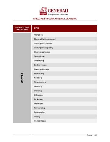 SPECJALISTYCZNA OPIEKA LEKARSKA ŚWIADCZENIE MEDYCZNE OPIS Alergolog Chirurg klatki piersiowej Chirurg naczyniowy Chirurg onkologiczny Choroby zakaźne Dermatolog Diabetolog Endokrynolog WIZYTA Gastroenterolog Hematolog Nefrolog Neurochirurg Neurolog Onkolog Ortopeda Proktolog Psychiatra Pulmonolog Reumatolog Urolog Rehabilitacja Strona 1 z 10 SPECJALISTYCZNA OPIEKA LEKARSKA Zabieg alergologiczny ŚWIADCZENIE MEDYCZNE Zabieg ginekologiczny Zabieg dermatologiczny OPIS Wstrzyknięcia terapeutyczne, profilaktyczne lub diagnostyczne podskórne lub domięśniowe. Próby płatkowe (z zestawem alergenów kontaktowych). Testy przezskórne (skaryfikacje, nakłucia) z wyciągami alergenów; natychmiastowa reakcja skórna, podać liczbę wykonanych testów. Testy śródskórne z wyciągami alergenów, reakcja typu natychmiastowego. Biopsja diagnostyczna skóry i tkanki podskórnej Zniszczenie zmiany (zmian), srom; proste (np. laser, elektrokoagulacja, kriochirurgia, związki chemiczne). Koagulacja szyjki macicy elektryczna lub termiczna. Koagulacja szyjki macicy; krioterapia pierwsza lub powtarzalna. Koagulacja szyjki macicy; ablacja z użyciem lasera. Zabieg Okulistyczny Dobieranie szkieł kontaktowych Elektroretinografia Badanie GDx Wstrzyknięcie podspojówkowe Zabiegi na przewodach łzowych Zabieg urologiczny Nacięcie wędzidełka prącia. Strona 2 z 10 SPECJALISTYCZNA OPIEKA LEKARSKA ŚWIADCZENIE MEDYCZNE OPIS Iniekcja dostawowa z lekiem/punkcja stawu. Leczenie złamania zamkniętego, zwichnięcia (staw biodrowy, kolanowy, barkowy, ramienny) ze znieczuleniem. Zamknięte leczenie złamania obojczyka bez nastawienia ręcznego. Zamknięte leczenie złamania obojczyka z nastawieniem ręcznym. Zamknięte leczenie złamania łopatki bez nastawienia ręcznego. Zamknięte leczenie złamania łopatki z nastawieniem ręcznym. Zabieg ortopedyczny Zamknięte leczenie złamania części bliższej kości ramiennej (szyjka chirurgiczna lub anatomiczna) bez nastawienia ręcznego. Zamknięte leczenie złamania części bliższej kości ramiennej (szyjka chirurgiczna lub anatomiczna) z nastawienie ręcznym, z wyciągiem lub bez. Zamknięte leczenie złamania guzka większego kości ramiennej bez nastawienia ręcznego. Zamknięte leczenie złamania guzka większego kości ramiennej z nastawieniem ręcznym. Zamknięte leczenie złamania bez nastawienia ręcznego (kość ramieniowa). Zamknięte leczenie złamania z nastawieniem ręcznym (kość ramieniowa). Zamknięte leczenie złamania nadkłykciowego lub przezkłykciowego bez nastawienia ręcznego (kość ramieniowa). Zamknięte leczenie złamania nadkłykciowego lub przezkłykciowego z nastawieniem ręcznym, z zastosowaniem wyciągu lub bez (kość ramieniowa) Zamknięte leczenie złamania nadkłykcia przyśrodkowego lub bocznego bez nastawienia ręcznego (kość ramieniowa) Zamknięte leczenie złamania nadkłykcia przyśrodkowego lub bocznego z nastawieniem ręcznym (kość ramieniowa) Zamknięte leczenie złamania kłykcia bez nastawienia ręcznego (kość ramieniowa) Strona 3 z 10 SPECJALISTYCZNA OPIEKA LEKARSKA ŚWIADCZENIE MEDYCZNE OPIS Zamknięte leczenie złamania kłykcia z nastawieniem ręcznym (kość ramieniowa). Zamknięte leczenie złamania typu Monteggia ze zwichnięciem w stawie łokciowym z nastawieniem ręcznym. Zamknięte leczenie złamania głowy lub szyjki kości promieniowej bez nastawienia ręcznego. Zamknięte leczenie złamania głowy lub szyjki kości promieniowej z nastawieniem ręcznym. Zamknięte leczenie złamania kości łokciowej (wyrostek łokciowy) bez nastawienia ręcznego. Zamknięte leczenie złamania kości łokciowej (wyrostek łokciowy) z nastawieniem ręcznym. Zabieg ortopedyczny Zamknięte leczenie złamania trzonu kości promieniowej, bez nastawienia ręcznego. Zamknięte leczenie złamania trzonu kości promieniowej z nastawieniem ręcznym. Zamknięte leczenie złamania trzonu kości łokciowej, bez nastawienia ręcznego. Zamknięte leczenie złamania trzonu kości łokciowej z nastawieniem ręcznym. Zamknięte leczenie złamania trzonu kości łokciowej i promieniowej, bez nastawienia ręcznego. Zamknięte leczenie złamania trzonu kości łokciowej i promieniowej, z nastawieniem ręcznym. Zamknięte leczenie złamania dalszego końca kości promieniowej (Collesa lub Smitha), bez nastawienia ręcznego Zamknięte leczenie złamania dalszego końca kości promieniowej (Collesa lub Smitha), z nastawieniem ręcznym Zamknięte leczenie złamania kości łódeczkowatej, bez nastawienia ręcznego Zamknięte leczenie złamania kości łódeczkowatej, z nastawieniem ręcznym Zamknięte leczenie złamania kości nadgarstka (bez kości łódeczkowatej), bez nastawienia ręcznego. Strona 4 z 10 SPECJALISTYCZNA OPIEKA LEKARSKA ŚWIADCZENIE MEDYCZNE OPIS Zamknięte leczenie złamania kości udowej (międzykrętarzowego, przezkrętarzowego, podkrętarzowego) bez nastawienia ręcznego. Zamknięte leczenie złamania kości udowej (międzykrętarzowego, przezkrętarzowego, podkrętarzowego) z nastawieniem ręcznym, z wyciągiem lub bez. Zamknięte leczenie złamania krętarza większego kości udowej bez nastawienia ręcznego. Zamknięte leczenie złamania trzonu kości udowej bez nastawienia ręcznego. Zamknięte leczenie złamania nadkłykciowego lub przezkłykciowego kości udowej bez nastawienia ręcznego. Zabieg ortopedyczny Zamknięte leczenie złamania trzonu kości udowej z nastawieniem ręcznym, z wyciągiem lub bez. Zamknięte leczenie złamania nadkłykciowego lub przezkłykciowego kości udowej z nastawieniem ręcznym, z wyciągiem lub bez. Zamknięte leczenie złamania kości udowej (koniec dalszy, kłykieć przyśrodkowy lub boczny) bez nastawienia ręcznego. Zamknięte leczenie złamania kości udowej (koniec dalszy, kłykieć przyśrodkowy lub boczny) z nastawieniem ręcznym. Zamknięte leczenie oddzielenia nasady dalszej kości udowej bez nastawienia ręcznego. Zamknięte leczenie oddzielenia nasady dalszej kości ud