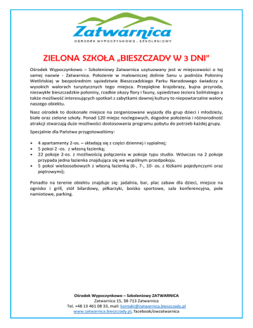 ZIELONA SZKOŁA „BIESZCZADY W 3 DNI” Ośrodek Wypoczynkowo – Szkoleniowy Zatwarnica usytuowany jest w miejscowości o tej samej nazwie - Zatwarnica. Położenie w malowniczej dolinie Sanu u podnóża Połoniny Wetlińskiej w bezpośrednim sąsiedztwie Bieszczadzkiego Parku Narodowego świadczy o wysokich walorach turystycznych tego miejsca. Przepiękne krajobrazy, bujna przyroda, niezwykłe bieszczadzkie połoniny, rzadkie okazy flory i fauny, sąsiedztwo Jeziora Solińskiego a także możliwość interesujących spotkań z zabytkami dawnej kultury to niepowtarzalne walory naszego obiektu. Nasz ośrodek to doskonałe miejsce na zorganizowane wyjazdy dla grup dzieci i młodzieży, białe oraz zielone szkoły. Ponad 120 miejsc noclegowych, dogodne położenia i różnorodność atrakcji stwarzają duże możliwości dostosowania programu pobytu do potrzeb każdej grupy. Specjalnie dla Państwa przygotowaliśmy: • • • • 4 apartamenty 2-os. – składają się z części dziennej i sypialnej; 5 pokoi 2 -os. z własną łazienką; 22 pokoje 2-os. z możliwością połączenia w pokoje typu studio. Wówczas na 2 pokoje przypada jedna łazienka znajdująca się we wspólnym przedpokoju. 5 pokoi wieloosobowych z własną łazienką (6-, 7-, 10- os. z łóżkami pojedynczymi oraz piętrowymi); Ponadto na terenie obiektu znajduje się: jadalnia, bar, plac zabaw dla dzieci, miejsce na ognisko i grill, stół bilardowy, piłkarzyki, boisko sportowe, sala konferencyjna, pole namiotowe, parking. Ośrodek Wypoczynkowo – Szkoleniowy ZATWARNICA Zatwarnica 15, 38-713 Zatwarnica Tel. +48 13 461 08 33, mail: [email protected] www.zatwarnica.bieszczady.pl, facebook/owzatwarnica PROGRAM ZIELONEJ SZKOŁY „BIESZCZADY W 3 DNI” (3 dni, 2 noclegi) Podczas tego pobytu uczestnicy zwiedzą i zobaczą najważniejsze miejsca w Bieszczadach. DZIEŃ 1 Pobyt zaczniemy od objazdu wokół bieszczadzkich jezior. Najpierw przejdziemy piechotą do cudownego źródełka w Zwierzyniu a potem przez wzgórze Grodzisko zejdziemy na zaporę na Jeziorze Myczkowieckim. W dalszej części przejedziemy wzdłuż tego jeziora do Soliny, w której znajduje się największa zapora w Polsce licząca sobie 664 m długości i 82 m wysokości i zarazem największe sztuczne jezioro. Przejście po zaporze połączone z opowieściami przewodnika odnośnie historii tego miejsca. Możliwość zamówienia zwiedzania zapory od środka (dopłata 13 zł/os.) lub też rejsu statkiem (18 zł/os.). Następnie przyjazd do OW Zatwarnica, zakwaterowanie, obiad. Po chwilowym odpoczynku wspólna kolacja w formie ogniska, nocleg. DZIEŃ 2 Śniadanie. Piesza wycieczka na bieszczadzkie połoniny. Wyjście rozpoczniemy z Przełęczy Wyżnej, wyjdziemy żółtym szlakiem do Chatki Puchatka – najwyżej położonego schroniska w Bieszczadach, następnie przejdziemy całą Połoninę Wetlińską do Przełęczy Orłowicza i zejdziemy do Zatwarnicy do ośrodka. Dzieci na drogę dostaną suchy prowiant. Wieczorem kolacja i dyskoteka. Nocleg. DZIEŃ 3 Śniadanie. Wykwaterowanie z obiektu. W drodze powrotnej odwiedzimy pokazową zagrodę żubra oraz ekspozycję poświęconą wypałowi drewna w Bieszczadach. Następnie przejedziemy w okolice Sanoka skąd rozpoczniemy spływ pontonami a na zakończenie wycieczki ognisko z pieczeniem kiełbasek. Ośrodek Wypoczynkowo – Szkoleniowy ZATWARNICA Zatwarnica 15, 38-713 Zatwarnica Tel. +48 13 461 08 33, mail: [email protected] www.zatwarnica.bieszczady.pl, facebook/owzatwarnica Ceny: Grupa 20 osób – 245 zł/os. (w cenę wliczony pobyt 2 opiekunów oraz kierowcy) Grupa 30 osób – 225 zł/os. (w cenę wliczony pobyt 2 opiekunów oraz kierowcy) Grupa 45 osób – 210 zł/os. (w cenę wliczony pobyt 3 opiekunów oraz kierowcy) Zakwaterowanie w pokojach wieloosobowych z łazienkami; Terminy: pakiety możliwe do zrealizowania w układzie od poniedziałku do piątku. Świadczenia: 2 noclegi; wyżywienie: 2 śniadania, 2 obiady, 2 kolacje, ognisko; wycieczka na Bieszczadzkie Morze (w cenie przewodnik); wycieczka z przewodnikiem na Połoninę Wetlińską (w cenie przewodnik, bilety wstępu do Bieszczadzkiego Parku Narodowego); wycieczka z przewodnikiem do Sanoka (w cenie przewodnik, spływ pontonami), VAT. W cenie nie ujęto: przyjazdu grupy do miejsca zakwaterowania, kosztów transportu podczas pobytu i wycieczek, parkingów i opłat drogowych, ubezpieczenia. Program ma charakter ramowy. ZAPRASZAMY! Ośrodek Wypoczynkowo – Szkoleniowy ZATWARNICA Zatwarnica 15, 38-713 Zatwarnica Tel. +48 13 461 08 33, mail: [email protected] www.zatwarnica.bieszczady.pl, facebook/owzatwarnica