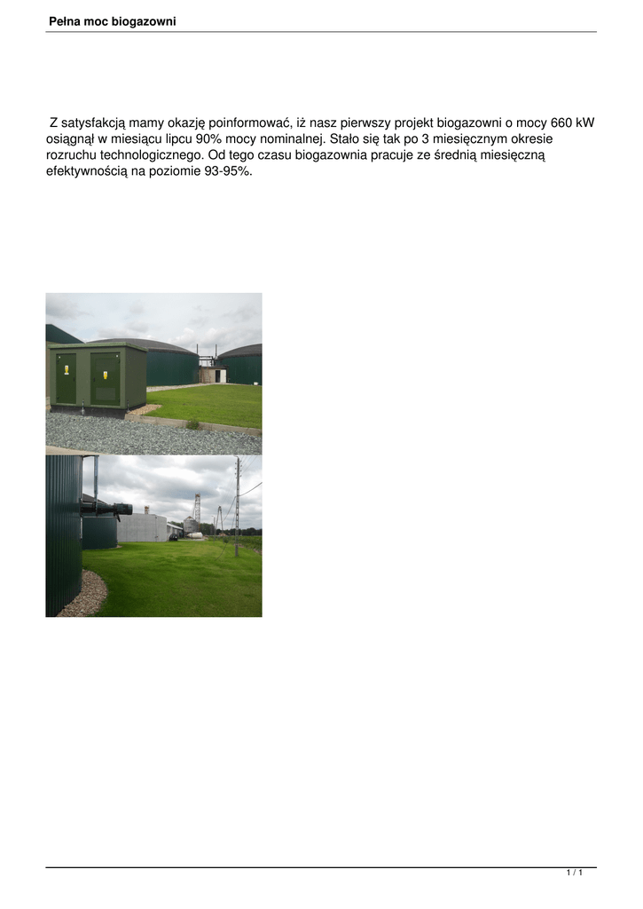 Pełna moc biogazowni Z satysfakcją mamy okazję poinformować, iż nasz pierwszy projekt biogazowni o mocy 660 kW osiągnął w miesiącu lipcu 90% mocy nominalnej. Stało się tak po 3 miesięcznym okresie rozruchu technologicznego. Od tego czasu biogazownia pracuje ze średnią miesięczną efektywnością na poziomie 93-95%. 1/1