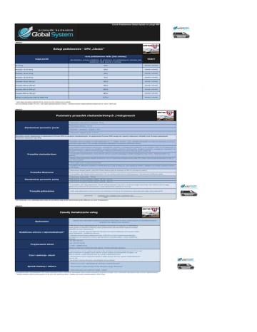Cennik Podstawowy Global System na usługi DPD tabela 1 Usługi podstawowe - DPD „Classic” cena podstawowa netto (bez umowy) waga paczki RABAT dla klientów z umową współpracy do poniższych cen podstawowych naliczany jest dodatkowy rabat zawarty w umowie. Do 10 kg 24 zł zawarty w umowie Powyżej 10 do 20 kg 26 zł zawarty w umowie Powyżej 20 do 30 kg 28 zł zawarty w umowie Powyżej 30 do 50 kg 70 zł zawarty w umowie Powyżej 50 do 100 kg* 150 zł zawarty w umowie Powyżej 100 do 300 kg* 198 zł zawarty w umowie Powyżej 300 do 500 kg* 220 zł zawarty w umowie Powyżej 500 do 700 kg* 280 zł zawarty w umowie Usługa za pobraniem COD do 5000 PLN 8,75 zł zawarty w umowie * Jeżeli waga rzeczywista przekracza 50 kg, paczka musi być umieszczona na palecie. Ceny nie zawierają podatku VAT 23% oraz dopłaty paliwowej (wartość zmienna ) . Aktualna wysokość dopłaty paliwowej dostępna jest na stronie: kliknij tutaj tabela 2 Parametry przesyłek niestandardowych /nietypowych · Maksymalna waga paczki w przesyłce: 30 kg · Maksymalna długość: 175 cm Standardowe parametry paczki · Wysokość + szerokość + długość ≤ 300 · Maksymalna objętość paczki: 0,35 m 2 Wszystkie paczki zapakowane w opakowania firmowe DPD są paczkami standardowymi. Za opakowania firmowe DPD uznaje się: koperty tekturowe, foliopaki oraz firmowe opakowania kartonowe opatrzone logo DPD. · Przesyłka, która ze względu na swoje właściwości (m. in. kształty, wymiary, ciężar, delikatna zawartość) nie może być sortowana za pomocą automatycznego sortera i/lub wymaga specjalnego traktowania w przewozie (sortowanie ręczne) · Do przesyłek niesortowalnych zalicza się w szczególności: przesyłki o nieregularnych kształtach, w tym przesyłki, które nie są zapakowane w karton/opakowanie o regularnych kształtach, przesyłki o kształcie owalnym, cylindrycznym, okrągłym, przesyłki z wystającymi elementami lub przesyłki owinięte w materiał uniemożliwiający swobodne przesuwanie po sorterze takie jak guma, stretch itp. · Do przesyłek niesortowalnych, można również zaliczyć przesyłki posiadające naklejki ostrzegawcze typu "Góra", "Ostrożnie Szkło" lub podobne. Przesyłka niestandardowa · Paczka, której maksymalna długość przekracza 175 cm (maksymalna długość paczki, jaką DPD Polska może przyjąć do przewozu to 250 cm (nie dotyczy palet)) · Paleta, gdzie towar wystaje poza jej obrys · Przesyłka nie ustawiona na palecie w wadze powyżej 31,5kg do 50kg przy czym sposób jej odbioru i dostawy musi zostać wcześniej ustalony z DPD Polska · Maksymalna długość paczki, jaką DPD Polska może przyjąć do przewozu to 250 cm (nie dotyczy palet)) Przesyłka dłużycowa · W przypadku, gdy długość paczki przekracza 175 cm, paczkę uznaje się za niestandardową i naliczana jest dodatkowa opłata · Maksymalna waga palety - 700 kg Standardowe parametry palety · Maksymalne wymiary podstawy palety - 80 cm x 120 cm · Maksymalna wysokość ładunku razem z paletą ≤ 180 cm · W przypadku, gdy waga gabarytowa, liczona według podanego niżej wzoru, przekracza wagę rzeczywistą, cena ustalana jest za wagę gabarytową (naliczana dla paczek/palet o wadze gabarytowej większej niż 41,6 kg) Przesyłka gabarytowa · Jeżeli waga gabarytowa liczona ze wzoru nie przekracza 41,6 kg na list przewozowy wpisywana jest waga rzeczywista paczki gabarytowa = wysokość (cm) x długość (cm) x szerokość (cm) 6000 DPD Polska Sp. z o.o. zastrzega sobie prawo do weryfikacji wagi paczki deklarowanej przez Nabywcę na Liście Przewozowym tabela 3 Zasady świadczenia usług Opakowanie · Nadawca jest zobowiązany przekazać przesyłkę do DPD Polska w stanie umożliwiającym jej prawidłowy przewóz i doręczenie bez ubytków oraz uszkodzeń · DPD Polska ponosi odpowiedzialność do wartości rzeczywistej nie większej niż 5000 PLN za każdą paczkę w przesyłce oznaczoną listem przewozowym pod warunkiem wpisania wartości przesyłki na liście przewozowym. Dodatkowa ochrona i odpowiedzialność* · Na paczki o wartości powyżej 5000 PLN oferujemy korzystną dodatkową ochronę patrz tabela Usługi dodatkowe: „Dodatkowa ochrona”. · Wpisanie wartości/kwoty pobrania powyżej 5 000 PLN na liście przewozowym powoduje przystąpienie do dodatkowej ochrony, pod warunkiem uiszczenia opłaty z tytułu dodatkowej ochrony · tel. 801-400-373 Przyjmowanie zleceń · tel. (22) 577-55-55 · e-mail: [email protected] Opłata za połączenie telefoniczne jest zgodna z taryfą wybranego operatora. Czas i realizacja zleceń · Gwarantowany termin podjęcia pierwszej próby doręczenia przesyłek adresowanych do firm oraz osób prywatnych to następny dzień roboczy od dnia nadania (od poniedziałku do piątku, nie dotyczy paczek o wadze powyżej 50,0 kg i paczek niestandardowych) · Gwarantowany termin doręczenia paczek o wadze powyżej 50,0 kg i paczek niestandardowych wynosi 48h · Na życzenie Klienta oferujemy wcześniejsze terminy dostaw · Paczki do 31,5 kg** realizowane są w serwisie „od drzwi do drzwi”. Sposób dostawy i odbioru · Dla przesyłek o wadze powyżej 31,5kg oferujemy usługę „Wniesienie” · Palety doręczane są w systemie “rampa - rampa” *Szczegółowy zakres odpowiedzialności DPD Polska uregulowany został w „Warunkach wykonywania usług w zakresie przesyłania i doręczania przesyłek” oraz w „Warunkach wykonywania usług w obrocie międzynarodowym”. ** Istnieje możliwość nadania paczki powyżej 31,5 kg, przy czym sposób jej odbioru i dostawy musi zostać wcześniej ustalony z DPD Polska ` tabela 4 Dopłaty do cen podstawowych za usługi dodatkowe i niestandardowe usługa opis usługi Doręczenie następnego dnia roboczego do godz. 9:30 DPD 9:30* · DPD 12:00* DPD NA GODZINĘ* w okresie od 1 listopada do 1 marca usługa realizowana do 10:30 Doręczenie następnego dnia roboczego do godz. 12:00 Doręczenie przesyłki następnego dnia r