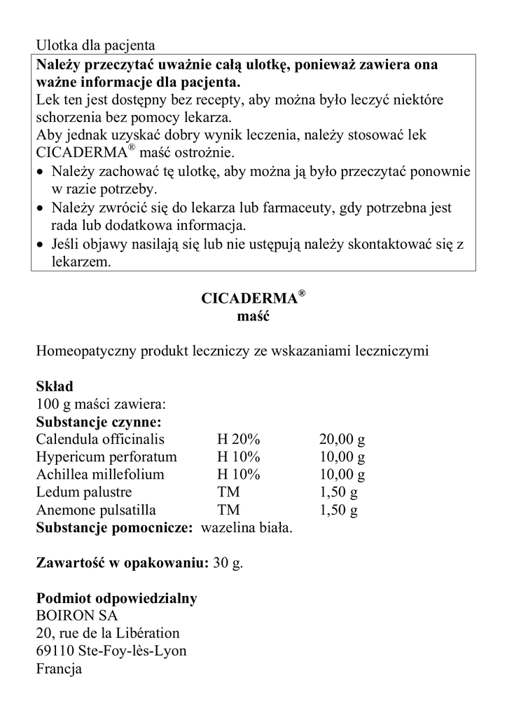 Ulotka dla pacjenta Należy przeczytać uważnie całą ulotkę, ponieważ zawiera ona ważne informacje dla pacjenta. Lek ten jest dostępny bez recepty, aby można było leczyć niektóre schorzenia bez pomocy lekarza. Aby jednak uzyskać dobry wynik leczenia, należy stosować lek CICADERMA® maść ostrożnie. • Należy zachować tę ulotkę, aby można ją było przeczytać ponownie w razie potrzeby. • Należy zwrócić się do lekarza lub farmaceuty, gdy potrzebna jest rada lub dodatkowa informacja. • Jeśli objawy nasilają się lub nie ustępują należy skontaktować się z lekarzem. CICADERMA® maść Homeopatyczny produkt leczniczy ze wskazaniami leczniczymi Skład 100 g maści zawiera: Substancje czynne: Calendula officinalis H 20% Hypericum perforatum H 10% Achillea millefolium H 10% Ledum palustre TM Anemone pulsatilla TM Substancje pomocnicze: wazelina biała. Zawartość w opakowaniu: 30 g. Podmiot odpowiedzialny BOIRON SA 20, rue de la Libération 69110 Ste-Foy-lès-Lyon Francja 20,00 g 10,00 g 10,00 g 1,50 g 1,50 g Wytwórca BOIRON SA 2 avenue de l’Ouest Lyonnais 69510 Messimy Francja Spis treści ulotki: 1.Co to jest lek CICADERMA® maść i w jakim celu się go stosuje? 2.Informacje ważne przed zastosowaniem leku CICADERMA® maść. 3.Jak stosować lek CICADERMA® maść? 4.Możliwe działania niepożądane. 5.Jak przechowywać lek CICADERMA® maść? 6.Inne informacje. 1.Co to jest lek CICADERMA® maść i w jakim celu się go stosuje? CICADERMA®, maść jest lekiem o działaniu przyspieszającym gojenie i łagodnie przeciwbólowym. Wskazania: niewielkie powierzchniowe uszkodzenia skóry: drobne skaleczenia, pęknięcia, spierzchnięcia skóry. Podrażnienia skóry. 2.Informacje ważne przed zastosowaniem leku CICADERMA® maść. Kiedy nie stosować leku CICADERMA® maść ? Ostrożnie stosować maść u osób uczulonych na rośliny: nagietek (Calendula), krwawnik (Achillea millefolium), bagno (Ledum palustre), sasankę (Anemone pulsatilla) i dziurawiec (Hypericum perforatum). Nie stosować na otwarte rany i na duże powierzchnie ciała. Kiedy zachować szczególną ostrożność stosując lek ® CICADERMA maść? Unikać ekspozycji na słońce miejsc posmarowanych maścią CICADERMA®. Ze względu na obecność wyciągu z dziurawca (Hypericum) może wystąpić uczulenie na działanie promieni słonecznych. Przed zastosowaniem leku u dzieci poniżej 6 roku życia konieczna jest konsultacja z lekarzem. Stosowanie leku CICADERMA® maść z innymi lekami Należy poinformować lekarza o wszystkich przyjmowanych lekach, również tych, które wydawane są bez recepty. Stosowanie leku CICADERMA® maść z jedzeniem i piciem Brak specjalnych wymagań. Ciąża i karmienie piersią Brak wystarczających danych. Przed zastosowaniem leku należy skonsultować się z lekarzem. Prowadzenie pojazdów i obsługa maszyn Nie dotyczy. Ważne informacje o niektórych składnikach leku CICADERMA® maść Nie dotyczy. 3.Jak stosować lek CICADERMA® maść? Stosować na skórę. W przypadku wątpliwości należy skontaktować się z lekarzem lub farmaceutą. Zazwyczaj stosowane dawkowanie leku CICADERMA® maść to: Dorośli i dzieci powyżej 6 roku życia: oczyszczone miejsce smarować maścią 1-2 razy dziennie. Dzieci poniżej 6 roku życia: wg wskazań lekarza. Jeżeli po kilku dniach nie następuje poprawa, pomimo stosowania maści, należy zasięgnąć porady lekarza. Zastosowanie większej niż zalecana ilości leku CICADERMA® maść: Należy skonsultować się z lekarzem lub farmaceutą. Pominięcie zastosowania leku CICADERMA® maść Nie należy stosować dawki podwójnej w celu uzupełnienia pominiętej dawki. Przerwanie stosowania leku CICADERMA® maść Należy skonsultować się z lekarzem lub farmaceutą. W razie wątpliwości związanych ze stosowaniem leku należy zwrócić się do lekarza lub farmaceuty. 4.Możliwe działania niepożądane. Jak każdy lek, CICADERMA® maść, może powodować działania niepożądane, chociaż nie u każdego one wystąpią. Jeśli wystąpią jakiekolwiek objawy niepożądane, należy zaprzestać stosowania leku i powiadomić lekarza lub farmaceutę. 5.Jak przechowywać lek CICADERMA® maść? Przechowywać w temperaturze nie wyższej niż 25oC. Przechowywać w miejscu niedostępnym i niewidocznym dla dzieci. Nie stosować leku CICADERMA® maść po upływie terminu ważności umieszczonego na kartoniku. Termin ważności oznacza ostatni dzień danego miesiąca. 6.Inne informacje. W celu uzyskania bardziej szczegółowych informacji należy zwrócić się do przedstawiciela podmiotu odpowiedzialnego w Polsce: Boiron Sp. z o.o. ul. Raszyńska 13 05-500 Piaseczno Tel: 022/702 66 70 Fax: 022/702 66 71 e-mail: [email protected] Data zatwierdzenia ulotki: 08/2009