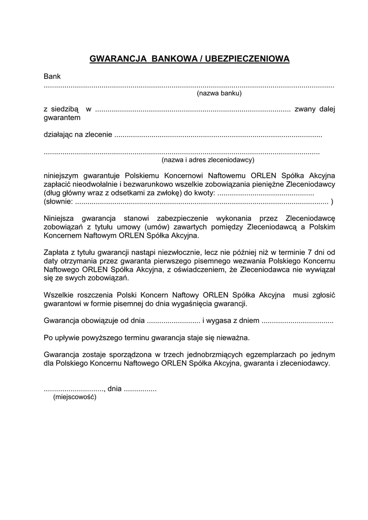 GWARANCJA BANKOWA / UBEZPIECZENIOWA Bank ............................................................................................................................................. (nazwa banku) z siedzibą w ............................................................................................... zwany dalej gwarantem działając na zlecenie ..................................................................................................... ...................................................................................................................................... (nazwa i adres zleceniodawcy) niniejszym gwarantuje Polskiemu Koncernowi Naftowemu ORLEN Spółka Akcyjna zapłacić nieodwołalnie i bezwarunkowo wszelkie zobowiązania pienięŜne Zleceniodawcy (dług główny wraz z odsetkami za zwłokę) do kwoty: ............................................... (słownie: ........................................................................................................................... ) Niniejsza gwarancja stanowi zabezpieczenie wykonania przez Zleceniodawcę zobowiązań z tytułu umowy (umów) zawartych pomiędzy Zleceniodawcą a Polskim Koncernem Naftowym ORLEN Spółka Akcyjna. Zapłata z tytułu gwarancji nastąpi niezwłocznie, lecz nie później niŜ w terminie 7 dni od daty otrzymania przez gwaranta pierwszego pisemnego wezwania Polskiego Koncernu Naftowego ORLEN Spółka Akcyjna, z oświadczeniem, Ŝe Zleceniodawca nie wywiązał się ze swych zobowiązań. Wszelkie roszczenia Polski Koncern Naftowy ORLEN Spółka Akcyjna gwarantowi w formie pisemnej do dnia wygaśnięcia gwarancji. musi zgłosić Gwarancja obowiązuje od dnia .......................... i wygasa z dniem ................................... Po upływie powyŜszego terminu gwarancja staje się niewaŜna. Gwarancja zostaje sporządzona w trzech jednobrzmiących egzemplarzach po jednym dla Polskiego Koncernu Naftowego ORLEN Spółka Akcyjna, gwaranta i zleceniodawcy. ............................., dnia ................ (miejscowość)