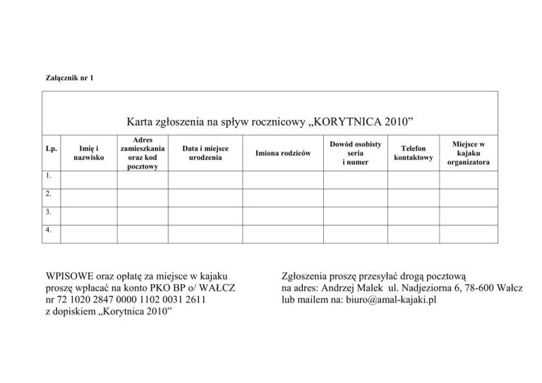 Załącznik nr 1 Karta zgłoszenia na spływ rocznicowy „KORYTNICA 2010” Lp. Imię i nazwisko Adres zamieszkania oraz kod pocztowy Data i miejsce urodzenia Imiona rodziców Dowód osobisty seria i numer Telefon kontaktowy Miejsce w kajaku organizatora 1. 2. 3. 4. WPISOWE oraz opłatę za miejsce w kajaku proszę wpłacać na konto PKO BP o/ WAŁCZ nr 72 1020 2847 0000 1102 0031 2611 z dopiskiem „Korytnica 2010” Zgłoszenia proszę przesyłać drogą pocztową na adres: Andrzej Malek ul. Nadjeziorna 6, 78-600 Wałcz lub mailem na: [email protected]