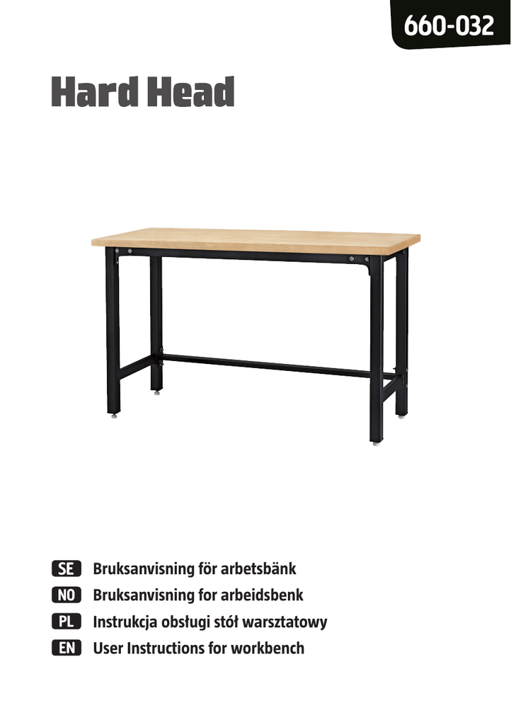 660-032 Bruksanvisning för arbetsbänk Bruksanvisning for arbeidsbenk Instrukcja obsługi stół warsztatowy User Instructions for workbench SE - NO - PL - EN - Bruksanvisning i original Bruksanvisning i original Instrukcja obsługi w oryginale Operating instructions in original Date of production: 2014-02-18 © Jula AB 1 2 3 4 Rätten till ändringar förbehålles. Vid eventuella problem, kontakta vår serviceavdelning på telefon 0200-88 55 88. Jula AB, Box 363, 532 24 SKARA www.jula.se Med forbehold om endringer. Ved eventuelle problemer kan du kontakte vår serviceavdeling på telefon 67 90 01 34. Jula Norge AS, Solheimsveien 6–8, 1471 LØRENSKOG www.jula.no Z zastrzeżeniem prawa do zmian. W razie ewentualnych problemów skontaktuj się telefonicznie z naszym działem obsługi klienta pod numerem: 801 600 500. Jula Poland Sp. z o.o., ul. Malborska 49, 03-286 Warszawa, Polska www.jula.pl Jula reserves the right to make changes. In the event of problems, please contact our service department. www.jula.com