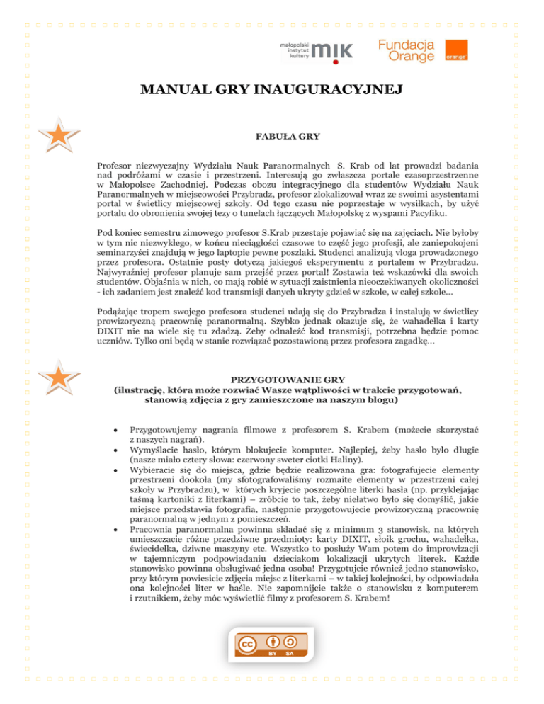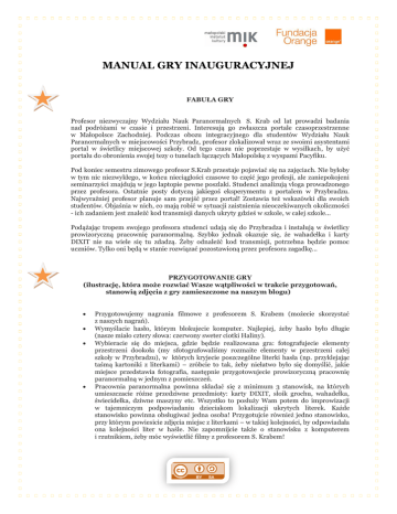 MANUAL GRY INAUGURACYJNEJ FABUŁA GRY Profesor niezwyczajny Wydziału Nauk Paranormalnych S. Krab od lat prowadzi badania nad podró ami w czasie i przestrzeni. Interesują go zwłaszcza portale czasoprzestrzenne w Małopolsce Zachodniej. Podczas obozu integracyjnego dla studentów Wydziału Nauk Paranormalnych w miejscowości Przybradz, profesor zlokalizował wraz ze swoimi asystentami portal w świetlicy miejscowej szkoły. Od tego czasu nie poprzestaje w wysiłkach, by u yć portalu do obronienia swojej tezy o tunelach łączących Małopolskę z wyspami Pacyfiku. Pod koniec semestru zimowego profesor S.Krab przestaje pojawiać się na zajęciach. Nie byłoby w tym nic niezwykłego, w końcu nieciągłości czasowe to część jego profesji, ale zaniepokojeni seminarzyści znajdują w jego laptopie pewne poszlaki. Studenci analizują vloga prowadzonego przez profesora. Ostatnie posty dotyczą jakiegoś eksperymentu z portalem w Przybradzu. Najwyra niej profesor planuje sam przejść przez portal! Zostawia te wskazówki dla swoich studentów. Objaśnia w nich, co mają robić w sytuacji zaistnienia nieoczekiwanych okoliczności - ich zadaniem jest znale ć kod transmisji danych ukryty gdzieś w szkole, w całej szkole... Podą ając tropem swojego profesora studenci udają się do Przybradza i instalują w świetlicy prowizoryczną pracownię paranormalną. Szybko jednak okazuje się, e wahadełka i karty DIXIT nie na wiele się tu zdadzą. eby odnale ć kod transmisji, potrzebna będzie pomoc uczniów. Tylko oni będą w stanie rozwiązać pozostawioną przez profesora zagadkę... PRZYGOTOWANIE GRY (ilustrację, która może rozwiać Wasze wątpliwości w trakcie przygotowa , stanowią zdjęcia z gry zamieszczone na naszym blogu) Przygotowujemy nagrania filmowe z profesorem S. Krabem (mo ecie skorzystać z naszych nagrań). Wymyślacie hasło, którym blokujecie komputer. Najlepiej, eby hasło było długie (nasze miało cztery słowa: czerwony sweter ciotki Haliny). Wybieracie się do miejsca, gdzie będzie realizowana gra: fotografujecie elementy przestrzeni dookoła (my sfotografowaliśmy rozmaite elementy w przestrzeni całej szkoły w Przybradzu), w których kryjecie poszczególne literki hasła (np. przyklejając taśmą kartoniki z literkami) – zróbcie to tak, eby niełatwo było się domyślić, jakie miejsce przedstawia fotografia, następnie przygotowujecie prowizoryczną pracownię paranormalną w jednym z pomieszczeń. Pracownia paranormalna powinna składać się z minimum 3 stanowisk, na których umieszczacie ró ne przedziwne przedmioty: karty DIXIT, słoik grochu, wahadełka, świecidełka, dziwne maszyny etc. Wszystko to posłu y Wam potem do improwizacji w tajemniczym podpowiadaniu dzieciakom lokalizacji ukrytych literek. Ka de stanowisko powinna obsługiwać jedna osoba! Przygotujcie równie jedno stanowisko, przy którym powiesicie zdjęcia miejsc z literkami – w takiej kolejności, by odpowiadała ona kolejności liter w haśle. Nie zapomnijcie tak e o stanowisku z komputerem i rzutnikiem, eby móc wyświetlić filmy z profesorem S. Krabem! Zdjęcia miejsc nale y wydrukować w dwóch egzemplarzach – jedna kopia zawiśnie na stanowisku z nierozszyfrowanym hasłem w kolejności takiej, jak powinny występować litery w haśle, drugą kopię chowacie do specjalnych kopert dla uczestników gry. Kopert powinno być tyle, ile grup uczestników przewidujecie. W ka dej kopercie chowacie kilka fotografii. PRZEBIEG GRY Realizatorzy gry pojawiają się w szkole jako studenci WNP. Opowiadają uczniom szkoły, co stało się z ich profesorem. Pokazują 2 nagrania z vloga profesora (nagrania dostępne na naszym blogu). Następnie proszą uczniów, by pomogli im znale ć ukryty w szkole kod do komputera profesora – tylko dzięki niemu studenci mogą obejrzeć trzecią najwa niejszą wiadomość vlogową od profesora, która pomo e rozwikłać zagadkę jego zniknięcia. Uczniowie przystępują do gry podzieleni na grupy 5-7 osobowe. Ka da grupa ma swojego opiekuna - jednego ze studentów WNP. Zadaniem uczestników jest odnale ć tajny kod transmisji danych. Kod transmisji został zaszyfrowany przy pomocy zdjęć przedstawiających ro ne miejsca w szkole. W ka dym z tych miejsc ukryta jest jedna litera kodu. Po odnalezieniu liter i umieszczeniu ich w kolejności zgodnej z układem zdjęć, będzie mo na odczytać kod. Studenci rozdają grupom po jednym zdjęciu. Po odnalezieniu miejsc na nich przestawionych, uczniowie muszą znale ć ukryte w tych miejscach fragmenty kodu – karteczki z literami hasła. Po odnalezieniu przez grupę litery w miejscu z pierwszego zdjęcia, opiekun grupy daje uczniów kolejne zdjęcie – a do wyczerpania fotografii w kopercie grupy. W przypadku, kiedy grupa ma trudności z odnalezieniem miejsca przedstawionego na zdjęciu, opiekun mo e udzielić im tajemniczej podpowiedzi. ROLE REALIZATORÓW W TRAKCIE GRY Seminarzyści profesora S. Kraba nale ą do najzdolniejszych słuchaczy WNP. Przykładowo: D astina – specjalizuje się w snach proroczych. Jej ulubiony przyrząd to wahadło, potrafi nim wykrywać fluktuacje aury na powierzchni portali. Portal w Przybradzu bada oznaczając zmąconą aurę figurkami urawi origami (nauczyła ją tego babcia - czarownica). Janek – typ intelektualisty ścisłowca. Na egzamin wstępny do WNP przygotowywał się z ksią ek o górnictwie węglowym. Komisji zaprezentował paproć wyhodowaną z bryły węgla metodą zwrotnego biegu czasu (czym ujął panie z dziekanatu). W Przybradzu prowadzi medytacje "na chodzonego" i próbuje odtworzyć kształt portalu przy pomocy karteczek postit. Olga – najbardziej tajemnicza spośród seminarzystów. Nie wiele wiadomo o jej talentach, jednocześnie to w niej profesor S. Krab pokładał największe nadzieje. Do badania portalu wykorzystuje karty DIXIT, jednak plotka wydziałowa głosi, e to tylko przykrywka dla jej aktywności mediumicznej... INFORMACJE DLA UCZESTNIK