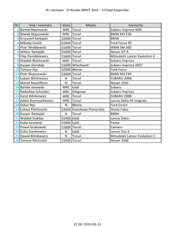 Nr startowe - IV Runda ORMT 2015 - 12 Rajd Kopernika Nr 1 2 3 4 5 6 7 8 9 10 11 12 13 14 15 16 17 18 19 20 21 22 23 24 25 26 Imię i nazwisko Bartek Blachowski Marek Słupczewski Krzysztof Świtajski Mikołaj Cieślik Piotr Wróblewski Wiktor Świtajski Filip Ziembikiewicz Waldek Blachowski Kacper Dorobek Tomasz Nyc Piotr Słupczewski Łukasz Bilinkiewicz Marek Rauchfleisz Bartek Janowski Radosław Schenker Karol Bilinkiewicz Adam Rzymyszkiewicz Oskar Nyc Łukasz Piórkowski Kacper Świtajski Waldek Dubilas Kuba Janowski Paweł Grabowski Kuba Stankiewicz Dawid Bilinkiewicz Tomasz Michnicki klasa WRC WRC S2000 S1600 S1600 S1600 S1600 WRC S1600 S2000 S2000 N N WRC WRC WRC WRC N S2000 N S1600 S2000 S1600 N N S1600 Miasto Toruń Toruń Toruń Toruń Toruń Toruń Toruń Toruń Włocławek Błonie Toruń Toruń Toruń Łódź Głogowo Toruń Toruń Błonie Kowalewo Pomorskie Toruń Łódź Łódź Toruń Łódź Toruń Toruń 22:30 2015-05-12 karoseria Subaru Impreza WRC BMW M3 E30 BMW Ford Focua RS WMB 3M 30E Nissan GT-R Mitsubishi Lancer Evolution X Subaru Impreza Subaru Impreza 2007 Ford Focus BMW M3 E30 SUBARU 2008 Nissan 350Z Subaru Subaru Impreza SUBARU 2008 Lancia Delta HF Inegrale Ford Escort Skoda Fabia BMW Lancia Delta Fiesta Camaro Lancer Evo X Mitsubishi Lancer Evolution X Nissan 350Z