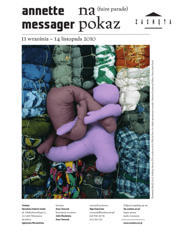 annette na messager pokaz (faire parade) Doomestic (detal), 2000, kolekcja Musée d’Art moderne de la Ville de Paris, fot. dzięki uprzejmości artystki i Marian Goodman Gallery, Nowy Jork–Paryż 11 września – 14 listopada 2010 Zachęta Narodowa Galeria Sztuki pl. Małachowskiego 3, 00-916 Warszawa dyrektor Agnieszka Morawińska kurator Anna Tomczak koncepcja wystawy Zofia Machnicka Anna Tomczak rzecznik prasowy Olga Gawerska [email protected] (22) 556 96 55 603 510 112 Zdjęcia znajdują się na ftp.zacheta.art.pl login: prasa hasło: wystawa www.zacheta.art.pl Wystawa prezentowana od 11 IX do 14 XI 2010 kurator Anna Tomczak koncepcja wystawy: Zofia Machnicka, Anna Tomczak Wystawa zorganizowana przy wsparciu Misterstwa Kultury i Dziedzictwa Narodowego oraz CULTURESFRANCE — Ministére des Affaires étrangères et européennes. Wystawę objął honorowym patronatem Jego Ekscelencja, Pan François Barry Delongchamps, Ambasador Republiki Francuskiej w Polsce i Minister Kultury i Dziedzictwa Narodowego Rzeczypospolitej Polskiej, Pan Bogdan Zdrojewski. sponsorzy galerii: Caparol, Peri, Lidex, netia, Radisson sponsorzy wernisażu: DeLonghi, Kenwood, Blikle, Freixenet patroni medialni: Gazeta Wyborcza, ams, TOK FM, Polityka, The Warsaw Voice, Stolica, Art & Business, Arteon, artinfo.pl Monograficzna wystawa Annette Messager w Zachęcie wypełniają powtarzalne czynności jak szydełkowanie czy jest pierwszą retrospektywą tej artystki w Polsce. W sześciu hafciarstwo. Annette demaskuje fikcję tych schematów salach galerii oraz w holu prezentujemy prace wybrane oraz funkcjonujący mit piękności — sygnalizuje, że kobieta z całego jej dorobku artystycznego. jest deprecjonowana przez swój obraz kulturowy. Zaproponowany przez artystkę francuski tytuł wystawy – Faire parade – trudno przełożyć na język W pracach z lat późniejszych artystka poświęca wiele uwagi cielesności. Fotografuje ciało, kawałkuje je, polski. Przez wzgląd na bogactwo znaczeń i odniesień pozbawia kontekstu i kulturowego znaczenia. Nawiązując kulturowych, nie można pozostać jedynie przy jego do tradycji wotywnej, eksponuje niewielkie fotografie dosłownym odpowiedniku „parada” bądź „paradowanie”. dłoni, stóp, oczu czy piersi, tworzy z nich hybrydyczne To cała gama znaczeń: rodzaj puszenia się, chwalenia stwory. W twórczości Messager ważny wątek stanowi możliwościami i dokonaniami, popisywanie się, jak ciało. Artystka bada cielesność, odkrywa symbolikę ciała podczas godów. Wystawa w Zachęcie to korowód dzieł i fizyczność determinującą sposób postrzegania świata z ponad czterdziestu lat pracy Messager. Artystka przez człowieka. Traktuje je niczym trofeum, nadaje mu podkreśla jednak, że to nie ona urządza pochód i to nie ona nowe znaczenia, korzystając z powierzchni ciała niczym jest jego uczestnikiem. To jej prace, same w sobie tworzą z płótna, aby w kolejnych instalacjach sięgnąć do jego kawalkadę, uchylają rąbka tajemnicy jej twórczości. Za wnętrza. każdym razem odsłaniają inny element. W ostatniej sali widz materialnie doświadczy obecności owej odsłony. Na Wykorzystuje zarówno jego dwuznaczności, sens, jakiego instalację Wietrzyk, a właściwie jej wersję zaadaptowaną nabiera słowo napisane kredką na ścianie lub wyhaftowane specjalnie na potrzeby niniejszej wystawy, składa się na skrawku materiału, a także magiczną moc, którą zyskuje ogromnej wielkości płachta materiału, półprzeźroczystego obsesyjnie powtarzane. Słowa u Messager są wskazówkami, czarnego jedwabiu, skrywającego w swych czeluściach tropami do pytań stawianych przez artystkę. Obecny stale formy znane widzowi z innych sal galerii. w jej dziełach dualizm demaskujący kulturowe klisze, ujawnia się przede wszystkim w warstwie wizualnej. Artystka na pokaz wybrała jedne z najważniejszych Messager podejmuje także grę ze słowem. swoich dzieł, na pokaz nie ułożyła ich w porządku Łącząc przedmioty i techniki kojarzone ze światem chronologicznym, na pokaz zaanektowała rzeźbę dziecięcym (kredki, wypychane zabawki o intensywnych, w holu Zachęty, na pokaz zmusiła widza do podjęcia żywych kolorach), Messager porusza jednocześnie nieprzerwanej podróży przez wystawę, na pokaz poważne tematy związane ze śmiercią czy erotyzmem. zwieńczyła ją monumentalnym spektaklem tworzonym „Oszustka? — to mi się dość podoba — mówi Messager. przez zasłonę animowaną światłem i powietrzem. Wszyscy artyści opowiadają bajki, koloryzują, kłamią, igrają dzieci z zabawkami”. z rzeczywistością, przywłaszczają ją sobie, tak jak to robią Droga twórcza Annette Messager rozpoczęła się pod koniec lat 60., kiedy świat sztuki zdominowany był przez mężczyzn, a Messager zmagała się z etykietką kobiety- się również słynne instalacje wykonane z tkanin Wśród prac prezentowanych w Polsce znajdą artystki. Obecnie jest jedną z najważniejszych artystek tworzących fantazyjne kształty. Wizualny język Messager francuskich. W 2005 roku jako pierwsza kobieta w historii charakteryzuje spójność i konsekwencja. Odważnie splata francuskiej sztuki pokazała swoją instalację w pawilonie ze sobą fotografie, rysunek, malarstwo, haft, materiał narodowym na 51. Międzynarodowej Wystawie Sztuki mimo że według niej samej są to zestawienia niemożliwe, w Wenecji. Praca Kasyno została wyróżniona Złotym Lwem. problematyczne i „brudne”. Na wystawie w Zachęcie artystka ujawni różne oblicza, Wystawie towarzyszy bogato ilustrowany katalog, znane z różnych etapów jej twórczości: Annette-kobiety będący pierwszą polską publikacją na temat twórczości praktycznej, Annette-oszustki, Annette-kolporterki czy Annette Messager. Widzowie znajdą w nim interesujący esej Annette–kolekcjonerki. Instalacje powstałe w pierwszej wybitnej badaczki twórczości artystki, Catherine Grenier, połowie lat 70. składaj