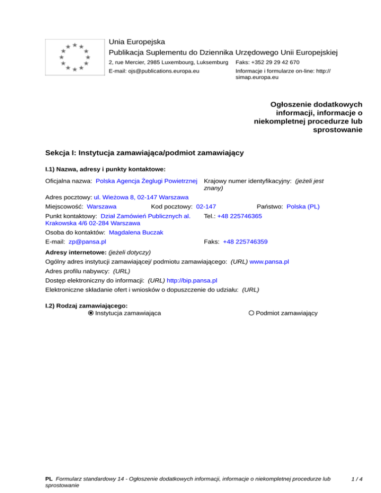 Unia Europejska Publikacja Suplementu do Dziennika Urzędowego Unii Europejskiej 2, rue Mercier, 2985 Luxembourg, Luksemburg Faks: +352 29 29 42 670 E-mail: [email protected] Informacje i formularze on-line: http:// simap.europa.eu Ogłoszenie dodatkowych informacji, informacje o niekompletnej procedurze lub sprostowanie Sekcja I: Instytucja zamawiająca/podmiot zamawiający I.1) Nazwa, adresy i punkty kontaktowe: Oficjalna nazwa: Polska Agencja Żeglugi Powietrznej Krajowy numer identyfikacyjny: (jeżeli jest znany) _____ Adres pocztowy: ul. Wieżowa 8, 02-147 Warszawa Miejscowość: Warszawa Kod pocztowy: 02-147 Punkt kontaktowy: Dział Zamówień Publicznych al. Krakowska 4/6 02-284 Warszawa Państwo: Polska (PL) Tel.: +48 225746365 Osoba do kontaktów: Magdalena Buczak E-mail: [email protected] Faks: +48 225746359 Adresy internetowe: (jeżeli dotyczy) Ogólny adres instytucji zamawiającej/ podmiotu zamawiającego: (URL) www.pansa.pl Adres profilu nabywcy: (URL) _____ Dostęp elektroniczny do informacji: (URL) http://bip.pansa.pl Elektroniczne składanie ofert i wniosków o dopuszczenie do udziału: (URL) _____ I.2) Rodzaj zamawiającego: Instytucja zamawiająca Podmiot zamawiający PL Formularz standardowy 14 - Ogłoszenie dodatkowych informacji, informacje o niekompletnej procedurze lub sprostowanie 1/4 Sekcja II: Przedmiot zamówienia II.1.1) Nazwa nadana zamówieniu: ŚWIADCZENIE USŁUG W OBSZARZE REKRUTACJI I SELEKCJI PRACOWNIKÓW NA POTRZEBY PAŻP II.1.2) Krótki opis zamówienia lub zakupu: (podano w pierwotnym ogłoszeniu) 1.Przedmiotem zamówienia jest świadczenie usług w obszarze rekrutacji i selekcji pracowników na potrzeby Polskiej Agencji Żeglugi Powietrznej w okresie od dnia podpisania umowy do 31.12.2014 roku. 2.Usługa rekrutacji ma na celu wyselekcjonowanie i przedstawienie Zamawiającemu osób spełniających wymagania określone przez Zamawiającego (na stanowiska inne niż Praktykant Ruchu Lotniczego). Usługa będzie dotyczyć ok. 60 osób przewidzianych do pracy w strukturze organizacyjnej PAŻP, z czego Zamawiający zleci Wykonawcy wykonanie usługi na min. dziesięć (10) osób. Pozostała ilość osób stanowi prawo opcji w rozumieniu przepisów ustawy Prawo zamówień publicznych. 3.Usługa rekrutacji i selekcji Kandydatów przewidzianych do pracy w strukturze organizacyjnej Zamawiającego polegać będzie na: 3.1.analizie rynku pracy i przygotowaniu kampanii ogłoszeniowej, 3.2.sporządzeniu bazy aplikacji oraz preselekcji Kandydatów zgodnie z wytycznymi określonymi w zamówieniu na wykonanie usługi rekrutacji i selekcji Kandydatów na dane stanowisko, 3.3.opracowaniu i wykonaniu pełnego procesu rekrutacji i selekcji dopasowanego do określonych stanowisk, 3.4.prowadzeniu bazy Kandydatów wraz z uzyskanymi wynikami w procesie selekcji, 3.5.analizie skuteczności poszczególnych narzędzi wykorzystywanych do pozyskiwania Kandydatów, 3.6.dopasowaniu odpowiedniego systemu raportowania w cyklach codziennych oraz tygodniowych, 3.7.przeprowadzaniu rozmów finalnych (poza siedzibą Zamawiającego) przy udziale przedstawicieli Zamawiającego, 3.8.przygotowaniu raportów indywidualnych oraz rekomendowaniu Kandydatów spełniających wymagania określone w zamówieniu na wykonanie usługi rekrutacji i selekcji Kandydatów na dane stanowisko II.1.3) Wspólny Słownik Zamówień (CPV) Główny przedmiot Słownik główny 79600000 Słownik uzupełniający (jeżeli dotyczy) PL Formularz standardowy 14 - Ogłoszenie dodatkowych informacji, informacje o niekompletnej procedurze lub sprostowanie 2/4 Sekcja IV: Procedura IV.1)Rodzaj procedury (podano w pierwotnym ogłoszeniu) Otwarta Ograniczona Ograniczona przyspieszona Negocjacyjna Negocjacyjna przyspieszona Dialog konkurencyjny Negocjacyjna z uprzednim ogłoszeniem Negocjacyjna bez uprzedniego ogłoszenia Negocjacyjna z publikacją ogłoszenia o zamówieniu Negocjacyjna bez publikacji ogłoszenia o zamówieniu Udzielenie zamówienia bez uprzedniej publikacji ogłoszenia o zamówieniu w Dzienniku Urzędowym Unii Europejskiej IV.2)Informacje administracyjne IV.2.1)Numer referencyjny: (podano w pierwotnym ogłoszeniu) AJZ-224-143/2012 IV.2.2)Dane referencyjne ogłoszenia w przypadku ogłoszeń przesłanych drogą elektroniczną: Pierwotne ogłoszenie przesłane przez eNotices TED eSender Login: ENOTICES_PAZP Dane referencyjne ogłoszenia: 2013-011574 rok i numer dokumentu IV.2.3)Ogłoszenie, którego dotyczy niniejsza publikacja: Numer ogłoszenia w Dz.U.: 2013/S 019-028586 z dnia: 26/01/2013 (dd/mm/rrrr) IV.2.4)Data wysłania pierwotnego ogłoszenia: 23/01/2013 (dd/mm/rrrr) PL Formularz standardowy 14 - Ogłoszenie dodatkowych informacji, informacje o niekompletnej procedurze lub sprostowanie 3/4 Sekcja VI: Informacje uzupełniające VI.1) Ogłoszenie dotyczy: Procedury niepełnej Sprostowania Informacji dodatkowych VI.2) Informacje na temat niepełnej procedury udzielenia zamówienia: Postępowanie o udzielenie zamówienia zostało przerwane Postępowanie o udzielenie zamówienia uznano za nieskuteczne Zamówienia nie udzielono Zamówienie może być przedmiotem ponownej publikacji VI.3) Informacje do poprawienia lub dodania : VI.3.1) Zmiana oryginalnej informacji podanej przez instytucję zamawiającą Publikacja w witrynie TED niezgodna z oryginalną informacją, przekazaną przez instytucję zamawiającą Oba przypadki VI.3.2) W ogłoszeniu pierwotnym W odpowiedniej dokumentacji przetargowej (więcej informacji w odpowiedniej dokumentacji przetargowej) W obu przypadkach (więcej informacji w odpowiedniej dokumentacji przetargowej) VI.3.3) Tekst, który należy poprawić w pierwotnym ogłoszeniu Miejsce, w którym znajduje się Zamiast: zmieniany tekst: VI.3.4) Daty, które należy poprawić w pierwotnym ogłoszeniu Miejsce, w którym znajdują się Zamiast: zmieniane daty: 11/03/2013 Godzina: 12:00 IV.3.8) Warunki otwarcia ofert (dd/mm/rrrr) Powinno być: Powinno być: 11/03/2013 Godzina: 12:30 (dd/mm/rrrr) VI.