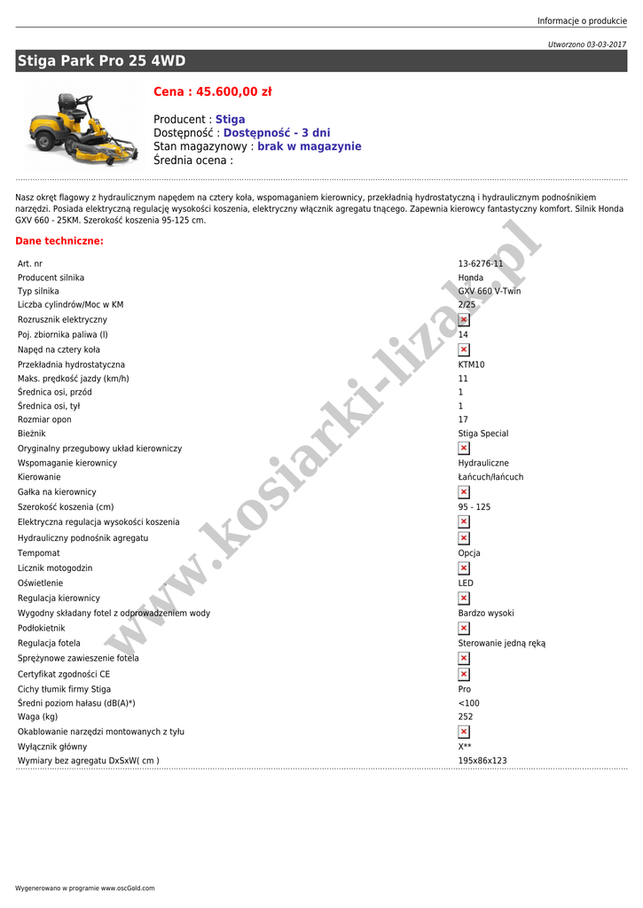 Informacje o produkcie Utworzono 03-03-2017 Stiga Park Pro 25 4WD Cena : 45.600,00 zł Producent : Stiga Dostępność : Dostępność - 3 dni Stan magazynowy : brak w magazynie Średnia ocena : Nasz okręt flagowy z hydraulicznym napędem na cztery koła, wspomaganiem kierownicy, przekładnią hydrostatyczną i hydraulicznym podnośnikiem narzędzi. Posiada elektryczną regulację wysokości koszenia, elektryczny włącznik agregatu tnącego. Zapewnia kierowcy fantastyczny komfort. Silnik Honda GXV 660 - 25KM. Szerokość koszenia 95-125 cm. .p l Dane techniczne: Art. nr 13-6276-11 Producent silnika Honda GXV 660 V-Twin iz ak Typ silnika Liczba cylindrów/Moc w KM 2/25 Rozrusznik elektryczny Poj. zbiornika paliwa (l) 14 Napęd na cztery koła Przekładnia hydrostatyczna KTM10 -l Maks. prędkość jazdy (km/h) Średnica osi, przód rk i Średnica osi, tył Rozmiar opon Bieżnik Oryginalny przegubowy układ kierowniczy ia Wspomaganie kierownicy Gałka na kierownicy Szerokość koszenia (cm) Hydrauliczny podnośnik agregatu Tempomat w Licznik motogodzin .k Elektryczna regulacja wysokości koszenia os Kierowanie Oświetlenie w Regulacja kierownicy Wygodny składany fotel z odprowadzeniem wody w Podłokietnik Regulacja fotela 11 1 1 17 Stiga Special Hydrauliczne Łańcuch/łańcuch 95 - 125 Opcja LED Bardzo wysoki Sterowanie jedną ręką Sprężynowe zawieszenie fotela Certyfikat zgodności CE Cichy tłumik firmy Stiga Pro Średni poziom hałasu (dB(A)*) <100 Waga (kg) 252 Okablowanie narzędzi montowanych z tyłu Wyłącznik główny X** Wymiary bez agregatu DxSxW( cm ) 195x86x123 Wygenerowano w programie www.oscGold.com