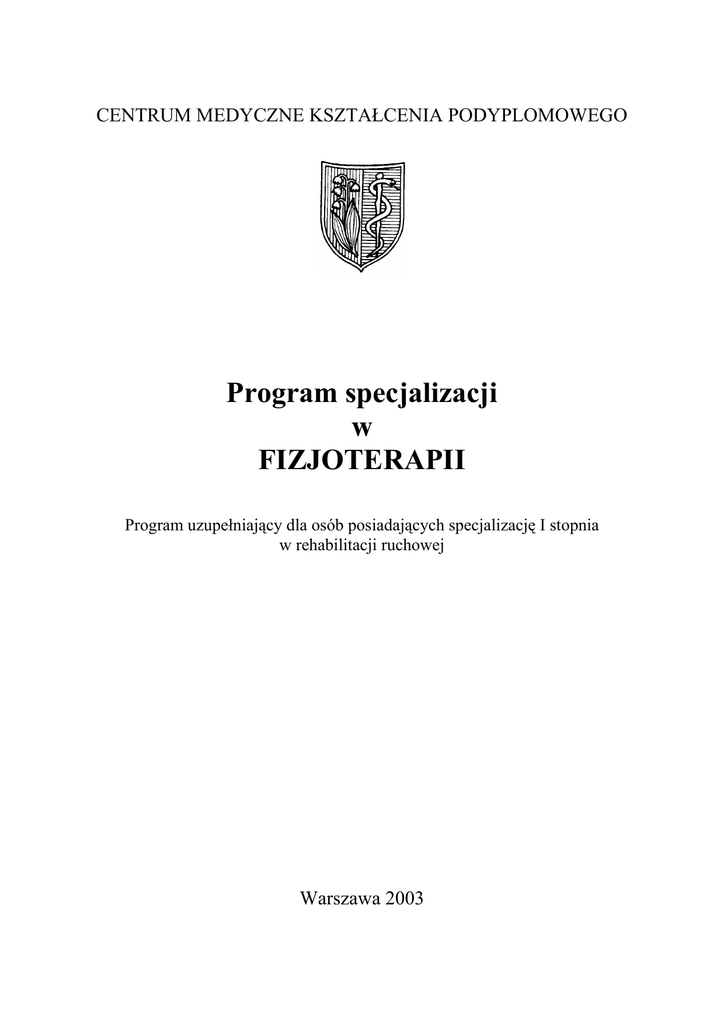 CENTRUM MEDYCZNE KSZTAŁCENIA PODYPLOMOWEGO Program specjalizacji w FIZJOTERAPII Program uzupełniający dla osób posiadających specjalizację I stopnia w rehabilitacji ruchowej Warszawa 2003 Program specjalizacji w fizjoterapii I. ZAŁOŻENIA ORGANIZACYJNO – PROGRAMOWE Specjalista w fizjoterapii jest bezpośrednio związany z ochroną zdrowia i współpracuje na zasadach partnerstwa zawodowego z lekarzami specjalistami: w zakresie rehabilitacji medycznej, balneologii i medycyny fizykalnej, medycyny sportowej i innymi specjalistami. Fizjoterapeuta wykonuje zawód medyczny, w bezpośrednim kontakcie z pacjentem, człowiekiem chorym lub niepełnosprawnym i w związku z tym jego wykształcenie i przygotowanie specjalistyczne musi spełniać najwyższe wymagania etyczne i zawodowe obowiązujące w ochronie zdrowia. A - Cel specjalizacji w fizjoterapii Celem specjalizacji w fizjoterapii jest przygotowanie do prowadzenia kompleksowego usprawniania leczniczego, a podstawowym zadaniem tych studiów jest pogłębianie wiedzy i umiejętności praktycznych, rozwijanie pożądanych cech osobowości, niezbędnych do prowadzenia kompleksowego postępowania fizjoterapeutycznego w odniesieniu do osób chorych przewlekle, niepełnosprawnych fizycznie i psychicznie, w celu przywrócenia im pełnej lub maksymalnie możliwej do osiągnięcia sprawności fizycznej i psychicznej, zdolności do pracy i czynnego udziału w życiu społecznym. Celem studiów specjalizacyjnych jest także nauczenie umiejętności niezbędnych do prowadzenia, tak istotnej ze społecznego punktu widzenia, terapii zajęciowej i sportu inwalidów. Konieczne jest również zaznajomienie z aspektami prawnymi w celu skutecznego kierowania procesami usprawniania. Fizjoterapeuta w toku studiów specjalizacyjnych powinien posiąść wiedzę niezbędną do prowadzenia działalności profilaktycznej, polegającej na kierowaniu i popularyzowaniu zachowań prozdrowotnych. Powinien być również przygotowany do pełnienia funkcji kierowniczych i nadzorujących w zakresie fizjoterapii B - Czas trwania specjalizacji Specjalizacja w zakresie fizjoterapii dla osób posiadających specjalizację I stopnia w rehabilitacji ruchowej - trwa 2 lata. Liczba godzin: Modułów w planie nauczania 363 godz. Staży kierunkowych 390 godz. Kursów obowiązkowych 336 godz. Łącznie: 1089 godz. C – Zakres wiedzy teoretycznej będącej przedmiotem specjalizacji W czasie trwania specjalizacji szczególnie istotne jest nabycie przez specjalizującego się fizjoterapeutę przedstawionej poniżej wiedzy: • Fizjologiczne podstawy fizjoterapii. • Patofizjologia układu krążenia, układu oddechowego, układu nerwowego, układu narządu ruchu i umiejętności oceny sprawności tych układów. • Teorie i zasady specjalistycznych metod kinezyterapeutycznych. • Umiejętność kierowania poradnią lub zakładem fizjoterapii (rehabilitacji). © CMKP 2003 2 Program specjalizacji w fizjoterapii • Zasady organizacji kompleksowego leczenia w chorobach przewlekłych w warunkach uzdrowiskowych. • Zasady organizacji kompleksowego usprawniania w środowisku - w domu chorego. • Teorie sportu inwalidzkiego. • Planowanie i prowadzenie usprawniania leczniczego w różnych jednostkach chorobowych z uwzględnieniem czynników fizykalnych, jako elementów przygotowania pacjenta do kinezyterapii i terapii zajęciowej. • Zastosowanie zaopatrzenia ortopedycznego, pomocy i usprawnień technicznych niezbędnych w toku postępowania fizjoterapeutycznego. • Zagadnienia psychologiczne występujące w procesie usprawniania leczniczego, zasady pedagogiki specjalnej. • Zagadnienia pedagogiczne występujące w procesie rehabilitacji, zasady pedagogiki specjalnej. • Umiejętność doboru form terapii zajęciowej. D – Wykaz umiejętności praktycznych będących przedmiotem specjalizacji W czasie studiów specjalizacyjnych osoba specjalizująca się w fizjoterapii powinna nabyć umiejętność: • przeprowadzania badań diagnostycznych umożliwiających i określających potrzebę i zakres: - kinezyterapii indywidualnej, - kinezyterapii ogólnie usprawniającej, - metod kinezyterapeutycznych, - terapii zajęciowej, • wykonywania czynności związanych z diagnostyką funkcjonalną układu ruchu, układu krążenia i układu oddechowego z uwzględnieniem praktycznego przeprowadzenia testów wysiłkowych wraz z wyznaczeniem optymalnych obciążeń treningowych, • wykonywania i zlecania zabiegów fizykoterapeutycznych i oceny reakcji organizmu pacjenta na wykonywany zabieg, • interpretacji zdjęć rtg kręgosłupa pod względem: czynności statycznych, dynamicznych, • prowadzenia treningu autogennego oraz neurolingwistycznego programowania pacjenta (NLP), • organizacji pracy zespołu rehabilitacyjnego, • organizacji działalności w zakresie ochrony zdrowia, znajomość przepisów prawnych w zakresie fizjoterapii, • posługiwania się nowoczesnymi systemami informatycznymi, gromadzenia i przetwarzania danych, • prowadzenia badań naukowych, • samokształcenia oraz kształcenia fizjoterapeutów jak i innych członków zespołu rehabilitacyjnego, • dobierania i dopasowywanie odpowiedniego zaopatrzenia ortopedycznego. © CMKP 2003 3 Program specjalizacji w fizjoterapii E – sposób organizacji specjalizacji Kształcenie specjalizacyjne prowadzone jest zgodnie z programem specjalizacji i kończy się egzaminem. Kierownik specjalizacji na podstawie programu przygotowuje indywidualny plan specjalizacji określający warunki i przebieg specjalizacji i zapewniający opanowanie wiadomości i nabycie umiejętności praktycznych określonych w programie specjalizacji. Kształcenie specjalizacyjne odbywa się poprzez zajęcia w ramach modułów, uczestniczenie w kursach specjalizacyjnych, udział w stażach w wytypowanych instytucjach, samokształ-cenie drogą studiowania piśmiennictwa oraz nabywanie doświadczenia w wyniku realizacji zadań praktycznych. Postępo