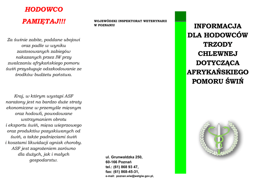 HODOWCO PAMIĘTAJ!!! WOJEWÓDZKI INSPEKTORAT WETERYNARII W POZNANIU Za świnie zabite, poddane ubojowi oraz padłe w wyniku zastosowanych zabiegów nakazanych przez IW przy zwalczaniu afrykańskiego pomoru świń przysługuje odszkodowanie ze środków budżetu państwa. Kraj, w którym wystąpi ASF narażony jest na bardzo duże straty ekonomiczne w przemyśle mięsnym oraz hodowli, powodowane wstrzymaniem obrotu i eksportu świń, mięsa wieprzowego oraz produktów pozyskiwanych od świń, a także padnięciami świń i kosztami likwidacji ognisk choroby. ASF jest zagrożeniem zarówno dla dużych, jak i małych gospodarstw. ul. Grunwaldzka 250, 60-166 Poznań tel.: (61) 868 93 47, fax: (61) 868-45-31, e-mail: [email protected], INFORMACJA DLA HODOWCÓW TRZODY CHLEWNEJ DOTYCZĄCA AFRYKAŃSKIEGO POMORU ŚWIŃ Co to jest afrykański pomór świń? Afrykański pomór świń (ASF) to szybko szerząca się choroba wirusowa, na którą podatne są świnie domowe oraz dziki. Ludzie nie są wrażliwi na zakażenie wirusem ASF w związku, z czym choroba ta nie stwarza zagrożenia dla ich zdrowia i życia. Jak rozpoznać afrykański pomór świń? U świń mogą pojawić się następujące objawy: wysoka gorączka, z tym że gorączkujące świnie mają początkowo zachowany apetyt i zachowują się normalnie; liczne padnięcia świń w każdym wieku; Najczęściej wprowadzenie wirusa ASF do kraju wolnego od choroby następuje poprzez przemieszczanie się dzików, transport mięsa, produktów mięsnych, odpadków kuchennych i poubojowych, pochodzących od chorych świń i dzików. Najczęstszą przyczyną zakażenia świń jest bezpośredni kontakt ze zwierzętami zakażonymi lub zakażonymi odpadkami żywnościowymi. W przypadku terenów o wysokim zagęszczeniu gospodarstw utrzymujących świnie, rozprzestrzenianie się wirusa między gospodarstwami jest łatwe, za pośrednictwem osób odwiedzających gospodarstwo lub zakażonej paszy, wody, czy narzędzi. Afrykański pomór świń występuje w Rosji, na Litwie, Łotwie i Estonii, Ukrainie oraz na terenie Polski w woj. podlaskim. Wszystkie osoby utrzymujące świnie na terenie kraju powinny poprzez swoje działania zapobiegać rozprzestrzenianiu się choroby. sinica skóry uszu, brzucha i boków drobne, lecz liczne wybroczyny w skórze; ciała, duszność, pienisty lub krwisty wypływ z nosa; biegunka, często z domieszką krwi. Jak zapobiegać afrykańskiemu pomorowi świń? Ograniczyć dostęp osobom postronnym do pomieszczeń lub miejsc, w których znajdują się zwierzęta, w szczególności osobom, które w ostatnim czasie przebywały na terytorium krajów gdzie wystąpiła ASF lub brały udział w polowaniach na zwierzęta łowne; Zabezpieczyć swoje gospodarstwo przed przedostaniem się dzików, zabezpieczyć paszę przed dostępem zwierząt wolno żyjących; Stosować w gospodarstwie procedury sanitarne utrzymywać gospodarstwo w czystości, dbać o czystość sprzętu używanego w gospodarstwie, stosować odkażanie bieżące, używać osobnego obuwia, odzieży ochronnej oraz narzędzi do obsługi zwierząt: Nie wprowadzać do gospodarstwa zwierząt niewiadomego pochodzenia - bez świadectwa zdrowia lub wykazujących jakiekolwiek objawy osłabienia; Nie skarmiać zwierząt odpadkami żywności. Podejrzewasz wystąpienie afrykańskiego pomoru świń? Posiadacz zwierząt, który zauważył objawy nasuwające podejrzenie choroby zakaźnej, jest zobowiązany do natychmiastowego zgłoszenia podejrzenia choroby (obowiązek ustawowy obwarowany sankcją karną*). Zgłoszenie należy przekazać do powiatowego lekarza weterynarii bezpośrednio, albo za pośrednictwem lekarza weterynarii opiekującego się gospodarstwem lub właściwego miejscowo organu samorządu terytorialnego (wójta, burmistrza). Zgłosiłeś podejrzenie afrykańskiego pomoru - co dalej? Po dokonaniu zgłoszenia - do czasu przybycia urzędowego lekarza weterynarii – hodowca zwierząt zobowiązany jest do: izolacji i strzeżenia w gospodarstwie wszystkich przebywających tam zwierząt; wstrzymania się od wywożenia, wynoszenia i zbywania produktów z gospodarstwa, w szczególności mięsa, zwłok zwierzęcych, środków żywienia zwierząt, wody, ściółki, nawozów naturalnych; uniemożliwienia dostępu osobom postronnym do pomieszczeń lub miejsc, w których znajdują się zwierzęta podejrzane o zakażenie lub chorobę. * zgodnie z ustawą z dnia 11 marca 2004 roku o ochronie zdrowia zwierząt oraz zwalczaniu chorób zakaźnych zwierząt (Dz. U. z 2008 roku Nr 213 poz. 1342 ze zm.)