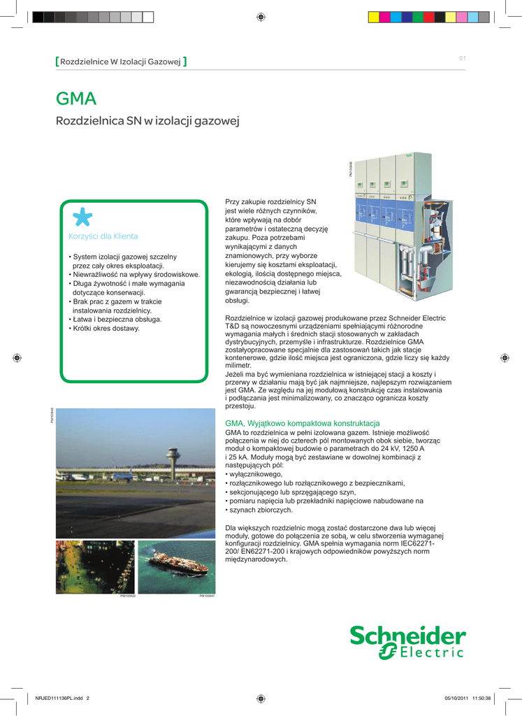 01 Rozdzielnice W Izolacji Gazowej GMA PM100948 Rozdzielnica SN w izolacji gazowej Korzyści dla Klienta PM100946 • System izolacji gazowej szczelny przez cały okres eksploatacji. • Niewrażliwość na wpływy środowiskowe. • Długa żywotność i małe wymagania dotyczące konserwacji. • Brak prac z gazem w trakcie instalowania rozdzielnicy. • Łatwa i bezpieczna obsługa. • Krótki okres dostawy. Przy zakupie rozdzielnicy SN jest wiele różnych czynników, które wpływają na dobór parametrów i ostateczną decyzję zakupu. Poza potrzebami wynikającymi z danych znamionowych, przy wyborze kierujemy się kosztami eksploatacji, ekologią, ilością dostępnego miejsca, niezawodnością działania lub gwarancją bezpiecznej i łatwej obsługi. Rozdzielnice w izolacji gazowej produkowane przez Schneider Electric T&D są nowoczesnymi urządzeniami spełniającymi różnorodne wymagania małych i średnich stacji stosowanych w zakładach dystrybucyjnych, przemyśle i infrastrukturze. Rozdzielnice GMA zostałyopracowane specjalnie dla zastosowań takich jak stacje kontenerowe, gdzie ilość miejsca jest ograniczona, gdzie liczy się każdy milimetr. Jeżeli ma być wymieniana rozdzielnica w istniejącej stacji a koszty i przerwy w działaniu mają być jak najmniejsze, najlepszym rozwiązaniem jest GMA. Ze względu na jej modułową konstrukcję czas instalowania i podłączania jest minimalizowany, co znacząco ogranicza koszty przestoju. GMA, Wyjątkowo kompaktowa konstruktacja GMA to rozdzielnica w pełni izolowana gazem. Istnieje możliwość połączenia w niej do czterech pól montowanych obok siebie, tworząc moduł o kompaktowej budowie o parametrach do 24 kV, 1250 A i 25 kA. Moduły mogą być zestawiane w dowolnej kombinacji z następujących pól: • wyłącznikowego, • rozłącznikowego lub rozłącznikowego z bezpiecznikami, • sekcjonującego lub sprzęgającego szyn, • pomiaru napięcia lub przekładniki napięciowe nabudowane na • szynach zbiorczych. Dla większych rozdzielnic mogą zostać dostarczone dwa lub więcej moduły, gotowe do połączenia ze sobą, w celu stworzenia wymaganej konfiguracji rozdzielnicy. GMA spełnia wymagania norm IEC62271200/ EN62271-200 i krajowych odpowiedników powyższych norm międzynarodowych. PM100922 NRJED111136PL.indd 2 PM100947 05/10/2011 11:50:38 02 GMA Wysoki Poziom Niezawodności I Bezpieczeństwa Łatwość Instalacji GMA została wykonana w sposób umożliwiający instalowanie w miejscu pracy tak szybkie, łatwe i bezpieczne jak to tylko jest możliwe. Zastosowana koncepcja wielofunkcyjności, połączona z możliwością zestawiania do czterech w pełni przetestowanych pól w jednym module minimalizuje ilość robót instalacyjnych oraz ilość połączeń wykonywanych między szynami przy instalowaniu rozdzielnicy. Jeżeli rozdzielnica jest złożona z dwóch lub więcej modułów, wykonanie połączenia szyn zbiorczych jest proste, dzięki wykorzystaniu specjalnego przedziału sprzęgającego, nie wymagającego prac z gazem. Możliwe jest dokonywanie w przyszłości rozbudowy rozdzielnicy na jej obu końcach (opcja). Przestronny przedział kablowy pozwala na łatwy dostęp przy wykonywaniu podłączeń kabli a ilość miejsca wystarcza na podłączenie do czterech kabli na fazę. PM100949 PM100948 Maksymalna niezawodność oraz bezpieczeństwo obsługi są zapewniane poprzez niezależność od wpływu środowiska, poprzez wypełnione gazem, odporne na korozję przedziały rozdzielnicy wykonane ze stali Cr-Ni oraz systemy ciągłych blokad. Przedziały SN rozdzielnicy GMA zostały zaprojektowane jako hermetyczne układy ciśnieniowe zgodne z normą IEC62271-1. W czasie całego okresu użytkowania rozdzielnicy nie występuje konieczność uzupełniania gazu izolacyjnego. PM100950 Rozdzielnice W Izolacji Gazowej WYŁĄCZNIK ROZŁĄCZNIK Z BEZPIECZNIKAMI 1 - Wskaźnik położenia odłącznika. 2 - Wskaźnik położenia wyłącznika. 3 - Przycisk “wyłącz” wyłącznika. 4 - Przycisk “włącz” wyłącznika. 5 - Wskaźnik położenia uziemnika. Prostota Działania I Jednoznaczność Wskazań Działanie GMA jest proste i bezpieczne, wskaźniki stanów pracy zespołów są jednoznaczne a napędy niezawodne: • schemat synoptyczny zawierający mechaniczne wskaźniki położeń i elementy sterowania lokalnego, • system blokad zabezpieczający przed niewłaściwą obsługą, • układy wykrywania napięcia lub system wskaźników napięciowych, do weryfikacji stanu izolacji oraz zgodności faz. NRJED111136PL.indd 3 GMA kompletna, przetestowana, zmontowana w fabryce, system ‘plug and play’ ‘gotowa do montażu’ 05/10/2011 11:50:39 Rozdzielnice W Izolacji Gazowej PM100951 Pole TYP C WYPOSAŻENIE Rozłącznik 03 GMA WYMIARY (mm) MODUŁ W G S ZAWIERA 2100 800 450 Uziemnik 1-4 pól Optymalne Rozwiązanie Przełączanie W Próżni Połączone Z Izolacją Gazową GMA łączy zalety izolacji gazowej z technologią przełączania w próżni: T1 Rozłącznik 2100 800 450 1-2 pól Bezpieczniki PM100953 Uziemnik CB6 Rozłącznik 2100 800 450 1-4 Wyłącznik (630 A) pól PM100953 Uziemnik CB6 Rozłącznik 2100 800 600 PM100955 Uziemnik CB6 Odłącznik 2100 860 600 Wyłącznik (630 A) Uziemnik Przekładniki napięciowe wtykowe, PM100956 odłączalne CB12 Odłącznik 1-3 pól Wyłącznik (630 A) 2100 1000 600 2100 1000 600 zbiorczych – są umieszczone w hermetycznie zamkniętych metalowych przedziałach, z izolacją gazową, niewrażliwych na wilgoć, czynniki korozyjne, pył, owady i małe zwierzęta. Wyłącznik próżniowy zapewnia niezawodne przełączanie prądów obciążeniowych i zwarciowych. W najnowszych konstrukcjach wprowadzono styki o ulepszonych własnościach, przy zastosowaniu sprawdzonej technologii wytwarzania, nie wymagające konserwacji przez cały okres eksploatacji. Połączenie wymienionych technologii umożliwia nam oferowanie efektywnych kosztowo i niezawodnych rozwiązań rozdzielnic SN