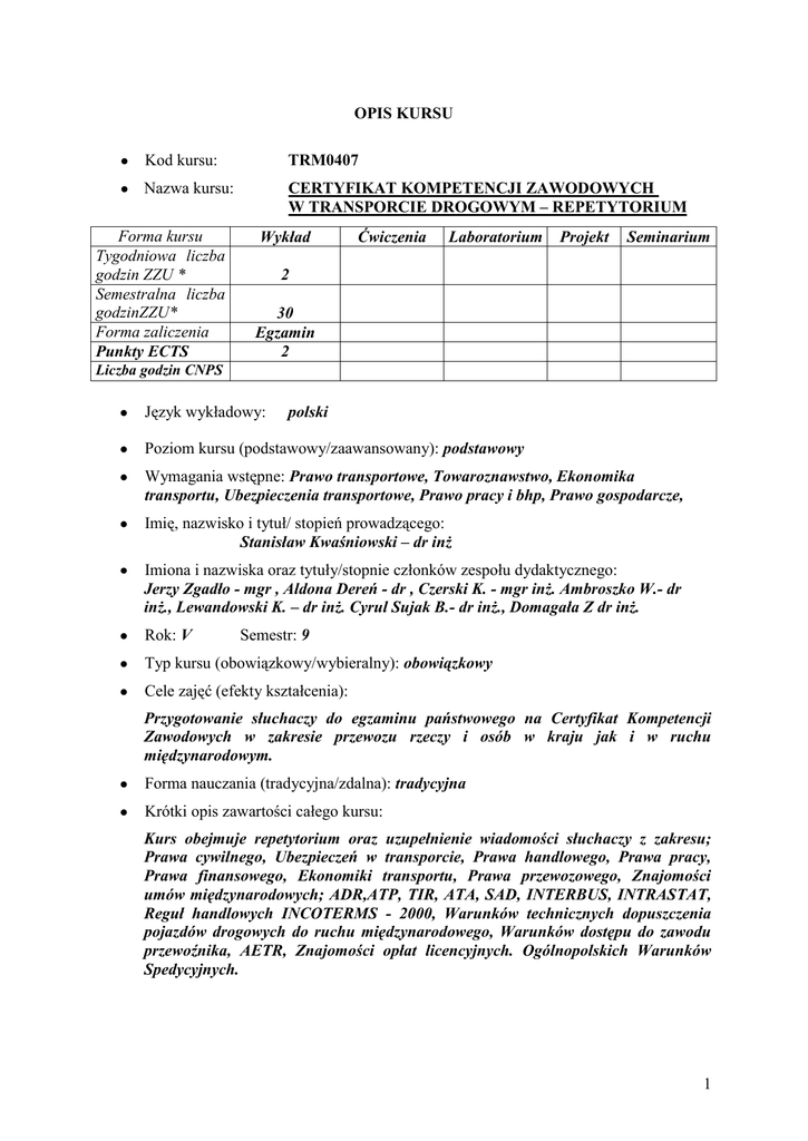 1 OPIS KURSU Kod kursu: TRM0407 Nazwa kursu: CERTYFIKAT