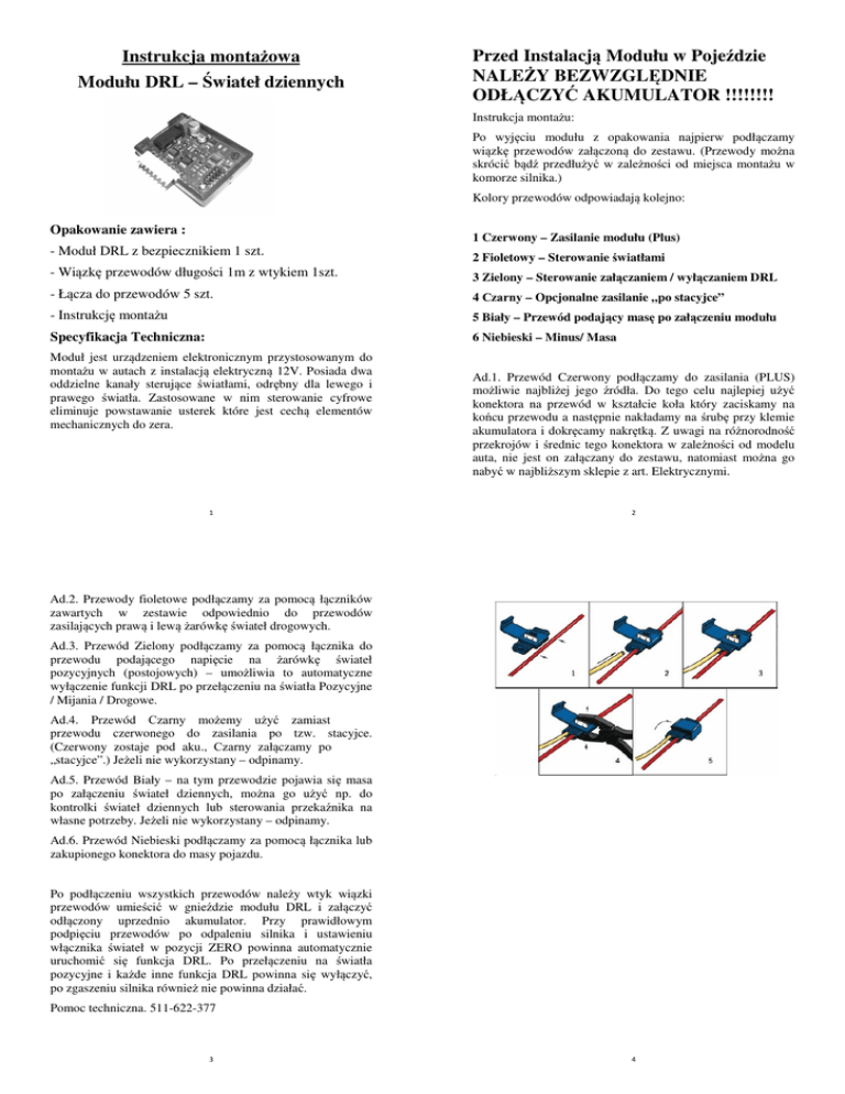Instrukcja montażowa Modułu DRL – Świateł dziennych Przed Instalacją Modułu w Pojeździe NALEŻY BEZWZGLĘDNIE ODŁĄCZYĆ AKUMULATOR !!!!!!!! Instrukcja montażu: Po wyjęciu modułu z opakowania najpierw podłączamy wiązkę przewodów załączoną do zestawu. (Przewody można skrócić bądź przedłużyć w zależności od miejsca montażu w komorze silnika.) Kolory przewodów odpowiadają kolejno: Opakowanie zawiera : 1 Czerwony – Zasilanie modułu (Plus) - Moduł DRL z bezpiecznikiem 1 szt. - Wiązkę przewodów długości 1m z wtykiem 1szt. 2 Fioletowy – Sterowanie światłami 3 Zielony – Sterowanie załączaniem / wyłączaniem DRL - Łącza do przewodów 5 szt. 4 Czarny – Opcjonalne zasilanie „po stacyjce” - Instrukcję montażu 5 Biały – Przewód podający masę po załączeniu modułu Specyfikacja Techniczna: 6 Niebieski – Minus/ Masa Moduł jest urządzeniem elektronicznym przystosowanym do montażu w autach z instalacją elektryczną 12V. Posiada dwa oddzielne kanały sterujące światłami, odrębny dla lewego i prawego światła. Zastosowane w nim sterowanie cyfrowe eliminuje powstawanie usterek które jest cechą elementów mechanicznych do zera. 1 Ad.1. Przewód Czerwony podłączamy do zasilania (PLUS) możliwie najbliżej jego źródła. Do tego celu najlepiej użyć konektora na przewód w kształcie koła który zaciskamy na końcu przewodu a następnie nakładamy na śrubę przy klemie akumulatora i dokręcamy nakrętką. Z uwagi na różnorodność przekrojów i średnic tego konektora w zależności od modelu auta, nie jest on załączany do zestawu, natomiast można go nabyć w najbliższym sklepie z art. Elektrycznymi. 2 Ad.2. Przewody fioletowe podłączamy za pomocą łączników zawartych w zestawie odpowiednio do przewodów zasilających prawą i lewą żarówkę świateł drogowych. Ad.3. Przewód Zielony podłączamy za pomocą łącznika do przewodu podającego napięcie na żarówkę świateł pozycyjnych (postojowych) – umożliwia to automatyczne wyłączenie funkcji DRL po przełączeniu na światła Pozycyjne / Mijania / Drogowe. Ad.4. Przewód Czarny możemy użyć zamiast przewodu czerwonego do zasilania po tzw. stacyjce. (Czerwony zostaje pod aku., Czarny załączamy po „stacyjce”.) Jeżeli nie wykorzystany – odpinamy. Ad.5. Przewód Biały – na tym przewodzie pojawia się masa po załączeniu świateł dziennych, można go użyć np. do kontrolki świateł dziennych lub sterowania przekaźnika na własne potrzeby. Jeżeli nie wykorzystany – odpinamy. Ad.6. Przewód Niebieski podłączamy za pomocą łącznika lub zakupionego konektora do masy pojazdu. Po podłączeniu wszystkich przewodów należy wtyk wiązki przewodów umieścić w gnieździe modułu DRL i załączyć odłączony uprzednio akumulator. Przy prawidłowym podpięciu przewodów po odpaleniu silnika i ustawieniu włącznika świateł w pozycji ZERO powinna automatycznie uruchomić się funkcja DRL. Po przełączeniu na światła pozycyjne i każde inne funkcja DRL powinna się wyłączyć, po zgaszeniu silnika również nie powinna działać. Pomoc techniczna. 511-622-377 3 4