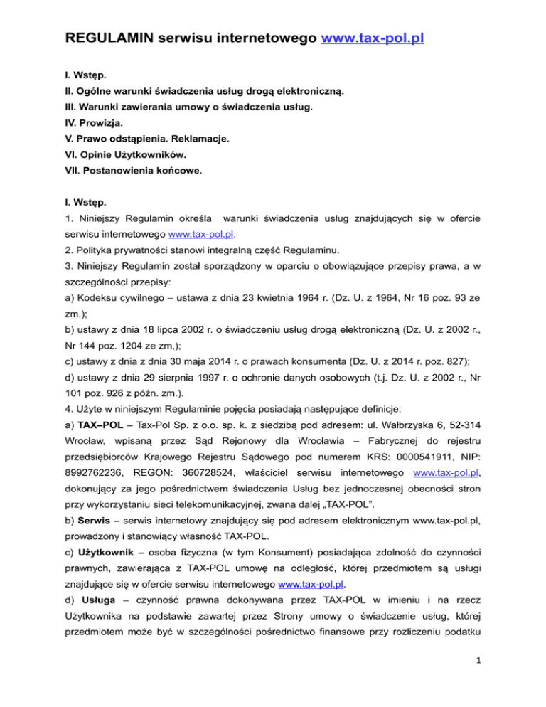 REGULAMIN serwisu internetowego www.tax-pol.pl I. Wstęp. II. Ogólne warunki świadczenia usług drogą elektroniczną. III. Warunki zawierania umowy o świadczenia usług. IV. Prowizja. V. Prawo odstąpienia. Reklamacje. VI. Opinie Użytkowników. VII. Postanowienia końcowe. I. Wstęp. 1. Niniejszy Regulamin określa warunki świadczenia usług znajdujących się w ofercie serwisu internetowego www.tax-pol.pl. 2. Polityka prywatności stanowi integralną część Regulaminu. 3. Niniejszy Regulamin został sporządzony w oparciu o obowiązujące przepisy prawa, a w szczególności przepisy: a) Kodeksu cywilnego – ustawa z dnia 23 kwietnia 1964 r. (Dz. U. z 1964, Nr 16 poz. 93 ze zm.); b) ustawy z dnia 18 lipca 2002 r. o świadczeniu usług drogą elektroniczną (Dz. U. z 2002 r., Nr 144 poz. 1204 ze zm,); c) ustawy z dnia z dnia 30 maja 2014 r. o prawach konsumenta (Dz. U. z 2014 r. poz. 827); d) ustawy z dnia 29 sierpnia 1997 r. o ochronie danych osobowych (t.j. Dz. U. z 2002 r., Nr 101 poz. 926 z późn. zm.). 4. Użyte w niniejszym Regulaminie pojęcia posiadają następujące definicje: a) TAX–POL – Tax-Pol Sp. z o.o. sp. k. z siedzibą pod adresem: ul. Wałbrzyska 6, 52-314 Wrocław, wpisaną przez Sąd Rejonowy dla Wrocławia – Fabrycznej do rejestru przedsiębiorców Krajowego Rejestru Sądowego pod numerem KRS: 0000541911, NIP: 8992762236, REGON: 360728524, właściciel serwisu internetowego www.tax-pol.pl, dokonujący za jego pośrednictwem świadczenia Usług bez jednoczesnej obecności stron przy wykorzystaniu sieci telekomunikacyjnej, zwana dalej „TAX-POL”. b) Serwis – serwis internetowy znajdujący się pod adresem elektronicznym www.tax-pol.pl, prowadzony i stanowiący własność TAX-POL. c) Użytkownik – osoba fizyczna (w tym Konsument) posiadająca zdolność do czynności prawnych, zawierająca z TAX-POL umowę na odległość, której przedmiotem są usługi znajdujące się w ofercie serwisu internetowego www.tax-pol.pl. d) Usługa – czynność prawna dokonywana przez TAX-POL w imieniu i na rzecz Użytkownika na podstawie zawartej przez Strony umowy o świadczenie usług, której przedmiotem może być w szczególności pośrednictwo finansowe przy rozliczeniu podatku 1 dochodowego z właściwym organem podatkowym oraz inne usługi aktualnie oferowane przez TAX-POL. e) Formularz – elektroniczny formularz znajdujący się na stronach Serwisu, który wypełniany jest określonymi w nim Danymi osobowymi Użytkownika. f) Dokumenty – do każdej usługi określone są odrębnie, stanowią rodzaj dokumentów niezbędnych TAX-POL do świadczenia wybranej przez Użytkownika usługi. g) Strony – TAX-POL i Użytkownik. h) Cena – oznacza cenę Usługi umieszczoną w cenniku zamieszczonym w Serwisie w zakładce „Opłaty” oraz przy podpisaniu umowy. i) Prowizja – opłata pobierana przez TAX-POL za wykonaną usługę. j) Płatność – czynność polegająca na zapłacie za wykonaną usługę. k) Realizacja Zamówienia - czas konieczny na wykonanie Usługi przez TAX-POL. l) Dane osobowe – zestaw danych Użytkownika o charakterze osobowym, przetwarzanych w celu realizacji świadczenia usług. m) Umowa - umowa zawierana na odległość bez jednoczesnej obecności Stron. n) Zawarcie Umowy – następuję w momencie, gdy Użytkownik przesyła do TAX-POL wypełnione i podpisane dokumenty służące realizacji wybranej usługi lub też dokona zapłaty za usługę „z góry” na warunkach określonych w niniejszym Regulaminie i po ich akceptacji. II. Ogólne warunki świadczenia usług drogą elektroniczną. 1. Użytkownik przyjmuje do wiadomości, że świadczenie usług odbywa się przy wykorzystaniu systemu teleinformatycznego, zapewniającego przetwarzanie i przechowywanie, a także wysłanie i odbieranie danych poprzez sieci telekomunikacyjne, zgodnie z brzmieniem ustawy z dnia 18 lipca 2002 r. o świadczeniu usług drogą elektroniczną. 2. Korzystanie z serwisu internetowego TAX-POL może odbywać się wyłącznie na zasadach określonych w treści niniejszego Regulaminu. 3. Korzystanie z serwisu internetowego TAX-POL może odbywać się przy wykorzystaniu najpopularniejszych przeglądarek internetowych. 4. Wypełnienie Formularza lub przesłanie Dokumentów przez Użytkownika Serwisu jest równoznaczne z zapoznaniem się oraz akceptacją niniejszego Regulaminu oraz stanowiącą jego integralną część Polityką Prywatności. 5. Wzory kart podatkowych zamieszczanych na stronach Serwisu są dokumentami urzędowymi, których treść i struktura została ustalona przez organy podatkowe. Dokonanie rozliczenia podatku dochodowego oraz złożenie wniosku o zwrot nadpłaconego podatku możliwe jest wyłącznie poprzez właściwe wypełnienie kart podatkowych. Użytkownik przyjmuje do wiadomości, że wzory kart podatkowych nie są chronione prawami autorskimi, przy czym jakakolwiek ich modyfikacja może skutkować wydaniem odmownej decyzji w przedmiocie zwrotu podatku przez organ podatkowy. 2 6. Użytkownik przyjmuje do wiadomości, że w celu uniknięcia zamieszczenia w Serwisie treści niezgodnych z prawem wpisy Użytkowników dotyczące procedur podatkowych mogą być moderowane przez TAX-POL przed ich publikacją. 7. Użytkownik przyjmuje do wiadomości, że kontakt z TAX-POL dotyczący świadczenia Usług odbywa się: a) drogą mailową na następujące adresy – w zależności z jakim Państwem powiązane będą Usługi: [email protected], [email protected], [email protected], [email protected], [email protected], [email protected], [email protected], [email protected], [email protected], [email protected], [email protected] lub [email protected]; b) drogą telefoniczną, od poniedziałku do piątku w godzinach 8:00 – 18:00 oraz w soboty w godzinach 9:00 – 13:00 pod numerami: tel.: 71 799 50 00 – biuro w Polsce fax.: 71 799 50 09 – biuro w Polsce tel. holenderski: +31 20 893 2688 tel. brytyjski: +44 20 3239 2445 tel. niemiecki: +49 20