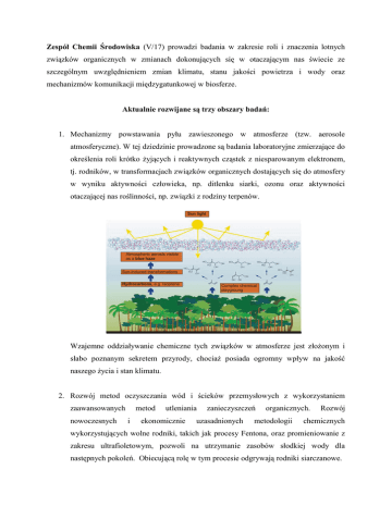 Zespół Chemii Środowiska (V/17) prowadzi badania w zakresie roli i znaczenia lotnych związków organicznych w zmianach dokonujących się w otaczającym nas świecie ze szczególnym uwzględnieniem zmian klimatu, stanu jakości powietrza i wody oraz mechanizmów komunikacji międzygatunkowej w biosferze. Aktualnie rozwijane są trzy obszary badań: 1. Mechanizmy powstawania pyłu zawieszonego w atmosferze (tzw. aerosole atmosferyczne). W tej dziedzinie prowadzone są badania laboratoryjne zmierzające do określenia roli krótko żyjących i reaktywnych cząstek z niesparowanym elektronem, tj. rodników, w transformacjach związków organicznych dostających się do atmosfery w wyniku aktywności człowieka, np. ditlenku siarki, ozonu oraz aktywności otaczającej nas roślinności, np. związki z rodziny terpenów. Sun light Atmospheric aerosls visible as a blue haze Sun-induced transformations Hydrocarbons, e.g. Isoprene Complex chemical playgroung Wzajemne oddziaływanie chemiczne tych związków w atmosferze jest złożonym i słabo poznanym sekretem przyrody, chociaż posiada ogromny wpływ na jakość naszego życia i stan klimatu. 2. Rozwój metod oczyszczania wód i ścieków przemysłowych z wykorzystaniem zaawansowanych nowoczesnych metod i utleniania ekonomicznie zanieczyszczeń uzasadnionych organicznych. metodologii Rozwój chemicznych wykorzystujących wolne rodniki, takich jak procesy Fentona, oraz promieniowanie z zakresu ultrafioletowym, pozwoli na utrzymanie zasobów słodkiej wody dla następnych pokoleń. Obiecującą rolę w tym procesie odgrywają rodniki siarczanowe. 3. Rozwój metod analitycznych z wykorzystaniem nowoczesnych narzędzi spektrometrii mas oraz detektorów fizjologicznych w rozpoznawaniu oddziaływań molekularnych pomiędzy owadami oraz oddziaływaniami owad-drzewo, służącymi do opracowania pro-ekologicznych sposobów ochrony lasów (współpraca z Instytutem Leśnictwa oraz Zespołem Zielonej Chemii). Szczególną rolę w tym kierunku zajmuje tandemowa spektrometria mas, która pozwala na szybką i prawie stu procentową identyfikację cząsteczek odpowiedzialnych za te oddziaływania. Osoby zainteresowane odbyciem praktyk lub chęcią podjęcia współpracy serdecznie zapraszamy. Wszelkie uwagi, zapytania prosimy kierować do: Rafał Szmigielski ([email protected]), kierownik grupy, specjalizujący się w rozwoju metod analitycznych służących do charakteryzacji złożonych matryc organicznych. Krzysztof J. Rudziński ([email protected]), specjalista z zakresu chemii atmosfery, w tym mechanizmów tworzenia zanieczyszczeń powietrza i wody.