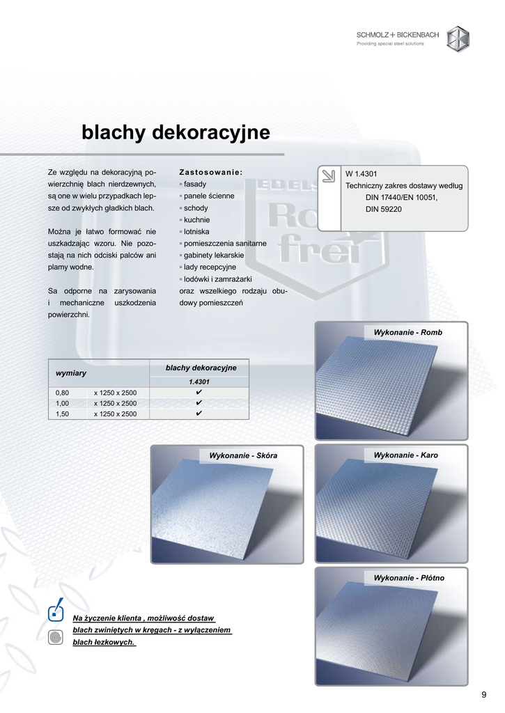blachy dekoracyjne Ze względu na dekoracyjną po- Z a s t o s o w a n i e: W 1.4301 wierzchnię blach nierdzewnych, ▫ fasady Techniczny zakres dostawy według są one w wielu przypadkach lep- ▫ panele ścienne DIN 17440/EN 10051, sze od zwykłych gładkich blach. ▫ schody DIN 59220 ▫ kuchnie Można je łatwo formować nie ▫ lotniska uszkadzając wzoru. Nie pozo- ▫ pomieszczenia sanitarne stają na nich odciski palców ani ▫ gabinety lekarskie plamy wodne. ▫ lady recepcyjne ▫ lodówki i zamrażarki Sa odporne na zarysowania oraz wszelkiego rodzaju obu- i dowy pomieszczeń mechaniczne uszkodzenia powierzchni. Wykonanie - Romb blachy dekoracyjne wymiary 0,80 x 1250 x 2500 1.4301 1,00 x 1250 x 2500 1,50 x 1250 x 2500 Wykonanie - Skóra Wykonanie - Karo Wykonanie - Płótno Na życzenie klienta , możliwość dostaw blach zwiniętych w kręgach - z wyłączeniem blach łezkowych.