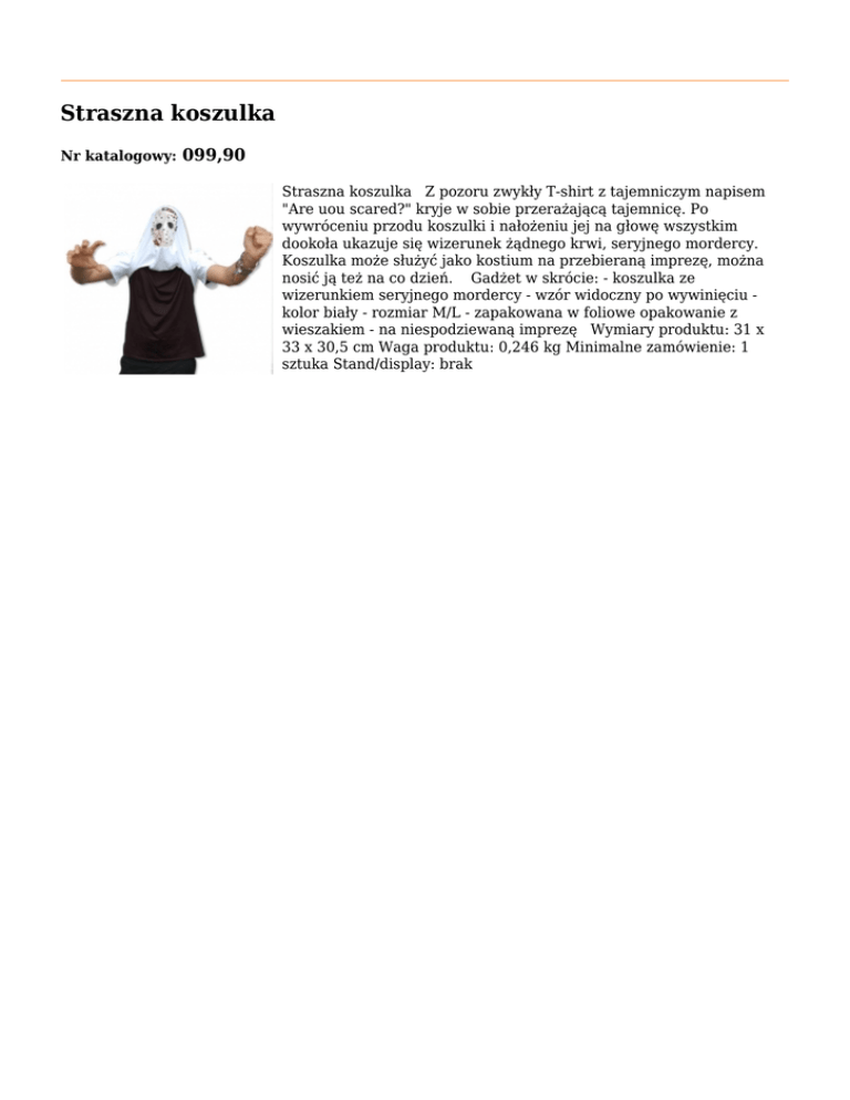 Straszna koszulka Nr katalogowy: 099,90 Straszna koszulka Z pozoru zwykły T-shirt z tajemniczym napisem "Are uou scared?" kryje w sobie przerażającą tajemnicę. Po wywróceniu przodu koszulki i nałożeniu jej na głowę wszystkim dookoła ukazuje się wizerunek żądnego krwi, seryjnego mordercy. Koszulka może służyć jako kostium na przebieraną imprezę, można nosić ją też na co dzień. Gadżet w skrócie: - koszulka ze wizerunkiem seryjnego mordercy - wzór widoczny po wywinięciu kolor biały - rozmiar M/L - zapakowana w foliowe opakowanie z wieszakiem - na niespodziewaną imprezę Wymiary produktu: 31 x 33 x 30,5 cm Waga produktu: 0,246 kg Minimalne zamówienie: 1 sztuka Stand/display: brak