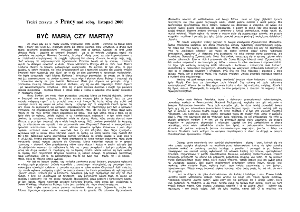 Tre ci zeszytu 19 BY Pracy nad MARI sob , listopad 2000 CZY MART ? Od chwili gdy si w Pracy ukazały wypowiedzi brata Józefa i Dominiki na temat sióstr Marii i Marty (Łk 10:38-42), z których jedna po prostu słuchała słów Chrystusa, a druga była 1 zaj ta sprawami gospodarczymi , my lałam stale nad t spraw . Czułam, e brat Józef chwal c Mari - zgodnie ze słowami Ewangelii - za to e wybrała „najlepsz cz ” nie powiedział wszystkiego. Równie Dominika, „broni ca” Mart przed zarzutami opowiadaniem o jej działalno ci charytatywnej, nie przyj ła najlepszej linii obrony. Czułam, e oboje maj racj , cho operuj nie najistotniejszymi argumentami. Promie wiatła na t spraw i zarazem impuls do dalszych rozwa a w duchu Dzieła Miłosierdzia Bo ego dał mi zbiór nauk Mistrza Eckharta otwarty na kazaniu po wi conym uroczysto ci 15 sierpnia. W tym dniu, za jego czasów, w całym Ko ciele, nie tylko prawosławnym ale i rzymskim czytano ten wła nie wyj tek Ewangelii który rozpatruje brat Józef, jak to si do dzi zachowało w ko ciołach mariawickich. 2 Nie b d streszczała my li Mistrza Eckharta . Wystarczy powiedzie , e uwa a on, i Marta jest ju zaawansowana na drodze rozwoju, mo e wi c i słucha słowa Bo ego i troszczy si o konieczne rzeczy na tym wiecie. Natomiast Maria jest dopiero na pocz tku drogi i tymczasem musi si całkowicie skupi na słuchaniu, aby si nie da rozproszy . Potem dopiero - po Wniebowst pieniu Chrystusa - stała si w pełni dojrzała duchowo i mogła by pierwsz kobiet misjonark - ł cz c trosk o Słowo Bo e z trosk o wszelkie inne rzeczy potrzebne w nauczaniu innych. Mistrz Eckhart by mo e nieco przesadza, uwa aj c Mart za bardziej dojrzał . Jednak w Ewangelii nie jest napisane, e „Maria została wybrana jako ta lepsza” lecz, e „ona wybrała najlepsz cz ”, a to przecie znaczy co innego. S ludzie, którzy aby zrobi co istotnego musz si skupi na jednej rzeczy i „wył czy si ” ze wszystkich innych spraw. S inni, zdolni do zajmowania si sprawami najwa niejszymi nie zapominaj c przy tym o sprawach wprawdzie nie najwa niejszych ale równie potrzebnych. Kto , kto nie jest w stanie obj wielu rzeczy na raz musi pewne rzeczy pozostawi na boku. Tak była Maria, która z tego, co jej ycie dało do wyboru, umiała wybra to co najwła ciwsze, najlepsze i w tym wielu mo e i powinno j na ladowa . Inne mo liwo ci miała jej siostra, Marta, która umiała słucha nauk Mistrza, a przy tym troszczy si o wiele innych rzeczy. Któ bowiem powiedział, e krz taj c si po mieszkaniu nie słyszała i nie przyjmowała słów Chrystusa? Przecie w ewangelicznym epizodzie wskrzeszenia Łazarza to ona wła nie pierwsza spotyka Zbawiciela i jako Jego dojrzała uczennica mówi >>Jam uwierzyła, e Ty jest Chrystus, Syn Boga ywego”<<. Wymawia wi t te słowa, które Chrystus uwa a za opok , na której wznosi Swój Ko ciół (Mt 16:16-18), Natomiast Maria spotykaj ca pó niej Chrystusa po prostu płacze u Jego stóp (J 11:27,32-33). Mo na powiedzie , e Maria przedstawia tu istot wysoce uczuciow , która przez wzruszenie (płacz) wyra a zaufanie do Chrystusa. Marta natomiast wyra a to w sposób rozumowy - słowami. Obie przedstawiaj ró ne stany duszy i ka da w swoim zakresie jest chrze cija skim wzorcem do na ladowania. Nie ma - poza domysłami - adnych podstaw, aby jedn lub drug uwa a za znajduj c si na lepszej drodze. Marta skłonna si była uwa a za lepsz , lecz natychmiast Chrystus delikatnie j skarcił mówi c, e podstaw prawidłowej drogi uczniowskiej jest to, co najwa niejsze. Ma to nie tylko ona - Marta, ale i jej siostra Maria, która t wła nie cz wybrała. Kto jest na lepszej drodze, czy mniszka zamkni ta przed wiatem, pogr ona wył cznie w mistycznych prze yciach (mówi oczywi cie o prawdziwym mistycy mie), czy gospodyni domu wykonuj ca obowi zki rodzinne, a ponadto nosz ca w sobie realnie Chrystusa? Je li mniszka, czy mnich wybiera „najlepsz cz ”, to znaczy równie , e innym pozostawia do wykorzystania „gorsze” cz ci. Czasem jest to konieczne, zwłaszcza, gdy tego najlepszego nikt inny nie chce podj , a brak sił (duchowych lub fizycznych) aby przyjmowa cało tego, co niesie los osobisty i społeczny. Nie ma sensu rozwa a abstrakcyjnie, poza czasem i konkretnymi lud mi, co jest lepsze. Mo na natomiast postawi konkretne pytanie, która droga jest wła ciwsza w Dziele Wielkiego Miłosierdzia Bo ego, która jest bardziej dla niego charakterystyczna. Otó chyba sama osoba patrona mariawitów, dana przez Objawienie, osoba w. Alfonsa Liguoriego odpowiada w znacznej mierze na to pytanie. Dla członków Zgromadzenia Mariawitów wzorem do na ladowania jest wi ty Alfons. Umiał on yj c gł bokim yciem mistycznym, nie tylko, głosi porywaj ce nauki, ułada pi kne melodie i takie poezje. Dla duchownego zgromadzenia, które zało ył, troszczył si dosłownie o wszystko, od wcale nie łatwych kwestii prawa ko cielnego, po gospodarcze, a potem to samo robił jako biskup dla swojej diecezji. Dopiero zło ony chorob i zwolniony z funkcji ordynariusza, maj c resztki sił, musiał wybiera . Wtedy wybrał nie trosk o własne stale si pogarszaj ce zdrowie, ale przede wszystkim modlitw i ponadto ju tylko (jak e przecie jeszcze płodn !) teologiczn działalno pisarsk . Ale przede wszystkim we my przykład ze wi tej Zało ycielki Zgromadzenia Mariawitów. adna przeło ona klasztoru, czy domu zakonnego, cho by najbardziej kontemplacyjnej reguły, nie mo e by tylko Mari . Z konieczno ci musi by Mart . Musi mie sił aby nie poprzesta tylko na „najlepszej cz stce”, ale wzi na siebie równie ci ar spraw najbardziej powszednich, „gorszych”. A Mateczka była przeło on nie tylko jednego domu zakonnego, ale Przeło on Generaln Zgromadzenia Sióstr Mariawitek, troszcz c si o sprawy bytowe wielu domów zakonnych. yło w nich i pracowało dla Dzieła Bo ego kilkaset sióstr Zgromadzenia. Jak mo na rozpozna z zachowanych jej listów - umiała to robi rzeczowo i odpowiedzialnie. Do teg