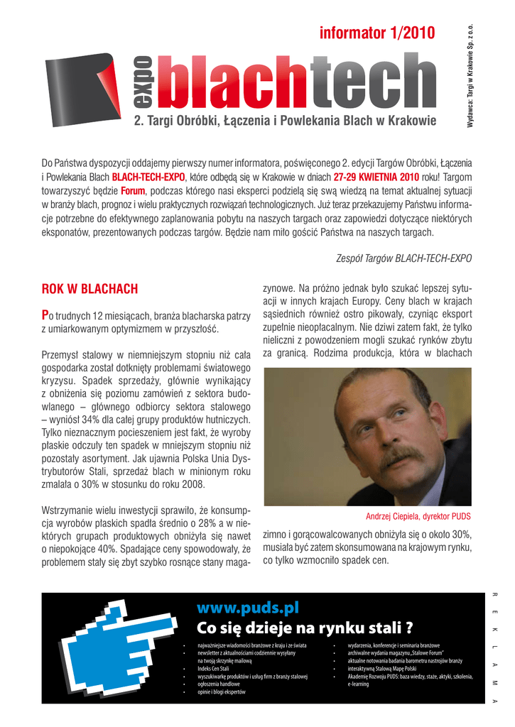 2. Targi Obróbki, Łączenia i Powlekania Blach w Krakowie Wydawca: Targi w Krakowie Sp. z o.o. informator 1/2010 Do Państwa dyspozycji oddajemy pierwszy numer informatora, poświęconego 2. edycji Targów Obróbki, Łączenia i Powlekania Blach BLACH-TECH-EXPO, które odbędą się w Krakowie w dniach 27-29 KWIETNIA 2010 roku! Targom towarzyszyć będzie Forum, podczas którego nasi eksperci podzielą się swą wiedzą na temat aktualnej sytuacji w branży blach, prognoz i wielu praktycznych rozwiązań technologicznych. Już teraz przekazujemy Państwu informacje potrzebne do efektywnego zaplanowania pobytu na naszych targach oraz zapowiedzi dotyczące niektórych eksponatów, prezentowanych podczas targów. Będzie nam miło gościć Państwa na naszych targach. Zespół Targów BLACH-TECH-EXPO Rok w blachach Po trudnych 12 miesiącach, branża blacharska patrzy z umiarkowanym optymizmem w przyszłość. Przemysł stalowy w niemniejszym stopniu niż cała gospodarka został dotknięty problemami światowego kryzysu. Spadek sprzedaży, głównie wynikający z obniżenia się poziomu zamówień z sektora budowlanego – głównego odbiorcy sektora stalowego – wyniósł 34% dla całej grupy produktów hutniczych. Tylko nieznacznym pocieszeniem jest fakt, że wyroby płaskie odczuły ten spadek w mniejszym stopniu niż pozostały asortyment. Jak ujawnia Polska Unia Dystrybutorów Stali, sprzedaż blach w minionym roku zmalała o 30% w stosunku do roku 2008. Wstrzymanie wielu inwestycji sprawiło, że konsumpcja wyrobów płaskich spadła średnio o 28% a w niektórych grupach produktowych obniżyła się nawet o niepokojące 40%. Spadające ceny spowodowały, że problemem stały się zbyt szybko rosnące stany maga- zynowe. Na próżno jednak było szukać lepszej sytuacji w innych krajach Europy. Ceny blach w krajach sąsiednich również ostro pikowały, czyniąc eksport zupełnie nieopłacalnym. Nie dziwi zatem fakt, że tylko nieliczni z powodzeniem mogli szukać rynków zbytu za granicą. Rodzima produkcja, która w blachach Andrzej Ciepiela, dyrektor PUDS zimno i gorącowalcowanych obniżyła się o około 30%, musiała być zatem skonsumowana na krajowym rynku, co tylko wzmocniło spadek cen. A M XZEBS[FOJBLPOGFSFODKFJTFNJOBSJBCSBOȈPXF BSDIJXBMOFXZEBOJBNBHB[ZOVv4UBMPXF'PSVNw BLUVBMOFOPUPXBOJBCBEBOJBCBSPNFUSVOBTUSPKØXCSBOȈZ JOUFSBLUZXOnj4UBMPXnj.BQǗ1PMTLJ "LBEFNJǗ3P[XPKV16%4CB[BXJFE[ZTUBȈFBLUZLJT[LPMFOJB FMFBSOJOH L t t t t t K t t t t OBKXBȈOJFKT[FXJBEPNPǴDJCSBOȈPXF[LSBKVJ[FǴXJBUB OFXTMFUUFS[BLUVBMOPǴDJBNJDPE[JFOOJFXZTZBOZ OBUXPKnjTLS[ZOLǗNBJMPXnj *OEFLT$FO4UBMJ XZT[VLJXBSLǗQSPEVLUØXJVTVHöSN[CSBOȈZTUBMPXFK PHPT[FOJBIBOEMPXF PQJOJFJCMPHJFLTQFSUØX E t t R www.puds.pl Co się dzieje na rynku stali ? A Analiza cen blach w ostatnich tygodniach wyraźnie sygnalizuje powrót trendu wzrostowego. Również porównując sytuację z pierwszego półroczna 2009 do końcówki roku, bez wątpienia widać że uczestnicy rynku mogą patrzyć z umiarkowanym optymizmem w przyszłość. Produkcja blach gorącowalcowanych w drugiej połowie roku była już wyraźnie większa, podobnie blach i taśmy ocynkowanych. Na rynek wraca umiarkowany wzrost popytu, co może sygnalizować tak długo wyczekiwane odwrócenie trendu spadkowego. „Do lata sytuacja na rynku powinna być już lepsza” – mówi Andrzej Ciepiela z Polskiej Unii Dystrybutorów Stali. „Wciąż czekamy na stabilizację trendu wzrostowego, choć trzeba zdawać sobie sprawę, że ten rok, choć na pewno lepszy niż poprzedni, do łatwych również nie będzie się zaliczał” – dodaje dyrektor zrzeszenia dystrybutorów stali. Produkcja wyrobów płaskich w Polsce. Porównanie 11 miesięcy 2009 do 11 miesięcy 2008. Dane CIBEH. Więcej o sytuacji w branży stalowej dowiedzą się Państwo z prezentacji Andrzeja Ciepieli „Rynek blach w Polsce – ceny, tendencje, prognozy”, która odbędzie się podczas Forum Tragów BLACH-TECH-EXPO 2010. Druga połowa minionego roku przyniosła ożywienie w wymianie handlowej wyrobami stalowymi, dając sygnał że eksport znów stał się opłacalny. Wśród wyrobów stalowych, porównując do początku roku 2009 r., zdecydowanie więcej eksportowano blach gorąco i taśm zimnowalcowanych. Dwoma tradycyjnie największymi odbiorcami tego asortymentu są Niemcy i Czesi. Zdecydowanie gorzej sytuacja wygląda w sektorze blach walcowanych na zimno. Wskutek spadającej krajowej produkcji tego produkty, dystrybutorzy szukali dostawców w dużej mierze za granicą, powodując przerost importu nad produkcją polskich hut w drugiej połowie 2009 r. Kupowano głównie w Niemczech, na Słowacji i Węgrzech. Import taśm i blach ocynkowanych, który jest średnio trzy razy większy niż rodzima produkcja, pozostał na stabilnym poziomie przez cały rok i był o niecałe 20% mniejszy niż w 2008 r. PROGRAM FORUM TARGÓW BLACH-TECH-EXPO 28-29 kwietnia 2010 28 kwietnia 2010 (środa) 10.30-11.10 A. Ciepiela, Polska Unia Dystrybutorów Stali Rynek blach w Polsce – ceny, tendencje, prognozy 11.15-11.35 S. Hyżyk, TOX PRESSOTECHNIK Sp. z o.o. Wybór i wdrożenie do produkcji technologii łączenia blach poprzez przetłaczanie (clinching) 11.40-12.00 B. Schwabe, GSW Schwabe/MEX Handel Sp. z o.o. Kompaktowe linie podające 12.05-12.25 B. Schwabe, GSW Schwabe/MEX Handel Sp. z o.o. Cięcie wzdłużne i poprzeczne blach przez użytkownika na własne potrzeby 12.30-12.45 P. Rożek, datacomp Sp. z o.o. Alibre Design – modelowanie blach w 3D 12.50-13.15 K. Tuźnik, datacomp Sp. z o.o. SigmaNEST – redukcja kosztów cięcia blach 13.20-13.40 J. Juras, datacomp Sp. z o.o. Redukcja zapasów magazynowych na przykładzie systemu Plan de Campagne 13.45-14.00 W. Muzykiewicz, Wydział Metali Nieżelaznych AGH Tłoczność blach – sposoby i kryteria oceny 14.05-14.20 W. Muzykiewicz, Wydział Metali Nieżelaznych AGH Niekonwencjonalne materiały i technologie w procesach tłoczenia blach 14.25-14.40 A. Ręk