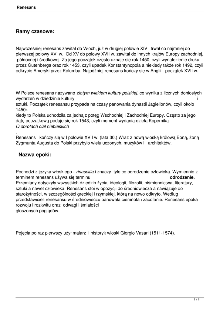Renesans Ramy czasowe: Najwcześniej renesans zawitał do Włoch, już w drugiej połowie XIV i trwał co najmniej do pierwszej połowy XVI w. Od XV do połowy XVII w. zawitał do innych krajów Europy zachodniej, północnej i środkowej. Za jego początek często uznaje się rok 1450, czyli wynalezienie druku przez Gutenberga oraz rok 1453, czyli upadek Konstantynopola a niekiedy także rok 1492, czyli odkrycie Ameryki przez Kolumba. Najpóźniej renesans kończy się w Anglii - początek XVII w. W Polsce renesans nazywano złotym wiekiem kultury polskiej, co wynika z licznych doniosłych wydarzeń w dziedzinie kultury i sztuki. Początek renesansu przypada na czasy panowania dynastii Jagiellonów, czyli około 1450r. kiedy to Polska uchodziła za jedną z potęg Wschodniej i Zachodniej Europy. Często za jego datę początkową podaje się rok 1543, czyli moment wydania dzieła Kopernika O obrotach ciał niebieskich . Renesans kończy się w I połowie XVII w. (lata 30.) Wraz z nową włoską królową Boną, żoną Zygmunta Augusta do Polski przybyło wielu uczonych, muzyków i architektów. Nazwa epoki: Pochodzi z języka włoskiego - rinascitia i znaczy tyle co odrodzenie człowieka. Wymiennie z terminem renesans używa się terminu odrodzenie. Przemiany dotyczyły wszystkich dziedzin życia, ideologii, filozofii, piśmiennictwa, literatury, sztuki a nawet człowieka. Renesans stoi w opozycji do średniowiecza a nawiązuje do starożytności, w szczególności greckiej i rzymskiej, którą na nowo odkryto. Według przedstawicieli renesansu w średniowieczu panowała ciemnota i zacofanie. Renesans epoka rozwoju i rozkwitu oraz odwagi i śmiałości głoszonych poglądów. Pojęcia po raz pierwszy użył malarz i historyk włoski Giorgio Vasari (1511-1574). 1/1