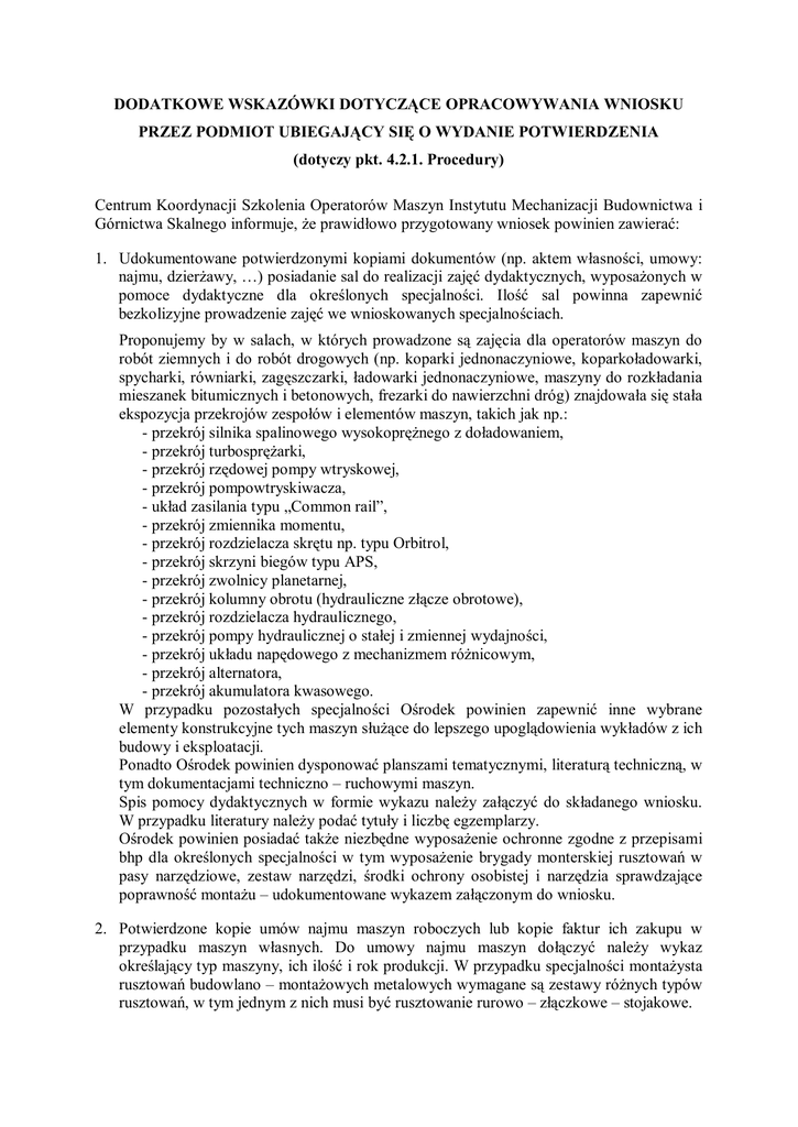 DODATKOWE WSKAZÓWKI DOTYCZĄCE OPRACOWYWANIA WNIOSKU PRZEZ PODMIOT UBIEGAJĄCY SIĘ O WYDANIE POTWIERDZENIA (dotyczy pkt. 4.2.1. Procedury) Centrum Koordynacji Szkolenia Operatorów Maszyn Instytutu Mechanizacji Budownictwa i Górnictwa Skalnego informuje, że prawidłowo przygotowany wniosek powinien zawierać: 1. Udokumentowane potwierdzonymi kopiami dokumentów (np. aktem własności, umowy: najmu, dzierżawy, …) posiadanie sal do realizacji zajęć dydaktycznych, wyposażonych w pomoce dydaktyczne dla określonych specjalności. Ilość sal powinna zapewnić bezkolizyjne prowadzenie zajęć we wnioskowanych specjalnościach. Proponujemy by w salach, w których prowadzone są zajęcia dla operatorów maszyn do robót ziemnych i do robót drogowych (np. koparki jednonaczyniowe, koparkoładowarki, spycharki, równiarki, zagęszczarki, ładowarki jednonaczyniowe, maszyny do rozkładania mieszanek bitumicznych i betonowych, frezarki do nawierzchni dróg) znajdowała się stała ekspozycja przekrojów zespołów i elementów maszyn, takich jak np.: - przekrój silnika spalinowego wysokoprężnego z doładowaniem, - przekrój turbosprężarki, - przekrój rzędowej pompy wtryskowej, - przekrój pompowtryskiwacza, - układ zasilania typu „Common rail”, - przekrój zmiennika momentu, - przekrój rozdzielacza skrętu np. typu Orbitrol, - przekrój skrzyni biegów typu APS, - przekrój zwolnicy planetarnej, - przekrój kolumny obrotu (hydrauliczne złącze obrotowe), - przekrój rozdzielacza hydraulicznego, - przekrój pompy hydraulicznej o stałej i zmiennej wydajności, - przekrój układu napędowego z mechanizmem różnicowym, - przekrój alternatora, - przekrój akumulatora kwasowego. W przypadku pozostałych specjalności Ośrodek powinien zapewnić inne wybrane elementy konstrukcyjne tych maszyn służące do lepszego upoglądowienia wykładów z ich budowy i eksploatacji. Ponadto Ośrodek powinien dysponować planszami tematycznymi, literaturą techniczną, w tym dokumentacjami techniczno – ruchowymi maszyn. Spis pomocy dydaktycznych w formie wykazu należy załączyć do składanego wniosku. W przypadku literatury należy podać tytuły i liczbę egzemplarzy. Ośrodek powinien posiadać także niezbędne wyposażenie ochronne zgodne z przepisami bhp dla określonych specjalności w tym wyposażenie brygady monterskiej rusztowań w pasy narzędziowe, zestaw narzędzi, środki ochrony osobistej i narzędzia sprawdzające poprawność montażu – udokumentowane wykazem załączonym do wniosku. 2. Potwierdzone kopie umów najmu maszyn roboczych lub kopie faktur ich zakupu w przypadku maszyn własnych. Do umowy najmu maszyn dołączyć należy wykaz określający typ maszyny, ich ilość i rok produkcji. W przypadku specjalności montażysta rusztowań budowlano – montażowych metalowych wymagane są zestawy różnych typów rusztowań, w tym jednym z nich musi być rusztowanie rurowo – złączkowe – stojakowe. Poza tym Instytut zaleca podmiotom ubiegającym się o pozwolenie szkolenia operatorów na tzw. maszyny drobne (tj. zagęszczarki i ubijaki wibracyjne, piły mechaniczne do ścinki drzew, narzędzia udarowe ręczne, przecinarki do nawierzchni dróg, betoniarki) posiadanie tych maszyn na własność. 3. Potwierdzone kopie umowy najmu placu manewrowego z podaniem jego lokalizacji i powierzchni. Plac manewrowy musi zapewnić możliwość przeprowadzenia zajęć praktycznych i powinien posiadać bazę instruktażowo – socjalną. (tj. salę instruktażową, szatnię, WC, umywalki, prysznice) potwierdzoną w umowie najmu placu. W przypadku specjalności montażysty rusztowań budowlano – montażowych metalowych w umowie najmu placu manewrowego należy potwierdzić posiadanie ściany montażowej o wymiarach minimum 10m x 8m, do której rusztowanie będzie kotwione. W przypadku prowadzenia zajęć praktycznych dla operatorów pił mechanicznych do ścinki drzew Ośrodek musi mieć podpisaną umowę na przecinkę drzew z Lasami Państwowymi, Zarządem Zieleni Miejskiej lub Dyrekcją Dróg Krajowych. 4. Potwierdzone kopie dokumentów (dyplom, świadectwo ukończenia kursu pedagogicznego, CV) zezwalających na weryfikację kadry wykładowców zajęć teoretycznych pod względem wyższego wykształcenia technicznego, przygotowania pedagogicznego oraz doświadczenia zawodowego przy eksploatacji maszyn określonej specjalności. Do przeprowadzenia zajęć teoretycznych Ośrodek powinien dysponować, co najmniej 4-5 wykładowcami spełniającymi powyższe wymagania. Pozwala to na przestrzeganie w organizowanym szkoleniu podstawowej zasady dotyczącej dziennego czasu zajęć teoretycznych realizowanych z grupą przez jednego wykładowcę, co ma istotny wpływ na efektywność tego szkolenia. Normatyw ten nie może przekraczać czterech godzin. W przypadku montażysty rusztowań budowlano – montażowych metalowych wykładowcami powinni być inżynierowie o specjalności budowlanej. 5. Potwierdzone kopie dokumentów (dyplom, świadectwo szkolne, uprawnienia operatora) zezwalających na weryfikację kadry instruktorów praktycznej nauki zawodu. Zgodnie z procedurą instruktorzy powinni legitymować się, co najmniej średnim wykształceniem technicznym oraz uprawnieniami najwyższej klasy przewidzianej dla danej specjalności zgodnie z załącznikiem nr 1 do rozporządzenia Ministra Gospodarki z dnia 20 września 2001r. (Dz. U. Nr 118, poz. 1263). W przypadku specjalności, dla których obowiązującymi uprawnieniami dla operatorów są uprawnienia klasy trzeciej lub bez klasy wymagany jest, co najmniej dwuletni staż pracy instruktora przy obsłudze przedmiotowej maszyny. Ze względu na zdarzające się przypadki losowe (choroba instruktora, wyjazd, obowiązki zawodowe) wskazane jest by Ośrodki w składanych wnioskach wykazywały też odpowiednich dublerów. Do wniosku należy dołączyć kopie dokumentów nadania: REGON, NIP, umowę spółki (w przypadku spółek) oraz kopie wp