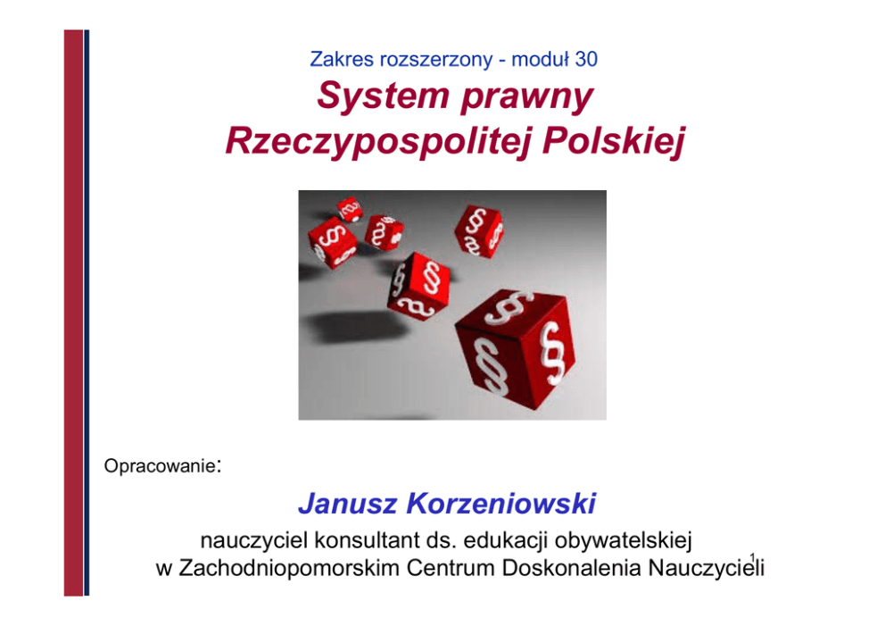 Zakres rozszerzony - moduł 30 System prawny Rzeczypospolitej Polskiej Opracowanie: Janusz Korzeniowski nauczyciel konsultant ds. edukacji obywatelskiej 1 w Zachodniopomorskim Centrum Doskonalenia Nauczycieli Spis slajdów • • • • Źródła prawa powszechnie obowiązującego: 3 – 11 Źródła prawa o charakterze wewnętrznym: 12 – 13 Zasada praworządności: 14 – 16 Konstytucyjne zasady organizacji i działania sądów w RP: 17 – 28 Bibliografia: 29 2 Źródła prawa powszechnie obowiązującego Konstytucja w systemie źródeł prawa zajmuje miejsce szczególne, jest bowiem ustawą zasadniczą. Jest ona najwyższym prawem Rzeczypospolitej Polskiej. Szczególne znaczenie Konstytucji wynika przede wszystkim z przedmiotu jej unormowań. Reguluje ona podstawy ustroju politycznego i społeczno-gospodarczego państwa, a także podstawowe wolności oraz prawa i obowiązki człowieka i obywatela. Obecna Konstytucja Rzeczypospolitej Polskiej została uchwalona przez Zgromadzenie Narodowe i przyjęta w referendum konstytucyjnym w 1997 r. Struktura i uprawnienia naczelnych organów państwa są oparte na zasadzie podziału władz. Władzę ustawodawczą sprawują w Polsce Sejm i Senat, władzę wykonawczą — Prezydent Rzeczypospolitej oraz Rada Ministrów (rząd), władzę sądowniczą sprawują zaś niezawisłe sądy i trybunały. 3 Źródła prawa powszechnie obowiązującego Konstytucja Szczególna rola Konstytucji wynika również z faktu, że w swej zasadniczej treści określa ona hierarchię pozostałych źródeł prawa, wytycza kierunki ustawodawstwa. Żaden akt normatywny nie może być sprzeczny z Konstytucją. Konstytucja jako ustawa zasadnicza różni się od ustaw zwykłych szczególnym trybem, w jakim jest uchwalana i zmieniana. Do jej zmiany potrzebna jest w Sejmie kwalifikowana większość dwóch trzecich głosów w obecności co najmniej połowy ustawowej liczby posłów, w Senacie zaś bezwzględna większość głosów w obecności co najmniej połowy ustawowej liczby senatorów. Toteż jest oczywiste, że zwykła ustawa nie może zmienić ani całej Konstytucji, ani poszczególnych jej postanowień. 4 Źródła prawa powszechnie obowiązującego Ustawy Naczelne miejsce po Konstytucji w systemie źródeł prawa zajmuje ustawa, uchwalana przez Sejm z udziałem Senatu. Żaden inny organ, oprócz Sejmu, nie jest władny wydawać ustawy. Ustawami są regulowane istotne zagadnienia o charakterze politycznym, społecznym i gospodarczym (np. prawa i obowiązki obywateli, podatki, zagadnienia prywatyzacji gospodarki). Inne akty normatywne muszą być zgodne z ustawami. Wydawane są w większości na podstawie ustaw i w celu ich wykonania. 5 Źródła prawa powszechnie obowiązującego Umowy międzynarodowe Jako źródło powszechnie obowiązującego prawa Konstytucja wymienia ratyfikowane umowy międzynarodowe. Umowy ratyfikuje i wypowiada Prezydent. W niektórych wypadkach (gdy umowa dotyczy np. pokoju, sojuszy, układów politycznych, wolności, praw lub obowiązków obywatelskich) ratyfikacja i wypowiedzenie takiej umowy wymagają uprzedniej zgody wyrażonej w ustawie. Konstytucja stanowi, że Rzeczpospolita Polska może na podstawie umowy międzynarodowej przekazać organizacji międzynarodowej lub organowi międzynarodowemu kompetencje władzy państwowej w niektórych sprawach. Zgoda na ratyfikację takiej umowy jest uchwalana przez Parlament kwalifikowaną większością głosów. Może także być uchwalana w referendum ogólnokrajowym. 6 Źródła prawa powszechnie obowiązującego Umowy międzynarodowe c.d. Po ogłoszeniu w Dzienniku Ustaw ratyfikowanej umowy międzynarodowej stanowi ona część krajowego porządku prawnego i jest bezpośrednio stosowana, chyba że stosowanie jej jest uzależnione od wydania ustawy. W myśl Konstytucji ratyfikowana za zgodą wyrażoną w ustawie umowa międzynarodowa ma pierwszeństwo przed ustawą, jeśli ustawy nie da się pogodzić z umową. Gdy ratyfikowana umowa konstytuuje organizację międzynarodową, prawo stanowione przez tę organizację jest stosowane bezpośrednio i ma pierwszeństwo w przypadku kolizji z ustawami. 7 Źródła prawa powszechnie obowiązującego Umowy międzynarodowe c.d. Toteż organy Unii Europejskiej stanowią wiele zróżnicowanych źródeł prawa, a w szczególności: rozporządzenia, stosowane bezpośrednio we wszystkich państwach członkowskich obowiązują zarówno państwa, jak ich obywateli, dyrektywy, wiążące państwa członkowskie, dające jednak adresatom wybór odpowiedniej drogi ich realizacji, decyzje indywidualne, adresowane bezpośrednio do określonych podmiotów, dla których są wiążące, zalecenia i opinie, formalnie niewiążące, zwykle powodujące jednak dostosowanie przepisów krajowych do zaleceń organów Unii. 8 Źródła prawa powszechnie obowiązującego Rozporządzenia Rozporządzenia są aktami normatywnymi wydawanymi w Polsce przez Prezydenta, Radę Ministrów, Prezesa Rady Ministrów oraz ministrów kierujących działami administracji rządowej. Rozporządzenia wydawać mogą również przewodniczący komitetów wchodzących w skład Rady Ministrów, a także Krajowa Rada Radiofonii i Telewizji. Warunkiem wydania rozporządzenia jest zamieszczenie w ustawie wyraźnego upoważnienia, zwanego delegacją ustawową, do wydania rozporządzenia w określonej dziedzinie. Treść rozporządzenia musi być utrzymana w granicach udzielonej delegacji. W stosunku do ustaw rozporządzenia mają charakter wykonawczy. Konkretyzują one i uszczegółowiają zagadnienia uprzednio ogólnie uregulowane w ustawach. 9 Źródła prawa powszechnie obowiązującego Akty prawne organów terenowych Źródłami powszechnie obowiązującego prawa są w Polsce również akty prawa miejscowego, jednak tylko na obszarze działania organów, które je ustanowiły. Prawem miejscowym są akty prawne wydawane zarówno przez organy samorządu (województwa, powiaty, gminy), jak i akty prawn