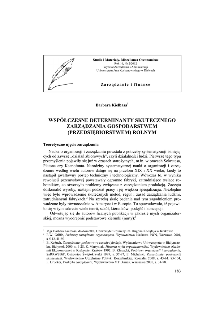 Studia i Materiały. Miscellanea Oeconomicae Rok 16, Nr 2/2012 Wydział Zarządzania i Administracji Uniwersytetu Jana Kochanowskiego w Kielcach Zarządzanie i finanse Barbara Kiełbasa1 WSPÓŁCZESNE DETERMINANTY SKUTECZNEGO ZARZĄDZANIA GOSPODARSTWEM (PRZEDSIĘBIORSTWEM) ROLNYM Teoretyczne ujęcie zarządzania Nauka o organizacji i zarządzaniu powstała z potrzeby systematyzacji istniejących od zawsze „działań zbiorowych”, czyli działalności ludzi. Pierwsze tego typu przemyślenia pojawiły się już w czasach starożytnych, m.in. w pracach Sokratesa, Platona czy Ksenofonta. Narodziny systematycznej nauki o organizacji i zarządzaniu według wielu autorów datuje się na przełom XIX i XX wieku, kiedy to nastąpił gwałtowny postęp techniczny i technologiczny. Wówczas to, w wyniku rewolucji przemysłowej powstawały ogromne fabryki, zatrudniające tysiące robotników, co stworzyło problemy związane z zarządzaniem produkcją. Zaczęto doskonalić wyroby, nastąpił podział pracy i jej większa specjalizacja. Niezbędne więc było wprowadzenie skutecznych metod, reguł i zasad zarządzania ludźmi, zatrudnianymi fabrykach.2 Na szeroką skalę badania nad tym zagadnieniem prowadzone były równocześnie w Ameryce i w Europie. To spowodowało, iż pojawiło się w tym zakresie wiele teorii, szkół, kierunków, podejść i koncepcji. Odwołując się do autorów licznych publikacji w zakresie myśli organizatorskiej, można wyodrębnić podstawowe kierunki (nurty):3 1 2 3 Mgr Barbara Kiełbasa, doktorantka, Uniwersytet Rolniczy im. Hugona Kołłątaja w Krakowie R.W. Griffin, Podstawy zarządzania organizacjami, Wydawnictwo Naukowe PWN, Warszawa 2004, s. 5-12, 41-65. B. Kożuch, Zarządzanie: podstawowe zasady i funkcje, Wydawnictwo Uniwersytetu w Białymstoku, Białystok 2000, s. 9-28, Z. Martyniak, Historia myśli organizatorskiej, Wydawnictwo Akademii Ekonomicznej w Krakowie, Kraków 1992, B. Klepacki, Podstawy organizacji i zarządzania, SnRRWSBiP, Ostrowiec Świętokrzyski 1999, s. 37-97, E. Michalski, Zarządzanie: podręcznik akademicki, Wydawnictwo Uczelniane Polityki Koszalińskiej, Koszalin 2008, s. 43-61, 85-104, P. Drucker, Praktyka zarządzania, Wydawnictwo MT Biznes, Warszawa 2005, s. 34-78. 183 − kierunek naukowego zarządzania (scientific managament), kreację podejścia klasycznego przypisuje się F.W. Taylorowi. Powstanie tzw. tayloryzmu zapoczątkowało zainteresowanie procesami zarządzania w dużych fabrykach. Istotne dla Taylora, jako badacza było ograniczanie przestojów w pracy i zbędnych ruchów ciała robotników. Spowodowało to, iż człowiek traktowany był przedmiotowo, − kierunek tzw. administracyjny – rozwijał się równolegle do kierunku inżynierskiego i nazywany jest „fayolowskim” (od nazwiska jego prekursora H. Fayola). Fayol pogrupował czynności administracyjne na następujące zestawy: przewidywanie, organizowanie, rozkazywanie, koordynowanie, kontrolowanie, które funkcjonują do dziś i traktowane są raczej jako funkcje kierownicze lub funkcje zarządzania, nie tylko w administracji ale we wszystkich jednostkach i organizacjach, − szkoła empiryczna (tzw. podejście sytuacyjne) – skupiała się na analizowaniu konkretnych przypadków (sytuacji) i wyciąganiu utylitarnych dla danego przypadku, przedsiębiorstwa czy organizacji wniosków. Nie zawsze więc są to stanowiska uniwersalne, mimo to mogą być niezmiernie przydatne. Podejście sytuacyjne różni się od klasycznego tym, iż koncentruje się na wykorzystaniu najlepszych sposobów, które sprawdziły się w praktyce. Z tego podejścia narodziła się koncepcja zarządzania strategicznego (strategic managament), − podejście behawioralne – bada stosunki międzyludzkie w organizacjach i zachowanie się ludzi (human relations, human behaviour). Podejście to czerpie m.in. z takich nauk jak psychologia, socjologia i komunikacja społeczna, − podejście współczesne (podejście systemowe) – punktem wyjścia jest definicja systemu, który oznacza zestaw elementów danej całości. Między elementami zachodzą różne interakcje: zależności pośrednie i bezpośrednie. Podejście to bierze pod uwagę złożoność procesów zachodzących w każdej organizacji, łącząc idee podejścia psychospołecznego i inżynierskiego, a także wiele innych aspektów, np. sytuację polityczną, kulturę, prawo, technikę, ekonomię czy ostatnio ekologię). Większość autorów umieszcza naukę o zarządzaniu w naukach społecznych, argumentując to tym, iż jej głównym celem jest badanie i analiza zorganizowanych procesów w różnych jednostkach zarządzanych przez ludzi4. Zarządzanie w praktyce Zgodnie z definicją Kożuch [2000] podstawowym zadaniem nauk o zarządzaniu jest diagnozowanie, wyjaśnianie i prognozowanie zjawisk zachodzących w 4 K. Koźmiński, W. Piotrowski, Zarządzanie: teoria i praktyka, Wydawnictwo Naukowe PWN, Warszawa 1996, s. 130-136. 184 rzeczywistości5. Przedmiotem badań tej nauki są przede wszystkim zależności zachodzące w działaniu zorganizowanym ludzi i zarządzanie tymi działaniami (procesami) w różnych organizacjach, mniej lub bardziej złożonych. Zarządzanie organizacją polega przede wszystkim na skutecznym realizowaniu założonych celów. Dlatego też zarządzanie powinno łączyć najlepsze praktyki znanych szkół, podejść i metod, które w efekcie pozwolą osiągnąć cel. W tym kontekście można rozumieć zarządzanie gospodarstwem lub przedsiębiorstwem rolnym, które szczególnie obecnie nabiera wyjątkowego znaczenia. Gospodarstwa rolne, które dostarczają produkty na rynek muszą sprostać ciągle rosnącym wymaganiom jakościowym i wymaganiom bezpieczeństwa żywności. Dodatkowo znaczna część wymogów ciążących na rolniku, jako dostarczycielu tzw. produktów pierwotnych obowiązuje na terenie całego gospodarstwa rolnego i przez cały rok kalendarzowy6. Dlatego też niezmiernie istotne staje si
