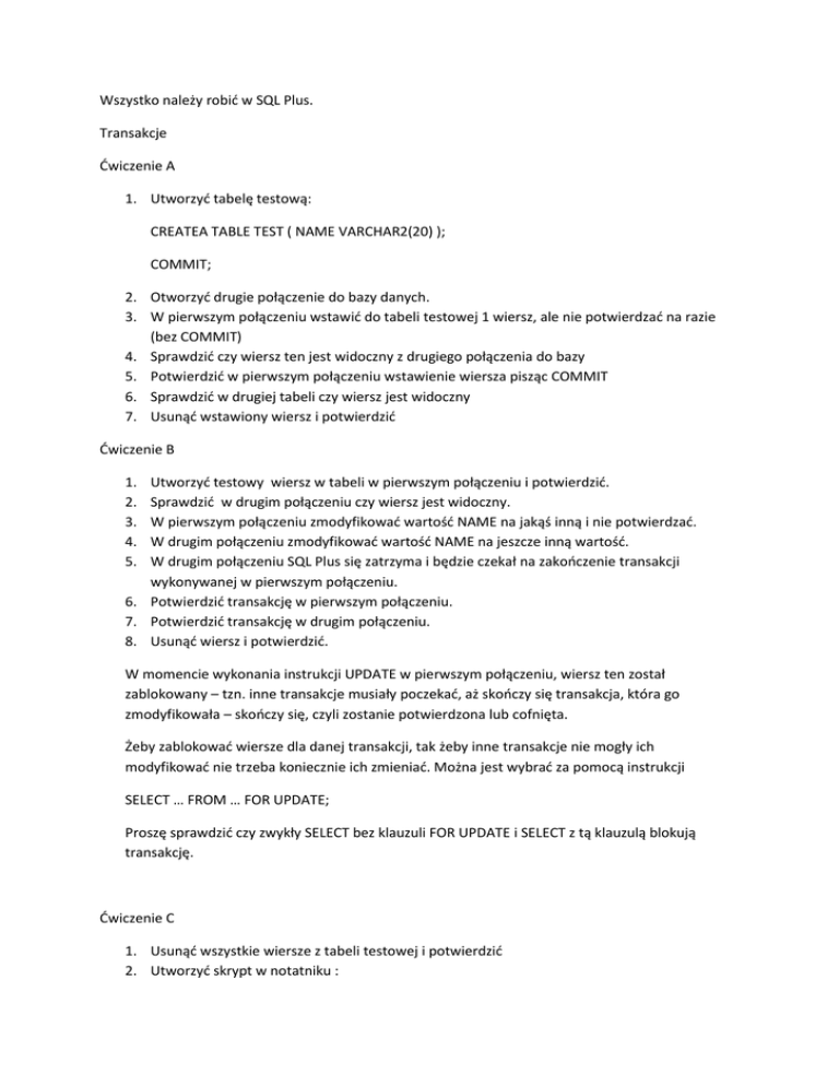Wszystko należy robid w SQL Plus. Transakcje Dwiczenie A 1