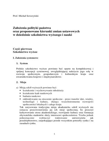 Prof. Michał Seweryński Założenia polityki państwa oraz proponowane kierunki zmian ustawowych w dziedzinie szkolnictwa wyższego i nauki Część pierwsza Szkolnictwo wyższe I. Założenia systemowe 1. System Polskie szkolnictwo wyższe powinno być oparte na kompleksowej i spójnej koncepcji systemowej, uwzględniającej należycie jego rolę w rozwoju społecznym, gospodarczym i kulturalnym kraju oraz uwarunkowania krajowe i międzynarodowe. 2. Misja a) Misją szkół wyższych powinno być: • kształcenie i wychowywanie młodzieży • kształcenie kadr naukowych • badania naukowe • oddziaływanie na otoczenie społeczne - przez transfer idei, wiedzy, technologii i kultury, służący wszechstronnemu rozwojowi społeczności lokalnych i całego kraju. Tak zarysowana tradycyjna misja akademicka szkół wyższych nie oznacza przeciwstawienia jej ich misji społecznej, bo przecież kultywowanie etosu akademickiego, rozwijanie kultury oraz formacja obywatelska studentów służy interesowi społeczeństwa. Trzeba jednak jednoznacznie wykluczyć traktowanie uniwersytetu jak przedsiębiorstwo, zaspokajające przede wszystkim potrzeby rynku i na zasadach rynku. 1 b) Misja szkół wyższych szkół musi być oparta na mocnym fundamencie aksjologicznym, ponieważ jego osłabienie jest jedną z głównych przyczyn kryzysu współczesnego uniwersytetu. Nie wystarczy przy tym zamieszczenie w ustawie konstytucyjnych zasad aksjologicznych, lecz konieczne jest podporządkowanie im konkretnych przepisów prawa o szkolnictwie wyższym. c) System szkolnictwa wyższego musi uwzględniać zachodzące w Polsce procesy gospodarcze i społeczne. Płyną stąd wyzwania dla kształtowania sieci szkół wyższych oraz zróżnicowania szczebli kształcenia. Trzeba też uwzględnić czynnik demograficzny, czyli postępujący spadek liczby kandydatów na studia. Z drugiej strony – należy wziąć pod uwagę wzrost zainteresowania studiami wyższymi wśród osób, które z różnych powodów nie podjęły ich bezpośrednio po maturze oraz osób pragnących uzupełnić lub uaktualnić wiedzę na studiach podyplomowych, bądź zmienić kwalifikacje zawodowe. Konieczne i możliwe jest także większe otwarcie się polskich uczelni na studentów zagranicznych, aczkolwiek mogą oni zwiększać konkurencję w ubieganiu się o studia na kierunkach najbardziej atrakcyjnych. 3. Kluczowa rola publicznych szkół wyższych w systemie szkolnictwa wyższego a) Szkoły publiczne muszą spełniać w systemie szkolnictwa wyższego rolę wiodącą, ponieważ Konstytucja nałożyła na władze publiczne obowiązek zapewnienia obywatelom powszechnego i równego dostępu do wykształcenia (art. 70 ust. 1 Konstytucji). Oczywiste jest również, że prowadzenie całościowej polityki edukacyjnej leży w interesie wspólnym obywateli, a zatem musi być domeną demokratycznego państwa, które ten interes realizuje. b) Konstytucja zapewnia obywatelom i instytucjom prawo zakładania niepublicznych szkół wyższych, wynikające z wolności wyboru przez rodziców dla swoich dzieci szkół innych niż publiczne (art. 70 ust. 3 Konstytucji). Skoro jednak zapewnienie powszechnego i równego dostępu do wykształcenia jest obowiązkiem państwa, a tworzenie szkół przez obywateli i instytucje – ich uprawnieniem, realizowanym według swobodnego uznania, to szkoły prywatne muszą pełnić w systemie szkolnictwa wyższego rolę uzupełniającą wobec szkół publicznych, w ustawowo określonych ramach. 2 4. Finansowanie szkolnictwa wyższego przez państwo a) Konsekwencją obywatelskiego prawa do dostępu do wykształcenia jest zobowiązanie państwa do ponoszenia kosztów prowadzenia szkół publicznych. Konstytucja przesądza o tym obowiązku wprost, deklarując bezpłatność nauki w szkołach publicznych. Dotyczy to także nauki w publicznych szkołach wyższych. Konstytucja pozwala bowiem tym szkołom na pobieranie opłat tylko za niektóre usługi edukacyjne, co oznacza, że zasadą jest finansowanie tych usług przez państwo (art. 70 ust. 2 Konstytucji), a pobieranie opłat za studia - wyjątkiem. b) Rozciągnięcie obowiązkowych opłat na wszystkich studentów szkół publicznych, chociażby ograniczonych (współpłatność) lub rozszerzenie pojęcia „niektórych usług edukacyjnych” ( np. na studia drugiego i trzeciego stopnia), byłoby nie do pogodzenia z Konstytucją. Ponadto, takie rozszerzenie opłat byłoby nie do udźwignięcia dla licznych rzesz polskiej młodzieży z rodzin o skromnych dochodach. W konsekwencji zmalałaby liczba studentów w Polsce (już malejąca ze względów demograficznych), co stworzyłoby zagrożenie dla naszych dążeń rozwojowych. 5. Powszechny i równy dostęp do studiów wyższych a) Zmiany zapoczątkowane przez ustawę o szkolnictwie wyższym z 1990 roku doprowadziły do spektakularnego wzrostu liczby studentów. Polska przeszła od szkolnictwa wyższego typu elitarnego do masowego. Ta zmiana pozostaje w związku ze wzrostem aspiracji edukacyjnych młodzieży, pod wpływem transformacji politycznej i gospodarczej, dokonującej się w naszym kraju. Odpowiedzią na te aspiracje było rozszerzenie oferty edukacyjnej przez uczelnie publiczne oraz lawinowy wzrost liczby niepublicznych szkół wyższych.1 b) Zasadą systemu szkolnictwa wyższego powinien być powszechny i równy dostęp do studiów wyższych, bo takie prawo przyznaje obywatelom Konstytucja. Realizacji tej zasady służy nie tylko bezpłatność studiów zadeklarowana w Konstytucji, lecz także ciążący na władzach publicznych konstytucyjny obowiązek udzielania 1 W roku akademickim 1990/1991 kształciło się w Polsce 390409 studentów natomiast w roku 2005/2006 - 1953832 studentów, a współczynnik skolaryzacji wyniósł 51,1% i był jednym z najwyższych w Europie. W następnych latach rozpoczął się powolny spadek liczby studentów ( w roku akademickim 2011/2012 było 1764060 studentów). Źródło: MNiSZW,