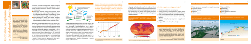 1 2 Ocieplenie widać także na dziesiąt kach tysięcy pojedynczych stacji obserwacyjnych. Analiza długiej i jednorodnej (ze względu na poło żenie niepodlegającej „obcym” wpływom) serii obserwacji na stacji meteorologicznej w Poczdamie pokazuje, że tempo wzrostu śred niej temperatury rocznej podczas ostatnich 25 lat (0,55oC na dekadę) było aż pięciokrotnie silniejsze niż w ciągu ostatnich 100 lat (0,11oC na dekadę). Prof. Zbigniew Kuncewicz, Członek Międzyrządowego Zespołu ds. Zmian Klimatu Działalność człowieka osiągnęła skalę globalną i wpływa na przyrodnicze systemy podtrzymujące życie na Ziemi. Przede wszystkim zmienia się klimat, co powodują głów nie dwa procesy: n ograniczanie terenów biologicznie czynnych, takich jak: lasy, łąki, pola, co powoduje zmniejszanie akumu lacji dwutlenku węgla w glebie i biomasie, a to z kolei wpływa destabilizująco na jego ilość w atmosferze, n drugi, ważniejszy, to wzrost emisji gazów cieplarnia nych do atmosfery wytwarzanych w procesach spalania paliw kopalnych, produkcji cementu i produkcji rolnej. Ilość gazów cieplarnianych w atmosferze jest bardzo waż na, bo wpływa na temperaturę na powierzchni Ziemi. W okresie przedprzemysłowym stężenie dwutlenku węgla wynosiło 272 ppm, czyli cząstek na milion. Obecnie wynosi ono niemal 400 ppm, ale naukowcy prognozują, że w 2015 r. będzie kilka miesięcy w których stężenie CO2 przekroczy tę wartość. W skutek tego, w ciągu minionych 130 lat, średnia temperatura na Ziemi wzrosła o 0,85oC. Pozornie wydaje się to wielkością nieznaczną, ale ta niewielka zmiana wywołuje poważne skutki, które już daje się zauważyć i odczuć. W efekcie koniec XX i początek XXI w. to najcie plejszy okres w ostatnim tysiącu lat dziejów Ziemi. Część promieniowania długofalowego (cieplnego) uchodząca w przestrzeń międzyplanetarną IEPLARNIAN ZY C E GA para wodna, CO2, CH4, O3, N2O, freony, halony i inne Krótkofalowe promieniowanie słoneczne ogrzewające Ziemię Długofalowe promieniowanie cieplne odbite od powierzchni Ziemi Powierzchnia Ziemi Część długofalowego promieniowania cieplnego odbitego przez gazy cieplarniane i dodatkowo nagrzewającego powierzchnię Ziemi Zdaniem Międzyrządowego Panelu ds. Zmian Klimatu, taki wzrost jest niezgodny z typowymi procesami zachodzący mi w przyrodzie. W opublikowanym w 2014 r. raporcie zespół stwierdza, że z 96-procentowym prawdopodobień stwem za postępujące zmiany klimatu odpowiedzialny jest człowiek. Jak twierdzi prof. Zbigniew Kuncewicz, członek zespołu: Jeżeli nie ograniczy się emisji gazów cieplarnia nych, to – zgodnie z najczarniejszym scenariuszem – w końcu XXI w. temperatura może wzrosnąć nawet o 6oC w stosunku do okresu przedprzemysłowego. To jest o 1oC więcej niż pomiędzy okresem zlodowacenia a czasem między zlodowaceniami. Naturalny efekt cieplarniany powoduje, że średnia global na temperatura powietrza wynosi około +15oC, co umożli wia istnienie życia na Ziemi. Gdyby tych gazów w atmosfe rze nie było, temperatura byłaby o około 33oC niższa, czyli wynosiłaby –18oC i życie na Ziemi nie mogłoby istnieć. Emisja gazów cieplarnianych na świecie w latach 1970–2010 i prog noza emisji do 2050 przy zachowaniu obecnej polityki klimatycznej. Zielona kropka oznacza cel redukcyjny, który powinien być osiągnięty, by wzrost średniej temperatury był utrzymany poniżej 2°C, co wyma ga intensyfikacji działań. ADAPTACJA DO ZMIAN KLIMATU Adaptacja wg Międzyrządowego Panelu ds. Zmian Klimatu to dostosowanie systemów naturalnych lub stworzonych przez człowieka do obecnych, lub spodziewanych czynni ków klimatycznych lub efektów zmian klimatu, w taki spo sób, aby minimalizować negatywne skutki i wykorzystywać zmiany pozytywne. Przewidywane, przy założeniu braku działań, zmiany w temperaturze przy powierzchni Ziemi w końcu XXI w. w porównaniu z okresem 1986–2005 r. 80 4 sektory narażone na zmiany klimatu Jak należy przygotować strategię adaptacyjną? n identyfikacja problemów do rozwiązania, n analiza i propozycja podejmowanych działań adapta cyjnych biorąc pod uwagę różne strategie ich wdrażania, n ocena kosztów oraz zysków jak i kosztów zaniechania, n przygotowanie instrumentów wdrażania działań adap tacyjnych, n włączenie różnych grup do procesu przygotowania strategii, n przyjęcie dokumentu strategii adaptacyjnej. W Polsce do sektorów narażonych na zmiany klimatu należą: n gospodarka wodna n ochrona wybrzeża n rolnictwo n ochrona zdrowia Niew ielk a zmian a temp er at ur y glob aln ej wyw oł uj e pow ażn e skutk i, któr e już daj e się zau waż yć i odc zuć Kluczowe obszary dla Polski n Wybrzeże Bałtyku n Wielkopolska n Obszary górskie n Gminy na terenach zalewowych n Metropolie Obszary zagrożone zalaniem przez powodzie morskie Morze Bałtyckie Gton CO2 eq Globalne ocieplenie a działalność człowieka Efekt cieplarniany 3 Słowiński Park Narodowy 60 W rezultacie ocieplania się klimatu i związanego z tym pod niesienia się poziomu oceanu (w minionym stuleciu wzrost o blisko 20 cm), Tuvalu może w znacznej części znaleźć się pod wodą. Według badań ONZ ma to nastąpić do 2050 roku. My nie chcemy opuszczać tego miejsca. My nie chcemy się przenosić, to nasza ziemia, dana nam przez Boga, to nasza kultura, my nie możemy się przenieść. Ludzie nie chcą opusz czać wyspy aż do ostatniej chwili. 40 20 1970 1990 2010 2030 2050 Źródło: PBL Netherlands Environmental Assessment Agency, raport Roads from Rio+20 Pathways to achieve global sustainability goals by 2050, czerwiec 2012. Źródło: IPCC Fifth Assessment Report: Climate Change 2014. Impacts, Adaptation, and Vulnerability Dramatyczne słowa Paani Laupepa b. Wiceministra Zasobów Naturalnych, Energetyki i Środowiska Tuvalu Nadmorski Park Krajobrazowy Jez. Łebsko Jez. Gardno Jez. Kopań Jez. Bukowo Jez. Jamno Jez. Resko Przymorskie