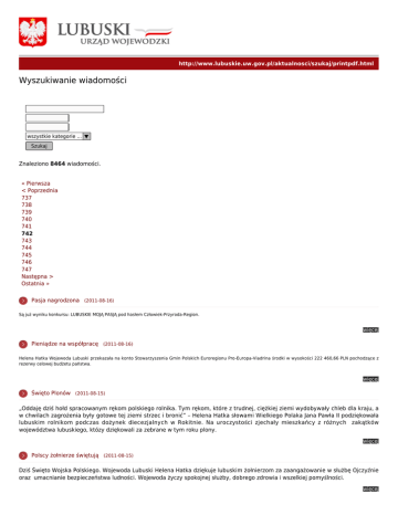 http://www.lubuskie.uw.gov.pl/aktualnosci/szukaj/printpdf.html Wyszukiwanie wiadomości wszystkie kategorie ... ▼ Szukaj Znaleziono 8464 wiadomości. « Pierwsza < Poprzednia 737 738 739 740 741 742 743 744 745 746 747 Następna > Ostatnia » Pasja nagrodzona (2011-08-16) Są już wyniku konkursu: LUBUSKIE MOJĄ PASJĄ pod hasłem Człowiek-Przyroda-Region. więcej Pieniądze na współpracę (2011-08-16) Helena Hatka Wojewoda Lubuski przekazała na konto Stowarzyszenia Gmin Polskich Euroregionu Pro-Europa-Viadrina środki w wysokości 222 460,66 PLN pochodzące z rezerwy celowej budżetu państwa. więcej Święto Plonów (2011-08-15) „Oddaję dziś hołd spracowanym rękom polskiego rolnika. Tym rękom, które z trudnej, ciężkiej ziemi wydobywały chleb dla kraju, a w chwilach zagrożenia były gotowe tej ziemi strzec i bronić” – Helena Hatka słowami Wielkiego Polaka Jana Pawła II podziękowała lubuskim rolnikom podczas dożynek diecezjalnych w Rokitnie. Na uroczystości zjechały mieszkańcy z różnych zakątków województwa lubuskiego, któzy dziękowali za zebrane w tym roku plony. więcej Polscy żołnierze świętują (2011-08-15) Dziś Święto Wojska Polskiego. Wojewoda Lubuski Helena Hatka dziękuje lubuskim żołnierzom za zaangażowanie w służbę Ojczyźnie oraz umacnianie bezpieczeństwa ludności. Wojewoda życzy spokojnej służby, dobrego zdrowia i wszelkiej pomyślności. więcej Maluch (2011-08-12) Do 16 sierpnia w Lubuskim Urzędzie Wojewódzkim można składać wnioski na realizację projektów w ramach rządowego programu „Maluch”. 300 tysięcy złotych w ramach poprzedniej tury konkursu otrzyma Szprotawa. więcej Jakie wnioski z Przystanku Woodstock? (2011-08-10) 1,3 tysiąca litrów oddanej krwi, ponad 1,5 tysiąca osób ze służb, inspekcji pracujących przy zabezpieczeniu oraz 700 tysięcy uczestników to krótki bilans XVII Przystanku Woodstock. W Lubuskim Urzędzie Wojewódzkim odbyło się podsumowanie imprezy, w którym uczestniczyli przedstawiciele służb odpowiedzialnych za bezpieczeństwo podczas festiwalu. więcej Dobrze wyposażeni (2011-08-10) Namioty pneumatyczne i agregaty prądotwórcze o wartości prawie 200 tysięcy złotych odebrali samorządowcy z naszego województwa. więcej MSWiA na Przystanku Woodstock (2011-08-08) Na terenie Przystanku Woodstock działało miasteczko policyjne, w którym młodzież mogła zdobyć wiedzę m.in. na temat ruchu drogowego i bezpiecznego wypoczynku nad wodą oraz wziąć udział w konkursie. Podczas akcji, której organizatorem było Ministerstwo Spraw Wewnętrznych i Administracji, promowano bezpieczne zachowania w ramach rządowego programu „Razem Bezpieczniej”. więcej Przystanek Woodstock z lotu ptaka (2011-08-05) Zapraszamy do zapoznania się z galerią, w której są zdjęcia lotnicze XVII Przystanku Woodstock. więcej Fair Play (2011-08-05) Przystanek Woodstock to nie tylko muzyka. W tym roku festiwal stał się miejscem odsłonięcia pucharu, który zostanie wręczony zwycięzcy EURO 2012. więcej « Pierwsza < Poprzednia 737 738 739 740 741 742 743 744 745 746 747 Następna > Ostatnia »