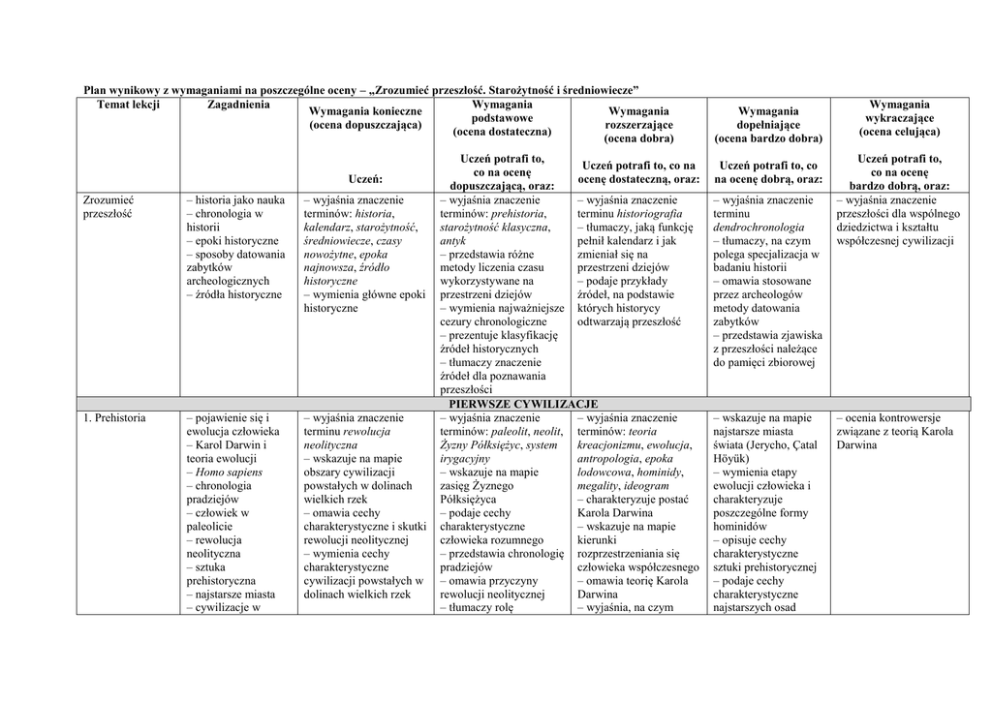 Plan wynikowy z wymaganiami na poszczególne oceny – „Zrozumieć przeszłość. Starożytność i średniowiecze” Temat lekcji Zagadnienia Wymagania Wymagania konieczne Wymagania podstawowe (ocena dopuszczająca) rozszerzające (ocena dostateczna) (ocena dobra) Uczeń: Zrozumieć przeszłość – historia jako nauka – chronologia w historii – epoki historyczne – sposoby datowania zabytków archeologicznych – źródła historyczne – wyjaśnia znaczenie terminów: historia, kalendarz, starożytność, średniowiecze, czasy nowożytne, epoka najnowsza, źródło historyczne – wymienia główne epoki historyczne 1. Prehistoria – pojawienie się i ewolucja człowieka – Karol Darwin i teoria ewolucji – Homo sapiens – chronologia pradziejów – człowiek w paleolicie – rewolucja neolityczna – sztuka prehistoryczna – najstarsze miasta – cywilizacje w – wyjaśnia znaczenie terminu rewolucja neolityczna – wskazuje na mapie obszary cywilizacji powstałych w dolinach wielkich rzek – omawia cechy charakterystyczne i skutki rewolucji neolitycznej – wymienia cechy charakterystyczne cywilizacji powstałych w dolinach wielkich rzek Uczeń potrafi to, Uczeń potrafi to, co na co na ocenę ocenę dostateczną, oraz: dopuszczającą, oraz: – wyjaśnia znaczenie – wyjaśnia znaczenie terminów: prehistoria, terminu historiografia starożytność klasyczna, – tłumaczy, jaką funkcję antyk pełnił kalendarz i jak – przedstawia różne zmieniał się na metody liczenia czasu przestrzeni dziejów wykorzystywane na – podaje przykłady przestrzeni dziejów źródeł, na podstawie – wymienia najważniejsze których historycy cezury chronologiczne odtwarzają przeszłość – prezentuje klasyfikację źródeł historycznych – tłumaczy znaczenie źródeł dla poznawania przeszłości PIERWSZE CYWILIZACJE – wyjaśnia znaczenie – wyjaśnia znaczenie terminów: paleolit, neolit, terminów: teoria Żyzny Półksiężyc, system kreacjonizmu, ewolucja, irygacyjny antropologia, epoka – wskazuje na mapie lodowcowa, hominidy, zasięg Żyznego megality, ideogram Półksiężyca – charakteryzuje postać – podaje cechy Karola Darwina charakterystyczne – wskazuje na mapie człowieka rozumnego kierunki – przedstawia chronologię rozprzestrzeniania się pradziejów człowieka współczesnego – omawia przyczyny – omawia teorię Karola rewolucji neolitycznej Darwina – tłumaczy rolę – wyjaśnia, na czym Wymagania dopełniające (ocena bardzo dobra) Uczeń potrafi to, co na ocenę dobrą, oraz: – wyjaśnia znaczenie terminu dendrochronologia – tłumaczy, na czym polega specjalizacja w badaniu historii – omawia stosowane przez archeologów metody datowania zabytków – przedstawia zjawiska z przeszłości należące do pamięci zbiorowej – wskazuje na mapie najstarsze miasta świata (Jerycho, Çatal Höyük) – wymienia etapy ewolucji człowieka i charakteryzuje poszczególne formy hominidów – opisuje cechy charakterystyczne sztuki prehistorycznej – podaje cechy charakterystyczne najstarszych osad Wymagania wykraczające (ocena celująca) Uczeń potrafi to, co na ocenę bardzo dobrą, oraz: – wyjaśnia znaczenie przeszłości dla wspólnego dziedzictwa i kształtu współczesnej cywilizacji – ocenia kontrowersje związane z teorią Karola Darwina dolinach wielkich rzek – powstanie cywilizacji 2. Mezopotamia i jej dzieje – warunki naturalne Mezopotamii – pochodzenie Sumerów – cywilizacja Sumerów – imperium Akadów – Babilonia i jej dzieje – Kodeks Hammurabiego – Asyria i jej dzieje – społeczeństwa i państwa Mezopotamii – wierzenia religijne i osiągnięcia cywilizacyjne ludów Mezopotamii – pismo klinowe – architektura i sztuka Mezopotamii – wyjaśnia znaczenie terminów: Międzyrzecze, Sumerowie, kodeks, Kodeks Hammurabiego, politeizm, pismo klinowe – charakteryzuje postać Hammurabiego – wskazuje na mapie obszar Międzyrzecza – wymienia cechy charakterystyczne cywilizacji Sumerów – wyjaśnia znaczenie pisma dla rozwoju cywilizacji Mezopotamii 3. Cywilizacja egipska – warunki naturalne Egiptu – początki cywilizacji – wyjaśnia znaczenie terminów: faraon, piramida, mumifikacja, pierwszych miast – opisuje przyczyny powstania cywilizacji w dolinach wielkich rzek – wymienia i omawia etapy powstania cywilizacji w dolinach wielkich rzek – wyjaśnia znaczenie terminów: zikkurat, imperium, Babilon, Asyria – określa czas: rozwoju cywilizacji Sumerów (IV–III tysiąclecie p.n.e.), spisania Kodeksu Hammurabiego (XVIII w. p.n.e.) – charakteryzuje postać Sargona Wielkiego – wskazuje na mapie siedziby Sumerów, Babilon – opisuje warunki naturalne Mezopotamii – przedstawia panowanie Hammurabiego – omawia Kodeks Hammurabiego – podaje cechy charakterystyczne państw i społeczeństw Mezopotamii – wymienia osiągnięcia cywilizacyjne ludów Międzyrzecza – wyjaśnia znaczenie terminów: katarakta, wezyr, „Księga polegała ewolucja człowieka – opisuje tryb życia społeczeństw w paleolicie miejskich – wyjaśnia znaczenie terminów: Akadowie, prawo talionu, muszkeni – charakteryzuje postać Nabuchodonozora II – wskazuje na mapie Akad, Asyrię, największy zasięg państw: babilońskiego i asyryjskiego – omawia okoliczności powstania i cechy charakterystyczne imperium akadyjskiego – określa kierunki ekspansji Babilonii i Asyrii – przedstawia okoliczności powstania oraz upadku imperiów: babilońskiego i asyryjskiego – opisuje wierzenia religijne ludów Mezopotamii – charakteryzuje architekturę i sztukę Mezopotamii – wyjaśnia znaczenie terminów: nom, nomarcha, Hetyci, pismo – wyjaśnia znaczenie terminu „Epos o Gilgameszu” – określa czas rozwoju poszczególnych cywilizacji na terenie Mezopotamii oraz daty: zdobycia Babilonu przez Persów (539 r. p.n.e.), upadku Asyrii (614 r. p.n.e.) – charakteryzuje postać Asurbanipala – wymienia et