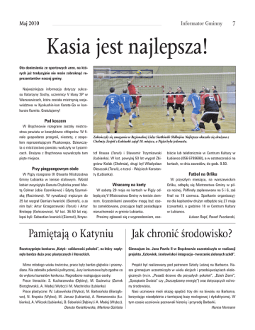 Maj 2010 Informator Gminny 7 Kasia jest najlepsza! Oto doniesienia ze sportowych aren, na których już tradycyjnie nie może zabraknąć reprezentantów naszej gminy. Najważniejsza informacja dotyczy sukcesu Katarzyny Sochy, uczennicy V klasy SP w Warszewicach, która została mistrzynią województwa w Kyokushin-kan Karate-Go w konkursie Kumite. Gratulujemy! Pod koszem W Brąchnowie rozegrane zostały mistrzostwa powiatu w koszykówce chłopców. W finale gospodarze przegrali, niestety, z zespołem reprezentującym Pluskowęsy. Dziewczęta o mistrzostwo powiatu walczyły w Łysomicach. Drużyna z Brąchnowa wywalczyła tam piąte miejsce. Przy pingpongowym stole W Pigży rozegrano IX Otwarte Mistrzostwa Gminy Łubianka w tenisie stołowym. Wśród kobiet zwyciężyła Danuta Chybicka przed Martą Celmer (obie Czernikowo) i Edytą Szymańską (Raciniewo). W rywalizacji mężczyzn do 35 lat wygrał Damian Iwanicki (Siemoń), a za nim byli: Artur Grzegorzewski (Toruń) i Artur Brokopp (Kończewice). W kat. 36-50 lat najlepsi byli: Sebastian Iwanicki (Siemoń), Krzysz- Zakończyly się zmagania w Regionalnej Lidze Siatkówki Oldbojów. Najlepsza okazała się drużyna z Chełmży. Zespół z Łubianki zajął 10. miejsce, a Pigża była jedenasta. tof Krause (Toruń) i Sławomir Trzymkowski (Łubianka). W kat. powyżej 50 lat wygrał Zbigniew Kielak (Chełmża), drugi był Władysław Oleszczak (Toruń), a trzeci - Wojciech Konstanty (Łubianka). Wracamy na korty W sobotę 29 maja na kortach w Pigży odbędą się V Mistrzostwa Gminy w tenisie ziemnym. Uczestnikami zawodów mogą być osoby zameldowane, pracujące bądź posiadające nieruchomość w gminie Łubianka. Prosimy zgłaszać się z wyprzedzeniem, oso- biście lub telefonicznie w Centrum Kultury w Łubiance (056 6788698), a w ostateczności na kortach, w dniu zawodów, do godz. 9.50. Futbol na Orliku W przyszłym miesiącu, na warszewickim Orliku, odbędą się Mistrzostwa Gminy w piłce nożnej. Półfinały zaplanowano na 5 i 6, zaś finał na 19 czerwca. Spotkanie organizacyjne dla kapitanów drużyn odbędzie się 27 maja (czwartek), o godzinie 18 w Centrum Kultury w Łubiance. Łukasz Rząd, Paweł Puczkarski, Pamiętają o Katyniu Jak chronić środowisko? Rozstrzygnięto konkursu „Katyń - solidarność pokoleń”, na który napłynęło bardzo dużo prac plastycznych i literackich. Gimnazjum im. Jana Pawła II w Brąchnowie uczestniczyło w realizacji projektu „Człowiek, środowisko i integracja - tworzenie zielonych szkół”. Mimo młodego wieku twórców, prace były bardzo głębokie i przemyślane. Nie zabrakło polemiki politycznej. Jury konkursowe było zgodne co do wyboru laureatów konkursu. Nagrodzono następujące osoby: Prace literackie: S. Kucharzewska (Dębiny), M. Guziewicz (Zamek Bierzgłowski), A. Madej (Wybcz) i M. Machnicka (Łubianka) Prace plastyczne: W. Lubawińska (Wybcz), M. Bartosińska (Bierzgłowo), N. Krupska (Wybcz), M. Janusz (Łubianka), A. Romanowska (Łubianka), A. Wilczek (Łubianka), B. Sobański (Dębiny) i A. Madej (Wybcz). Danuta Kwiatkowska, Marlena Gizińska Projekt był realizowany pod patronem Szkoły Leśnej na Barbarce. Nasze gimnazjum uczestniczyło w wielu akcjach i przedsięwzięciach ekologicznych (m.in. „Posadź drzewo dla przyszłych pokoleń”, „Dzień Ziemi”, „Sprzątanie Świata” czy „Oszczędzamy energię”) oraz dotyczących ochrony środowiska. Nasi uczniowie mieli okazję spędzić trzy dni na biwaku na Barbarce, korzystając nieodpłatnie z tamtejszej bazy noclegowej i dydaktycznej. W tym czasie uczniowie poznawali historię i przyrodę Barbarki. Hanna Hermann