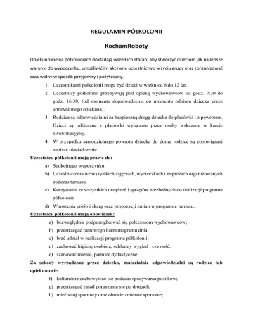 REGULAMIN PÓŁKOLONII KochamRoboty Opiekunowie na półkoloniach dokładają wszelkich starań, aby stworzyć dzieciom jak najlepsze warunki do wypoczynku, umożliwić im aktywne uczestnictwo w życiu grupy oraz zorganizować czas wolny w sposób przyjemny i pożyteczny. 1. Uczestnikami półkolonii mogą być dzieci w wieku od 6 do 12 lat. 2. Uczestnicy półkolonii przebywają pod opieką wychowawców od godz. 7:30 do godz. 16:30, (od momentu doprowadzenia do momentu odbioru dziecka przez uprawnionego opiekuna). 3. Rodzice są odpowiedzialni za bezpieczną drogę dziecka do placówki i z powrotem. Dzieci są odbierane z placówki wyłącznie przez osoby wskazane w karcie kwalifikacyjnej. 4. W przypadku samodzielnego powrotu dziecka do domu rodzice są zobowiązani napisać oświadczenie. Uczestnicy półkolonii mają prawo do: a) Spokojnego wypoczynku. b) Uczestniczenia we wszystkich zajęciach, wycieczkach i imprezach organizowanych podczas turnusu. c) Korzystania ze wszystkich urządzeń i sprzętów niezbędnych do realizacji programu półkolonii. d) Wnoszenia próśb i skarg oraz propozycji zmian w programie turnusu. Uczestnicy półkolonii mają obowiązek: a) bezwzględnie podporządkować się poleceniom wychowawców; b) przestrzegać ramowego harmonogramu dnia; c) brać udział w realizacji programu półkolonii; d) zachować higienę osobistą, schludny wygląd i czystość; e) szanować mienie, pomoce dydaktyczne; Za szkody wyrządzone przez dziecko, materialnie odpowiedzialni są rodzice lub opiekunowie. f) kulturalnie zachowywać się podczas spożywania posiłków; g) przestrzegać zasad poruszania się po drogach; h) mieć strój sportowy oraz obuwie zmienne sportowe; Każdego uczestnika obowiązują następujące reguły: Za szkody spowodowane przez uczestnika w placówce lub podczas wycieczek odpowiadają rodzice lub prawni opiekunowie. Samowolne oddalenie się od opiekunów, niesubordynacja, niezdyscyplinowanie, niewykonywanie poleceń wychowawców, nieprzestrzeganie regulaminu będzie karane upomnieniem, naganą a w ostateczności wykluczeniem uczestnika z udziału w półkoloniach oraz niezwróceniem płatności za niewykorzystaną część turnusu. Organizatorzy zastrzegają sobie prawo do zastosowania środków dyscyplinarnych w stosunku do uczestników (włącznie ze skreśleniem z listy uczestników półkolonii oraz niezwróceniem płatności za niewykorzystaną część turnusu) w przypadku rażącego łamania zasad uczestnictwa w półkoloniach. Rodzice lub opiekunowie mają obowiązek: - Dokonać wpłaty zaliczki w wysokości 100 zł w ramach potwierdzenia wpisania dziecka na listę uczestników. W przypadku rezygnacji z turnusu zaliczka nie jest zwracana. - Dokonać wpłaty pozostałej kwoty za turnus najpóźniej na 14 dni przed jego rozpoczęciem. Brak wpłaty będzie oznaczać rezygnację z turnusu. Nr konta: PKO BP 75 1020 1332 0000 1302 0963 6715 Tytułem: imię, nazwisko DZIECKA i wybrany turnus W związku z ubezpieczeniem NNW, które zawarte jest w cenie za turnus rodzice wyrażają zgodę na przetwarzanie danych osobowych dziecka, w celu oceny ryzyka, obsługi i wykonania umowy ubezpieczenia. Podanie danych jest dobrowolne, ale niezbędne do zawarcia umowy. Przysługuje Pani/Panu prawo dostępu do treści danych i prawo ich poprawiania. W przypadku niezebrania minimalnej ilości uczestników na turnus Organizator zastrzega sobie prawo do odwołania turnusu z całkowitym zwrotem kosztów. Z treścią powyższego regulaminu zapoznałam/łem się, przyjmuję do wiadomości i akceptuję jego treść. Data …………………. Czytelny podpis …………………………..