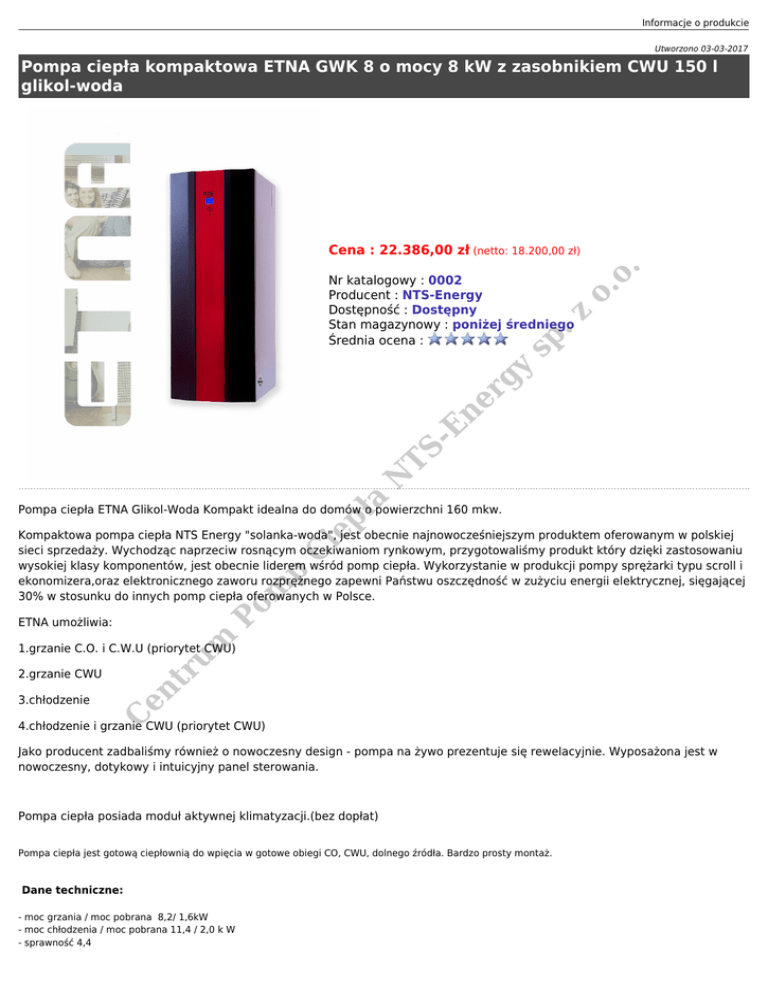 Informacje o produkcie Utworzono 03-03-2017 Pompa ciepła kompaktowa ETNA GWK 8 o mocy 8 kW z zasobnikiem CWU 150 l glikol-woda a N TS -E ne rg y sp .z o. o Nr katalogowy : 0002 Producent : NTS-Energy Dostępność : Dostępny Stan magazynowy : poniżej średniego Średnia ocena : . Cena : 22.386,00 zł (netto: 18.200,00 zł) ie pł Pompa ciepła ETNA Glikol-Woda Kompakt idealna do domów o powierzchni 160 mkw. Po m p C Kompaktowa pompa ciepła NTS Energy "solanka-woda", jest obecnie najnowocześniejszym produktem oferowanym w polskiej sieci sprzedaży. Wychodząc naprzeciw rosnącym oczekiwaniom rynkowym, przygotowaliśmy produkt który dzięki zastosowaniu wysokiej klasy komponentów, jest obecnie liderem wśród pomp ciepła. Wykorzystanie w produkcji pompy sprężarki typu scroll i ekonomizera,oraz elektronicznego zaworu rozprężnego zapewni Państwu oszczędność w zużyciu energii elektrycznej, sięgającej 30% w stosunku do innych pomp ciepła oferowanych w Polsce. um ETNA umożliwia: 1.grzanie C.O. i C.W.U (priorytet CWU) en tr 2.grzanie CWU C 3.chłodzenie 4.chłodzenie i grzanie CWU (priorytet CWU) Jako producent zadbaliśmy również o nowoczesny design - pompa na żywo prezentuje się rewelacyjnie. Wyposażona jest w nowoczesny, dotykowy i intuicyjny panel sterowania. Pompa ciepła posiada moduł aktywnej klimatyzacji.(bez dopłat) Pompa ciepła jest gotową ciepłownią do wpięcia w gotowe obiegi CO, CWU, dolnego źródła. Bardzo prosty montaż. Dane techniczne: - moc grzania / moc pobrana 8,2/ 1,6kW - moc chłodzenia / moc pobrana 11,4 / 2,0 k W - sprawność 4,4 - zasilanie 230V lub 400V - produkcja CWU 230 l/h - głośność 40 dB - wymiary 790 x 610 x 1720 - waga 182kg Wyposażenie: o. o . nowoczesna sprężarka scroll, ekologiczny czynnik roboczy: R410A, pompa obiegowa górnego źródła, wymienniki ciepła płytowy z wysokogatunkowej stali nierdzewnej, zawór 3-drogowy, zawór 4-drogowy, zawór rozprężny EEV, manometr wysokiego i niskiego ciśnienia, presostaty, dotykowy panel sterowania, zasobnik CWU 150 litrów z wbudowaną grzałką elektryczna 2 kW C en tr um Po m p C ie pł a N TS -E ne rg y sp .z Gwarancja producenta 2 lata.