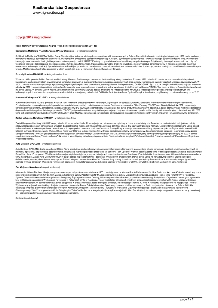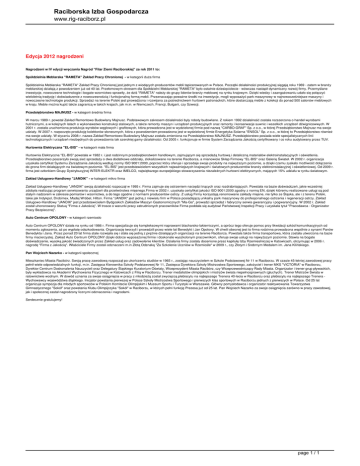 Raciborska Izba Gospodarcza www.rig-raciborz.pl Edycja 2012 nagrodzeni Nagrodzeni w IV edycji wręczania Nagród "Filar Ziemi Raciborskiej" za rok 2011 to: Spółdzielnia Meblarska "RAMETA" Zakład Pracy Chronionej - w kategorii duża firma Spółdzielnia Meblarska "RAMETA" Zakład Pracy Chronionej jest jednym z wiodących producentów mebli tapicerowanych w Polsce. Początki działalności produkcyjnej sięgają roku 1969 - zatem w branży meblarskiej działają z powodzeniem już od 40 lat. Przełomowym okresem dla Spółdzielni Meblarskiej "RAMETA" było ostatnie dziesięciolecie - wówczas nastapił dynamiczny rozwój firmy. Przemyślane inwestycje, nowoczesne technologie i bogate wzornictwo sprawiły, że dziś "RAMETA" należy do grupy liderów branży meblowej na rynku krajowym. Dzięki wiedzy i zaangażowaniu udało się połączyć wieloletnią tradycję i doświadczenie z nowoczesnością i funkcjonalną formą mebli. Przeznaczając poważne środki na inwestycje, mogli wyposażyć park maszynowy w najnowocześniejsze maszyny i nowoczesne technologie produkcji. Sprzedaż na terenie Polski jest prowadzona i rozwijana za pośrednictwem hurtowni patronackich, które dostarczają meble z kolekcji do ponad 500 salonów meblowych w kraju. Meble można kupić także zagranicą w takich krajach, jak m.in. w Niemczech, Francji, Bułgarii, czy Szwecji. Przedsiębiorstwo MAJNUSZ - w kategorii średnia firma W marcu 1989 r. powstał Zakład Remontowo Budowlany Majnusz. Podstawowym zakresem działalności były roboty budowlane. Z rokiem 1992 działalność została rozszerzona o handel wyrobami hutnicznymi, a w kolejnych latach o wykonawstwo konstrukcji stalowych, a także remonty maszyn i urządzeń produkcyjnych oraz remonty i konserwacje suwnic i wszelkich urządzeń dźwignicowwych. W 2001 r. została uruchomiona produkcja wyrobów węglowych i grafitowych, która prowadzona jest w wydzielonej firmie pod nazwą "CARBO-GRAF" Sp. z o.o., w której Przedsiębiorstwo Majnusz ma swoje udziały. W 2007 r. rozpoczęto produkcję kolektorów słonecznych, która z powodzeniem prowadzona jest w wydzielonej firmie Energetyka Solarna "ENSOL" Sp. z o.o., w której to Przedsiębiorstwo również ma swoje udziały. W styczniu 2008 r. nazwa Zakład Remontowo Budowlany Majnusz została zmieniona na Przedsiębiorstwo MAJNUSZ. Przedsiębiorstwo posiada wiele specjalistycznych linii technologicznych i urządzeń niezbędnych do prowadzenia tak szerokiej gamy działalności. Od 2005 r. funkcjonuje w firmie System Zarządzania Jakością certyfikowany i co roku audytowany przez TUV. Hurtownia Elektryczna "EL-BIS" - w kategorii mała firma Hurtownia Elektryczna "EL-BIS" powstała w 1982 r. i jest rodzinnym przedsiębiorstwem handlowym, zajmującym się sprzedażą hurtową i detaliczną materiałów elektroinstalacyjnych i oświetlenia. Przedsiębiorstwo poszerzyło swoją sieć sprzedaży o dwa dodatkowe oddziały, zlokalizowane na terenie Raciborza, a mianowicie Sklep Firmowy "EL-BIS" oraz Galerię Świateł. W 2002 r. organizacja uzyskała certyfikat Systemu Zarządzania Jakością według normy ISO 9001:2000, poprzez który oferuje i sprzedaje swoje produkty na najwyższym poziomie, a dzięki czemu zyskało możliwość dołączenia do grona firm działających na światowym poziomie. "EL-BIS" jest przedstawicielem wszystkich najważniejszych krajowych i światowych producentów branży elektroinstalacyjnej i oświetleniowej. Od 2009 r. firma jest członkiem Grupy Dystrybucyjnej INTER-ELEKTR oraz IMELCO, największego europejskiego stowarzyszenia niezależnych hurtowni elektrycznych, mających 15% udziału w rynku światowym. Zakład Usługowo-Handlowy "JANDIK" - w kategorii mikro firma Zakład Usługowo-Handlowy "JANDIK" swoją działalność rozpoczął w 1995 r. Firma zajmuje się ostrzeniem narzędzi tnących oraz rozdrabniających. Powstała na bazie doświadczeń, jakie wcześniej zdobyła realizując program serwisowania urządzeń dla przetwórstwa mięsnego.Firma w 2002 r. uzyskała certyfikat jakości ISO 9001:2000 zgodny z normą EN, dzięki któremu realizowane usługi są pod stałym nadzorem w zakresie pomiarów i wzornictwa, a do tego zgodne z normami producentów ostrzy. Z usług Firmy korzystają renomowane zakłady mięsne, nie tylko ze Śląska, ale i z terenu Polski, takie jak Indykpol, Drobimex, Madej Wróbel, Hilton. Firma "JANDIK" jest jedną z niewielu firm w Polsce posiadającą unikalny park maszynowy do profesjonalnego ostrzenia i regeneracji ostrzy. Zakład Usługowo-Handlowy "JANDIK" jest przedstawicielem Bydgoskich Zakładów Maszyn Gastonomicznych "Ma-Ga", prowadzi sprzedaż i fabryczny serwis gwarancyjny i pogwarancyjny. W 2002 r. Zakład został uhonorowany Statuą "Firma z Jakością". W trosce o warunki pracy zatrudnionych pracowników Firma poddała się audytowi Państwowej Inspekcji Pracy i uzyskała tytuł "Pracodawca - Organizator Pracy Bezpiecznej". Auto Centrum OPOLONY - w kategorii rzemiosło Auto Centrum OPOLONY działa na rynku od 1986 r. Firma specjalizuje się kompleksowymi naprawami blacharsko-lakierniczymi, a oprócz tego oferuje pomoc przy likwidacji szkód komunikacyjnych od momentu zgłoszenia, aż po wypłatę odszkodowania. Organizację tworzyli i prowadzili przez wiele lat Benedykt i Jan Opolony. W chwili obecnej jest to firma rodzinna prowadzona wspólnie z synami Panów Benedykta i Jana. Przez ponad 20 lat firma stale rozwijała się i stała się jedną z prężnie działających organizacji na terenie Raciborza. Powstała także firma transportowa, która została utworzona na bazie firmy macierzystej. Zakład Auto Centrum OPOLONY dzięki dobrze wyposażonej firmie i doskonale wyszkolonym pracownikom, oferuje swoje usługi na najwyższym poziomie. Stawia na bogate doświadczenie, wysoką jakość świadczonych przez Zakład usług oraz zadowolenie klientów. Działania firmy zostały docenione przez kapitułę Izby Rzemieslniczej w Katowicach, o