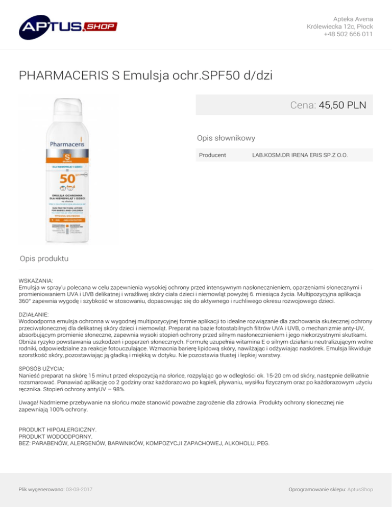 Apteka Avena Królewiecka 12c, Płock +48 502 666 011 PHARMACERIS S Emulsja ochr.SPF50 d/dzi Cena: 45,50 PLN Opis słownikowy Producent LAB.KOSM.DR IRENA ERIS SP.Z O.O. Opis produktu WSKAZANIA: Emulsja w spray’u polecana w celu zapewnienia wysokiej ochrony przed intensywnym nasłonecznieniem, oparzeniami słonecznymi i promieniowaniem UVA i UVB delikatnej i wrażliwej skóry ciała dzieci i niemowląt powyżej 6. miesiąca życia. Multipozycyjna aplikacja 360° zapewnia wygodę i szybkość w stosowaniu, dopasowując się do aktywnego i ruchliwego okresu rozwojowego dzieci. DZIAŁANIE: Wodoodporna emulsja ochronna w wygodnej multipozycyjnej formie aplikacji to idealne rozwiązanie dla zachowania skutecznej ochrony przeciwsłonecznej dla delikatnej skóry dzieci i niemowląt. Preparat na bazie fotostabilnych filtrów UVA i UVB, o mechanizmie anty-UV, absorbującym promienie słoneczne, zapewnia wysoki stopień ochrony przed silnym nasłonecznieniem i jego niekorzystnymi skutkami. Obniża ryzyko powstawania uszkodzeń i poparzeń słonecznych. Formułę uzupełnia witamina E o silnym działaniu neutralizującym wolne rodniki, odpowiedzialne za reakcje fotouczulające. Wzmacnia barierę lipidową skóry, nawilżając i odżywiając naskórek. Emulsja likwiduje szorstkość skóry, pozostawiając ją gładką i miękką w dotyku. Nie pozostawia tłustej i lepkiej warstwy. SPOSÓB UŻYCIA: Nanieść preparat na skórę 15 minut przed ekspozycją na słońce, rozpylając go w odległości ok. 15-20 cm od skóry, następnie delikatnie rozsmarować. Ponawiać aplikację co 2 godziny oraz każdorazowo po kąpieli, pływaniu, wysiłku fizycznym oraz po każdorazowym użyciu ręcznika. Stopień ochrony antyUV – 98%. Uwaga! Nadmierne przebywanie na słońcu może stanowić poważne zagrożenie dla zdrowia. Produkty ochrony słonecznej nie zapewniają 100% ochrony. PRODUKT HIPOALERGICZNY. PRODUKT WODOODPORNY. BEZ: PARABENÓW, ALERGENÓW, BARWNIKÓW, KOMPOZYCJI ZAPACHOWEJ, ALKOHOLU, PEG. Plik wygenerowano: 03-03-2017 Powered by TCPDF (www.tcpdf.org) Oprogramowanie sklepu: AptusShop