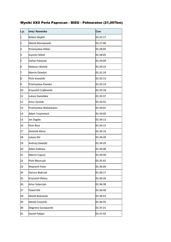 Wyniki XXII Perła Paprocan - BIEG - Półmaraton (21,097km) L.p. Imię i Nazwisko Czas 1 Robert Bojdoł 01:25:17 2 Marek Maciejewski 01:27:46 3 Przemysław Gibiec 01:28:05 4 Szymon Nikiel 01:28:05 5 Stefan Palowski 01:29:09 6 Mateusz Wolnik 01:29:22 7 Marcin Dziedzic 01:31:19 8 Piotr Kowalski 01:32:15 9 Przemysław Pasieka 01:33:14 10 Krzysztof Czajkowski 01:33:18 11 Łukasz Gwizdaka 01:33:37 12 Artur Zemlak 01:33:55 13 Przemysław Walukiewicz 01:34:01 14 Adam Trzęśmiech 01:34:05 15 Jan Żogała 01:34:13 16 Piotr Bryś 01:34:15 17 Dominik Micor 01:34:19 18 Łukasz Nir 01:34:20 19 Andrzej Gwóźdź 01:34:29 20 Adam Satława 01:34:48 21 Marcin Cupryś 01:34:50 22 Piotr Błaszczyk 01:35:41 23 Wojciech Pater 01:36:04 24 Dariusz Białczak 01:36:17 25 Krzysztof Oleksy 01:36:26 26 Artur Solarczyk 01:36:38 27 Paweł Kliś 01:36:40 28 Marek Bukowski 01:36:53 29 Marek Ciszyński 01:36:59 30 Zbigniew Szczepanek 01:37:21 31 Daniel Pabjan 01:37:43 32 Bartosz Mych 01:37:50 33 Marcin Bednarczuk 01:38:33 34 Sławomir Drobny 01:38:44 35 Jan Bierski 01:38:45 36 Piotr Kocełak 01:39:01 37 Maciej Gaik 01:39:10 38 Artur Czernik 01:39:17 39 Krzysztof Tomaszewicz 01:39:19 40 Mariusz Górski 01:39:49 41 Jacek Międzik 01:39:53 42 Adam Sojka 01:39:54 43 Wojciech Winkler 01:40:13 44 Piotr Oleszak 01:40:40 45 Sebastian Kaczor 01:40:40 46 Dariusz Bojanowicz 01:41:01 47 Krzysztof Krzempek 01:41:09 48 Adam Danel 01:41:26 49 Piotr Burzawa 01:41:31 50 Dawid Klaja 01:42:00 51 Mateusz Kula 01:42:14 52 Krzysztof Gwóźdź 01:42:18 53 Sebastian Macioł 01:42:19 54 Łukasz Buława 01:42:26 55 Edward Dudek 01:42:37 56 Aleksandra Loska 01:42:38 57 Krzysztof Kubica 01:42:43 58 Ireneusz Krzempek 01:43:01 59 Adam Kurzeja 01:43:04 60 Bartłomiej Bunio 01:43:09 61 Michał Czechowski 01:43:10 62 Krystian Węgierek 01:43:17 63 Filipe Martins 01:43:36 64 Rafał Kolankiewicz 01:43:39 65 Janusz Czapiewski 01:43:47 66 Przemek Nawrocki 01:43:51 67 Grzegorz Powrożnik 01:43:54 68 Krzysztof Piechociński 01:44:05 69 Lucjan Saternus 01:44:07 70 Łukasz Jarlaczyński 01:44:09 71 Michał Stopa 01:44:10 72 Alina Rogoz 01:44:10 73 Tomasz Pietras 01:44:11 74 Łukasz Zięba 01:44:37 75 Arkadiusz Woroch 01:44:41 76 Piotr Latusek 01:44:43 77 Adam Kowalczyk 01:44:46 78 Józek Ścierski 01:44:53 79 Mirosław Kubek 01:44:57 80 Marek Litwin 01:45:14 81 Adam Małysa 01:45:17 82 Mariusz Gunia 01:45:29 83 Ryszard Zakrzewski 01:45:34 84 Grzegorz Masny 01:45:54 85 Jarosław Uzdowski 01:46:03 86 Marek Walkiewicz 01:46:16 87 Nikodem Anczykowski 01:46:26 88 Krzysztof Kopiński 01:46:49 89 Miłosz Surdziel 01:46:52 90 Katarzyna Łagosz 01:47:10 91 Bartłomiej Cieślak 01:47:10 92 Wojciech Macyszyn 01:47:14 93 Wojciech Beśka 01:47:20 94 Michał Dawid 01:47:26 95 Adam Juzyk 01:47:32 96 Michał Kolczyk 01:47:35 97 Tadeusz Chrzan 01:47:46 98 Robert Fors 01:47:54 99 Łukasz Chrobak 01:48:04 100 Michał Żywioł 01:48:08 101 Janusz Paluch 01:48:12 102 Roman Strauchman 01:48:17 103 Michał Fidor 01:48:20 104 Agnieszka Kos 01:48:26 105 Agata Nawrocka 01:48:27 106 Tomasz Sikora 01:48:33 107 Marcin Szala 01:48:37 108 Krzysztof Bojarski 01:48:44 109 Mateusz Wojnarowski 01:49:07 110 Jakub Szczepka 01:49:09 111 Michał Gąszczak 01:49:13 112 Janusz Pawłowski 01:49:19 113 Damian Jaworski 01:49:23 114 Grzegorz Skrzypiec 01:49:26 115 Adam Pacuła 01:49:38 116 Adam Paździorek 01:49:42 117 Szymon Wiórek 01:49:59 118 Marcin Zajusz 01:50:25 119 Tobiasz Nawrocki 01:50:27 120 Marcin Kocoń 01:50:29 121 Ryszard Kubera 01:50:44 122 Leszek Zgraj 01:50:45 123 Jan Kwapisz 01:50:50 124 Joanna Szczepanek 01:51:18 125 Damian Wieczorek 01:51:19 126 Michał Kasprowski 01:51:24 127 Jacek Grzesik 01:51:33 128 Adam Nawrocki 01:52:06 129 Marcin Szojda 01:52:09 130 Artur Bauer 01:52:10 131 Zbigniew Wilk 01:52:21 132 Aleksander Michałowski 01:52:28 133 Rafał Katolik 01:52:31 134 Aleksander Sułkowski 01:52:36 135 Piotr Wolner 01:52:37 136 Szymon Danielczyk 01:52:38 137 Krzysztof Zaręba 01:52:48 138 Tomasz Szymczyk 01:52:49 139 Bartłomiej Żłobiński 01:52:54 140 Dariusz Belowski 01:52:57 141 Michał Pałys 01:53:02 142 Witold Twardosz 01:53:05 143 Janusz Przyłudzki 01:53:07 144 Rafał Lasota 01:53:09 145 Iza Hońca 01:53:13 146 Artur Gładysz 01:53:16 147 Piotr Maćkowiak 01:53:19 148 Adam Sobczak 01:53:22 149 Jacek Iskierka 01:53:34 150 Paweł Czajkowski 01:53:35 151 Zbyszek Kwiecień 01:53:57 152 Barbara Boba 01:54:03 153 Marcin Wawrzyń 01:54:05 154 Tomasz Kochmanski 01:54:06 155 Daniel Michura 01:54:07 156 Wojciech Jarczyk 01:54:09 157 Tomasz Szygulski 01:54:09 158 Joanna Kurasz 01:54:10 159 Tomasz Wawrzeń 01:54:11 160 Anna Palińska 01:54:17 161 Krzysztof Szyncel 01:54:17 162 Michał Staniecko 01:54:19 163 Damian Fidor 01:54:25 164 Krzysztof Kluska 01:54:32 165 Grzegorz Wańczyk 01:54:36 166 Adam Jarzyna 01:54:43 167 Szymon Hrapkowicz 01:54:46 168 Ola Herman 01:54:47 169 Monika Wróbel 01:54:47 170 Robert Zemsta 01:54:56 171 Robert Winiarski 01:54:57 172 Adrian Wójcik 01:55:08 173 Krzysztof Lubowiecki 01:55:12 174 Piotr Lorens 01:55:15 175 Olek Bala 01:55:15 176 Tomasz Lesiecki 01:55:20 177 Monika Stanicka 01:55:25 178 Damian Figurski 01:55:33 179 Wojciech Brożek 01:55:34 180 Krzysztof Bieniasz 01:55:40 181 Bartosz Wojtynek 01:55:48 182 Mariusz Skowroński 01:55:51 183 Michał Rewaj 01:55:57 184 Jan Tutka 01:56:01 185 Sławomir Krzyżowski 01:56:06 186 Zbigniew Pyrsch 01:56:11 187 Kamil Żyłka 01:56:25 188 Mateusz Czapnik 01:56:26 189 Tomasz Krajwski 01:56:28 190 Jaroslaw Gorol 01:56:33 191 Maciej Ociepa 01:56:34 192 Wioletta Nocuń 01:56:36 193 Dariusz Natkaniec 01:56:43 194 Bartosz Wojciechowski 01:56:50 195 Grzegorz Knopp 01:56:53 196 Jakub Radochoński 01:57:03 197 Marek Gabrysz 01:57:10 198 Ibek Jarosław 01:57:11 199 Adam Wasiołka 01:57:12 200 Paweł Sacki 01:57:55 201 Jan Cofała 01:57:59 202 Łukasz Caban 01:58:06 203 Grzegorz Fuchs 01:58:12 204 Jarosław Reguła 01:58:15 205 Jakub Cieślak 01:58:15 206 Wojciech Kłopot 01:58:25 207 Piotr Święs 01:58:33 208 Artur Go
