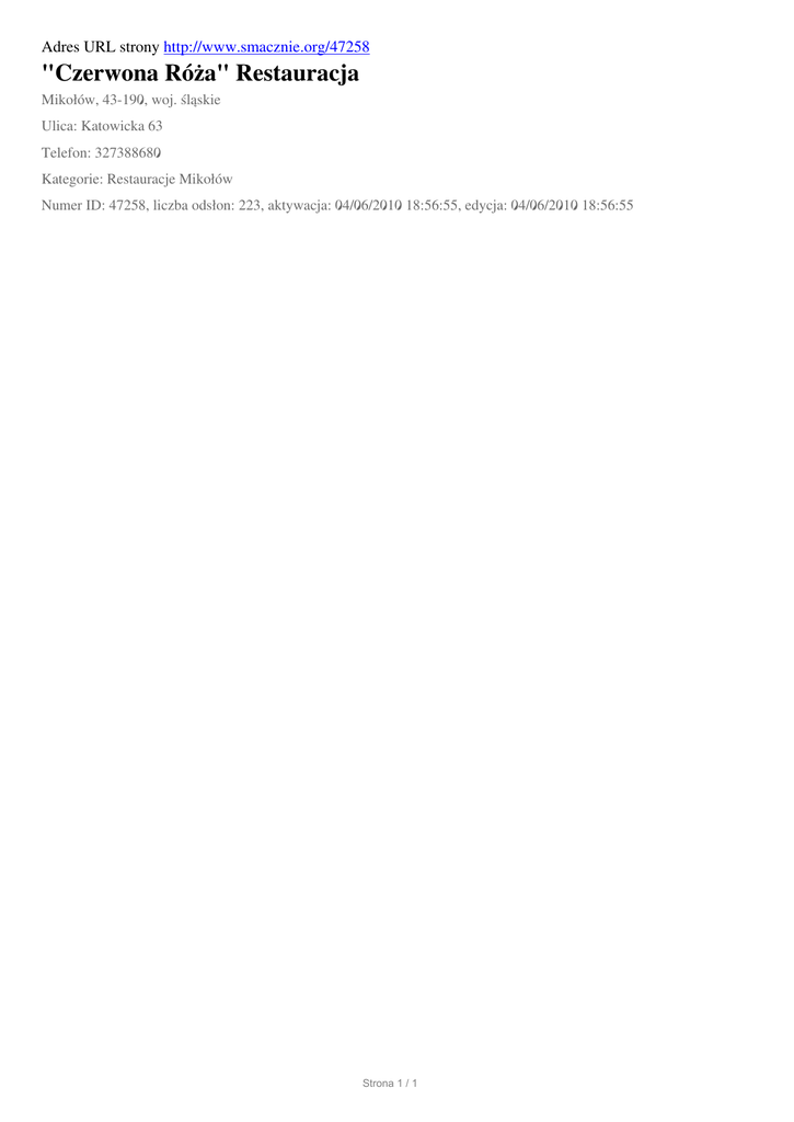 "Czerwona Roza" Restauracja, Mikolow, Katowicka 63