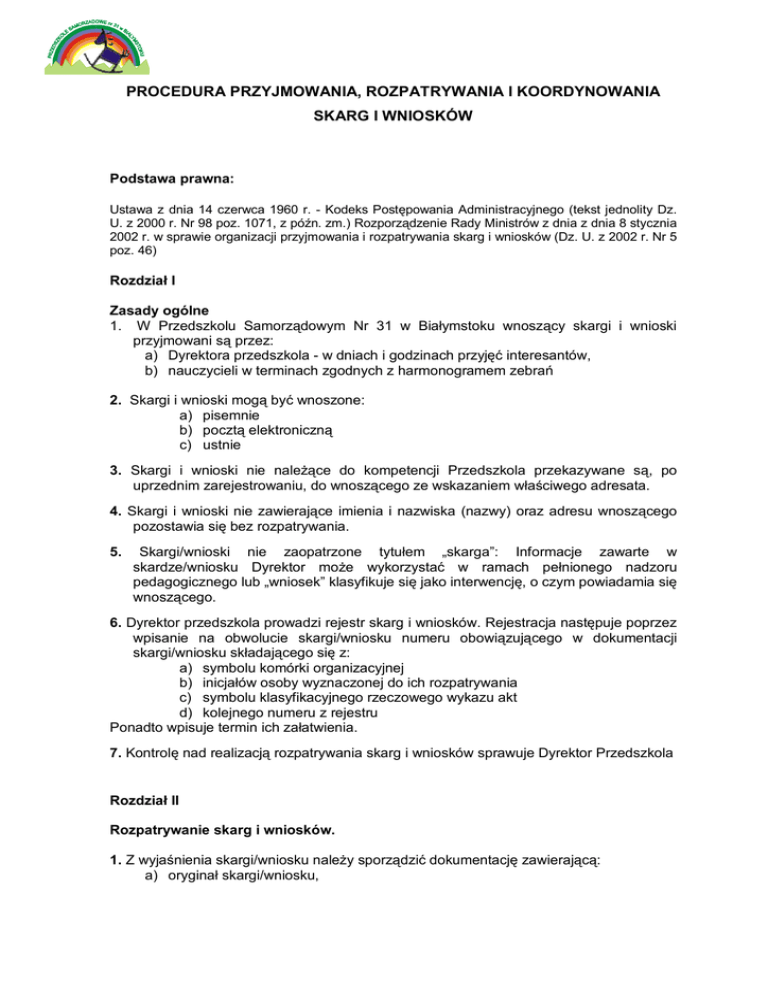 PROCEDURA PRZYJMOWANIA, ROZPATRYWANIA I KOORDYNOWANIA SKARG I WNIOSKÓW Podstawa prawna: Ustawa z dnia 14 czerwca 1960 r. - Kodeks Postępowania Administracyjnego (tekst jednolity Dz. U. z 2000 r. Nr 98 poz. 1071, z późn. zm.) Rozporządzenie Rady Ministrów z dnia z dnia 8 stycznia 2002 r. w sprawie organizacji przyjmowania i rozpatrywania skarg i wniosków (Dz. U. z 2002 r. Nr 5 poz. 46) Rozdział I Zasady ogólne 1. W Przedszkolu Samorządowym Nr 31 w Białymstoku wnoszący skargi i wnioski przyjmowani są przez: a) Dyrektora przedszkola - w dniach i godzinach przyjęć interesantów, b) nauczycieli w terminach zgodnych z harmonogramem zebrań 2. Skargi i wnioski mogą być wnoszone: a) pisemnie b) pocztą elektroniczną c) ustnie 3. Skargi i wnioski nie naleŜące do kompetencji Przedszkola przekazywane są, po uprzednim zarejestrowaniu, do wnoszącego ze wskazaniem właściwego adresata. 4. Skargi i wnioski nie zawierające imienia i nazwiska (nazwy) oraz adresu wnoszącego pozostawia się bez rozpatrywania. 5. Skargi/wnioski nie zaopatrzone tytułem „skarga”: Informacje zawarte w skardze/wniosku Dyrektor moŜe wykorzystać w ramach pełnionego nadzoru pedagogicznego lub „wniosek” klasyfikuje się jako interwencję, o czym powiadamia się wnoszącego. 6. Dyrektor przedszkola prowadzi rejestr skarg i wniosków. Rejestracja następuje poprzez wpisanie na obwolucie skargi/wniosku numeru obowiązującego w dokumentacji skargi/wniosku składającego się z: a) symbolu komórki organizacyjnej b) inicjałów osoby wyznaczonej do ich rozpatrywania c) symbolu klasyfikacyjnego rzeczowego wykazu akt d) kolejnego numeru z rejestru Ponadto wpisuje termin ich załatwienia. 7. Kontrolę nad realizacją rozpatrywania skarg i wniosków sprawuje Dyrektor Przedszkola Rozdział II Rozpatrywanie skarg i wniosków. 1. Z wyjaśnienia skargi/wniosku naleŜy sporządzić dokumentację zawierającą: a) oryginał skargi/wniosku, b) notatkę słuŜbową informującą o sposobie załatwienia skargi/wniosku i wynikach postępowania wyjaśniającego c) materiały pomocnicze zebrane w trakcie wyjaśniania skargi/wniosku (oświadczenia, opinie, kserokopie dokumentów, wyciągi), d) odpowiedź do wnoszącego, informującą o sposobie rozstrzygnięcia sprawy wraz z urzędowo potwierdzonym jej wysłaniem, e) pismo do organu prowadzącego, jeśli wymaga tego sprawa. 2. Odpowiedź na skargę/wniosek winna zawierać: a) oznaczenie organu, od którego pochodzi, b) wyczerpującą informację o sposobie załatwienia sprawy z odniesieniem się do wszystkich zarzutów/wniosków zawartych w skardze/wniosku, c) faktyczne i prawne (z podaniem podstawy prawnej) uzasadnienie, jeŜeli skarga/wniosek została załatwiona odmownie, d) imię i nazwisko, podpis i stanowisko osoby upowaŜnionej do załatwienia skargi. 3. Projekt odpowiedzi na skargę/wniosek osoba rozpatrująca sprawę, po uprzednim parafowaniu jej, przekazuje do podpisu Dyrektorowi. 4. Pełną dokumentację po zakończeniu sprawy, nie później niŜ 7 dni po otrzymaniu potwierdzenia odbioru odpowiedzi na skargę/wniosek przekazuje się Dyrektorowi, potwierdzając ten fakt własnoręcznym podpisem w rejestrze skarg i wniosków. Na obwolucie skargi/wnioski, na której zamieszcza się spis dokumentów zgromadzonych w trakcie załatwiania skargi/wniosku, powinien znajdować się równieŜ podpis dyrektora przedszkola. 5. W przypadku wydania nauczycielowi/pracownikowi zaleceń przez osobę rozpatrującą skargę/wniosek naleŜy kopię tego pisma dołączyć do dokumentacji wymienionej w ust. 4. Kontrolę z wykonania wydanych zaleceń przeprowadza osoba wydająca je. 6. Za jakość i prawidłowe wykonanie, załatwienie skargi/wniosku odpowiadają osoby, na które dekretowano wniosek/skargę. Rozdział III Terminy 1. Termin rozpatrzenia skargi/wniosku wynosi, z zastrzeŜeniem ust. 2, do miesiąca od dnia wpływu. 2. Ustala się następujące terminy rozpatrywania skarg i wniosków. 1) do 2 miesięcy, gdy skarga lub wniosek jest szczególnie skomplikowana, 2) do 7 dni naleŜy: a) zwrócić skargę/wniosek wnoszącemu ze wskazaniem właściwego organu, jeŜeli skarga/wniosek została skierowana do niewłaściwego organu, b) przesłać informację do wnoszącego o przesunięciu terminu załatwienia skargi/wniosku z podaniem powodu przesunięcia, jeŜeli nie ma moŜliwości ich załatwienia w określonym terminie, c) zwrócić się z prośbą do osoby wnoszącej o przesłanie dodatkowych informacji dotyczących skargi/wniosku, d) udzielić odpowiedzi w przypadku ponowienia skargi/wniosku, w której brak jest wskazania nowych okoliczności sprawy. Białystok 01 wrzesień 2008r.