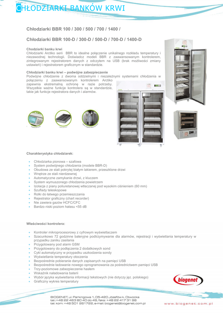 CHŁODZIARKI BANKÓW KRWI Chłodziarki BBR 100 / 300 / 500 / 700 / 1400 / Chłodziarki BBR 100-D / 300-D / 500-D / 700-D / 1400-D Chodziarki banku krwi Chłodziarki Arctiko serii BBR to idealne połączenie unikalnego rozkładu temperatury i niezawodnej technologii. Doświadcz modeli BBR z zaawansowanym kontrolerem, zintegrowanym rejestratorem danych z odczytem na USB (brak możliwości zmiany ustawień) i rejestratorem graficznym w standardzie. Chłodziarki banku krwi – podwójne zabezpieczenie Podwójne chłodzenie z dwoma oddzielnymi i niezależnymi systemami chłodzenia w połączeniu z zaawansowanym kontrolerem Arctiko zapewnia ekstremalną ochronę w razie potrzeby. Wszystkie ważne funkcje kontrolera są w standardzie, takie jak funkcje rejestratora danych i alarmów. Charakterystyka chłodziarek: Chłodziarka pionowa – szafowa System podwójnego chłodzenia (modele BBR-D) Obudowa ze stali pokrytej białym lakierem, przeszklone drzwi Wnętrze ze stali nierdzewnej Automatyczne zamykanie drzwi, z kluczem System wymuszonego chłodzenia powietrzem Izolacja z piany poliuretanowej wtłaczanej pod wysokim ciśnieniem (60 mm) Szuflady teleskopowe Rolki do łatwego przemieszczania Rejestrator graficzny (chart recorder) Nie zawiera gazów HCFC/CFC Bardzo niski poziom hałasu <55 dB Właściwości kontrolera: Kontroler mikroprocesorowy z cyfrowym wyświetlaczem Szacunkowo 72 godzinne bateryjne podtrzymywanie dla alarmów, rejestracji i wyświetlania temperatury w przypadku zaniku zasilania Przygotowany pod alarm GSM Przygotowany do podłączenia 2 dodatkowych sond Cykl automatyczny w przypadku uszkodzenia sondy Wyświetlanie temperatury otoczenia Bezpośrednie pobieranie danych zapisanych na pamięci USB Bezpośrednie ładowanie nowego oprogramowania za pośrednictwem pamięci USB Trzy-poziomowe zabezpieczenie hasłem Wskaźnik naładowania baterii Wybór języka wyświetlania informacji tekstowych (nie dotyczy jęz. polskiego) Graficzny wykres temperatury CHŁODZIARKI BANKÓW KRWI Właściwości rejestratora: Zintegrowany rejestrator danych Złącze USB/RS485/RS232 Zintegrowana pamięć do 30 lat Właściwości alarmu: Wizualny i akustyczny alarm Regulowany alarm temperatury za wysokiej / za niskiej Alarm uszkodzenia sondy Alarm zaniku zasilania Alarm uszkodzenia urządzenia Alarm otwartych drzwi Styk do podłączenia alarmu zewnętrznego (zdalnego) Wyświetlanie wszystkich alarmów Specyfikacja techniczna: Model Kod produktu Wymiary zewnętrzne L x D x H [mm] Wymiary wewnętrzne L x D x H [mm] Pojemność [L] Waga [kg] Standard / max liczba szuflad Standard / max liczba worków Kompresor Zakres temperatury [°C] Zasilanie [V] Model Kod produktu Wymiary zewnętrzne L x D x H [mm] Wymiary wewnętrzne L x D x H [mm] Pojemność [L] Waga [kg] Standard / max liczba szuflad Standard / max liczba worków Kompresor Zakres temperatury [°C] Zasilanie [V] Opcjonalnie: Usługa walidacji BBR 100 DAI 0770 BBR 300 DAI 0775 BBR 500 DAI 0735 BBR 700 DAI 0740 BBR 1400 DAI 0745 610 x 650 x 790 520 x 690x1997 620 x 860 x 1997 720 x 860 x 1997 1440 x 860 x 1997 490 x 440 x 434 400 x 585 x 1505 500 x 695 x 1505 600 x 695 x 1505 1320 x 695 x 1505 94 71 352 133 523 148 628 163 1381 198 2/2 5/8 5/8 5/8 10 / 16 72 / 72 160 / 256 240 / 384 300 / 480 600 / 960 1 +4 230 1 +4 230 1 +4 230 1 +4 230 1 +4 230 BBR 100-D DAI 0795 BBR 300-D DAI 0800 BBR 500-D DAI 0780 BBR 700-D DAI 0785 BBR 1400-D DAI 0790 610 x 650 x 790 520 x 690x1997 620 x 860 x 1997 720 x 860 x 1997 1440 x 860 x 1997 490 x 440 x 434 400 x 585 x 1505 500 x 695 x 1505 600 x 695 x 1505 1320 x 695 x 1505 94 71 352 133 523 148 628 163 1381 198 2/2 5/8 5/8 5/8 10 / 16 72 / 72 160 / 256 240 / 384 300 / 480 600 / 960 2 +4 230 2 +4 230 2 +4 230 2 +4 230 2 +4 230