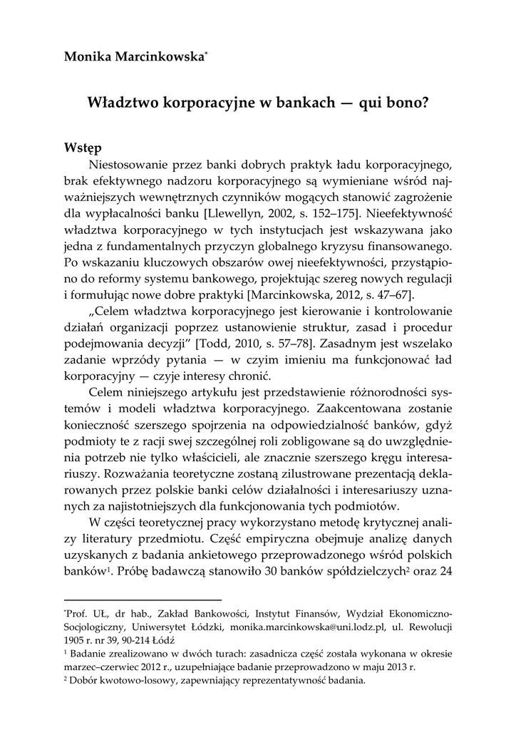 Monika Marcinkowska* Władztwo korporacyjne w bankach — qui bono? Wstęp Niestosowanie przez banki dobrych praktyk ładu korporacyjnego, brak efektywnego nadzoru korporacyjnego są wymieniane wśród najważniejszych wewnętrznych czynników mogących stanowić zagrożenie dla wypłacalności banku [Llewellyn, 2002, s. 152–175]. Nieefektywność władztwa korporacyjnego w tych instytucjach jest wskazywana jako jedna z fundamentalnych przyczyn globalnego kryzysu finansowanego. Po wskazaniu kluczowych obszarów owej nieefektywności, przystąpiono do reformy systemu bankowego, projektując szereg nowych regulacji i formułując nowe dobre praktyki [Marcinkowska, 2012, s. 47–67]. „Celem władztwa korporacyjnego jest kierowanie i kontrolowanie działań organizacji poprzez ustanowienie struktur, zasad i procedur podejmowania decyzji” [Todd, 2010, s. 57–78]. Zasadnym jest wszelako zadanie wprzódy pytania — w czyim imieniu ma funkcjonować ład korporacyjny — czyje interesy chronić. Celem niniejszego artykułu jest przedstawienie różnorodności systemów i modeli władztwa korporacyjnego. Zaakcentowana zostanie konieczność szerszego spojrzenia na odpowiedzialność banków, gdyż podmioty te z racji swej szczególnej roli zobligowane są do uwzględnienia potrzeb nie tylko właścicieli, ale znacznie szerszego kręgu interesariuszy. Rozważania teoretyczne zostaną zilustrowane prezentacją deklarowanych przez polskie banki celów działalności i interesariuszy uznanych za najistotniejszych dla funkcjonowania tych podmiotów. W części teoretycznej pracy wykorzystano metodę krytycznej analizy literatury przedmiotu. Część empiryczna obejmuje analizę danych uzyskanych z badania ankietowego przeprowadzonego wśród polskich banków1. Próbę badawczą stanowiło 30 banków spółdzielczych2 oraz 24 * Prof. UŁ, dr hab., Zakład Bankowości, Instytut Finansów, Wydział EkonomicznoSocjologiczny, Uniwersytet Łódzki, [email protected], ul. Rewolucji 1905 r. nr 39, 90-214 Łódź 1 Badanie zrealizowano w dwóch turach: zasadnicza część została wykonana w okresie marzec–czerwiec 2012 r., uzupełniające badanie przeprowadzono w maju 2013 r. 2 Dobór kwotowo-losowy, zapewniający reprezentatywność badania. 300 Monika Marcinkowska banki komercyjne3. Artykuł jest częścią projektu badawczego, pt. „Model władztwa korporacyjnego w polskich bankach”, sfinansowanego ze środków Narodowego Centrum Nauki. 1. Modele władztwa korporacyjnego W ostatnich latach bardzo silnie akcentuje się znaczenie władztwa korporacyjnego (corporate governance) w kształtowaniu właściwych zachowań banków. Podkreśla się, że efektywne praktyki władztwa korporacyjnego mają fundamentalne znaczenie dla zdobycia i utrzymania zaufania publicznego (do samego banku i całego systemu bankowego), niezbędnego dla prawidłowego funkcjonowania systemu finansowego i całej gospodarki [Principles for Enhancing…, 2010]. Istnieje wszelako wiele poglądów na to, co oznacza „dobry ład korporacyjny”. Teorie władztwa korporacyjnego ewoluują w czasie, podobnie jak ogólne teorie przedsiębiorstwa. Są one, podobnie jak zapatrywania na rolę, zadania i obowiązki przedsiębiorstw, zróżnicowane i w znacznym stopniu zależne od szerszego kontekstu (systemu finansowego, ustroju polityczno-prawnego itd.). Można zatem wskazać wiele klasyfikacji systemów władztwa korporacyjnego: systemy rynkowe i bankowe (w zależności od dominujących modeli finansowania przedsiębiorstw), systemy indsiderów i outsiderów (w zależności od rozdzielenia własności od zarządzania), systemy prawa kodeksowego i common law, systemy w różnych modelach polityczno-ustrojowych (wybory proporcjonalne lub większościowe) itd. [Andres i inni, 2010, s. 37–56]. Jedną z częściej przywoływanych definicji ładu korporacyjnego jest wskazanie, iż „dotyczy on sposobów, w jakie kapitałodawcy zapewniają sobie uzyskanie zwrotu z inwestycji” [Shleifer, Vishny, 1996]. Wiąże się to zatem głównie z kwestią motywowania kierownictwa przedsiębiorstwa do działania w interesie dostarczycieli kapitału i kontrolowania poczynań menadżerów. To przykład podstawowego, tradycyjnego postrzegania władztwa korporacyjnego, które wynika z konstatacji, że najważniejszym obowiązkiem przedsiębiorstwa jest generowanie wartości dla właścicieli. Pierwotnie celem zasad władztwa korporacyjnego była właśnie ochrona inwestorów (przed nieefektywnością, wykroczeniami, oszukańczą sprawozdawczością finansową), współcześnie raczej podkreśla 3 Badane banki mają 87% udział w aktywach sektora. Władztwo korporacyjne w bankach — qui bono? 301 się szerszy wymiar — zapewnienia realizacji uzasadnionych oczekiwań szerszego kręgu kluczowych interesariuszy podmiotu. W drugim skrajnym ujęciu władztwo korporacyjne jest postrzegane jako „system regulacji i nadzorowania działań przedsiębiorstwa oraz równoważenia interesów wszystkich wewnętrznych interesariuszy i innych zainteresowanych stron (zewnętrznych interesariuszy, rządu, społeczności lokalnych itp.), na które przedsiębiorstwo może wpływać swym działaniem, w celu zapewnienia odpowiedzialnego zachowania przedsiębiorstw i osiągnięcia maksymalnego poziomu efektywności i rentowności przedsiębiorstwa” [du Plessis i inni, 2011, s. 10]. Można zatem wskazać, że postrzeganie władztwa korporacyjnego w znacznym stopniu jest uzależnione od postrzegania celu funkcjonowania przedsiębiorstw. Tak jak nie ma jednoznaczności czy podmiot ma działać wyłącznie w celu pomnażania bogactwa właścicieli (shareholder value concept), czy też ku pożytkowi szerszego kręgu interesariuszy (stakeholder value concept), tak odmienne są modele władztwa korporacyjnego. Uogólniając można tu wskazać trzy koncepcje [Jeżak, 2010, s. 128]: — monistyczną — podkreślającą, że przedsiębiorstwo jako własność prywatna powinno być