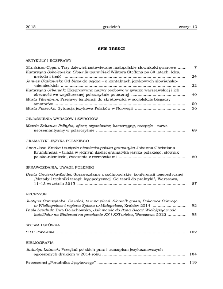 2015 grudzień zeszyt 10 SPIS TREŚCI ARTYKUŁY I ROZPRAWY Stanisław Cygan: Trzy dziewiętnastowieczne małopolskie słowniczki gwarowe ....... Katarzyna Sobolewska: Słownik warmiński Wiktora Steffena po 30 latach. Idea, metoda i treść .................................................................................................. Janusz Siatkowski: Od bicza do pejcza – o kontaktach językowych słowiańsko-niemieckich .................................................................................................... Katarzyna Urbaniak: Ekspresywne nazwy osobowe w gwarze warszawskiej i ich obecność we współczesnej polszczyźnie potocznej ............................................ Marta Tittenbrun: Przejawy tendencji do skrótowości w socjolekcie biegaczy amatorów ......................................................................................................... Marta Piasecka: Sytuacja językowa Polaków w Norwegii ......................................... 7 24 32 40 50 56 OBJAŚNIENIA WYRAZÓW I ZWROTÓW Marcin Zabawa: Polityka, oficer, organizator, komercyjny, recepcja – nowe neosemantyzmy w polszczyźnie ........................................................................ 69 GRAMATYKI JĘZYKA POLSKIEGO Anna Just: Krótka i zwięzła niemiecko-polska gramatyka Johanna Christiana Krumbholza – triada w jednym dziele: gramatyka języka polskiego, słownik polsko-niemiecki, ćwiczenia z rozmówkami ...................................................... 80 SPRAWOZDANIA, UWAGI, POLEMIKI Beata Ciecierska-Zajdel: Sprawozdanie z ogólnopolskiej konferencji logopedycznej „Metody i techniki terapii logopedycznej. Od teorii do praktyki”, Warszawa, 11–13 września 2015 ....................................................................................... 87 RECENZJE Justyna Garczyńska: Co wieś, to inna pieśń. Słownik gwary Bukówca Górnego w Wielkopolsce i regionu Spisza w Małopolsce, Kraków 2014 ........................... Pavlo Levchuk: Ewa Golachowska, Jak mówić do Pana Boga? Wielojęzyczność katolików na Białorusi na przełomie XX i XXI wieku, Warszawa 2012 ............... 92 95 SŁOWA I SŁÓWKA S.D.: Pokolenie ........................................................................................................ 102 BIBLIOGRAFIA Jadwiga Latusek: Przegląd polskich prac i czasopism językoznawczych ogłoszonych drukiem w 2014 roku ................................................................... 104 Recenzenci „Poradnika Językowego” ....................................................................... 119 2015 grudzień zeszyt 10 CONTENTS PAPERS AND DISSERTATIONS Stanisław Cygan: Three nineteenth-century dialect dictionaries from Małopolska Region .............................................................................................................. Katarzyna Sobolewska: Słownik warmiński (Warmia dictionary) by Wiktor Steffen 30 years later. The idea, the method and the content ....................................... Janusz Siatkowski: On Slavic-German linguistic contacts ...................................... Katarzyna Urbaniak: Expressive personal names in Warsaw dialect and their presence in the contemporary colloquial Polish language ................................. Marta Tittenbrun: Manifestations of the trend for brevity in the sociolect of amateur runners .......................................................................................... Marta Piasecka: The linguistic situation of Poles in Norway .................................... 7 24 32 40 50 56 EXPLANATIONS OF WORDS AND EXPRESSIONS Marcin Zabawa: Polityka (policy), oficer (officer), organizator (organiser), komercyjny (commercial), recepcja (reception) – new neosemantisms in the Polish language ...................................................................................... 69 POLISH GRAMMAR Anna Just: Krótka i zwięzła niemiecko-polska gramatyka (A brief and concise German-Polish grammar) by Johann Christian Krumbholz – a triad in one work: Polish grammar, Polish-German dictionary, practice and a phrasebook ............. 80 REPORTS, COMMENTS, POLEMICS Beata Ciecierska-Zajdel: A report on the Polish nationwide logopaedics conference “Metody i techniki terapii logopedycznej. Od teorii do praktyki” (“Speech therapy methods and techniques. From theory to practice”), Warsaw, 11–13 September 2015 .................................................................................... 87 REVIEWS Justyna Garczyńska: Co wieś, to inna pieśń. Słownik gwary Bukówca Górnego w Wielkopolsce i regionu Spisza w Małopolsce (Different village, different song. A dictionary of Bukówiec Górny dialect and Spisz region in Małopolska), Kraków 2014 ................................................................................................... Pavlo Levchuk: Ewa Golachowska, Jak mówić do Pana Boga? Wielojęzyczność katolików na Białorusi na przełomie XX i XXI wieku (How do you talk to God? Multilingualism of Catholics at the turn of the 21st century), Warsaw 2012 ......... 92 95 WORDS AND EXPRESSIONS S.D.: Pokolenie (generation) ..................................................................................... 102 BIBLIOGRAPHY Jadwiga Latusek: An overview of Polish linguistic works and journals published in 2014 ............................................................................................................ 104 Reviewers of “Poradnik Językowy” .......................................................................... 119 2015 grudzień zeszyt 10 W ZESZYCIE – XIX-wieczne słowniczki gwarowe o lokalnym zasięgu były nie tylko sposobem zapisania słów występujących w konkretnej gwarze w celu zachowania ich od zapomnienia, ale także wyrazem świadomości językowej i kulturowej ich twórców, oddających obraz świata danej społeczności wiejskiej. – Wydany 30 lat temu regionalny słownik gwary warmińskiej, op