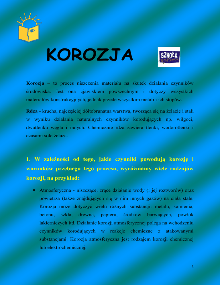 KOROZJA Korozja – to proces niszczenia materiału na skutek działania czynników środowiska. Jest ona zjawiskiem powszechnym i dotyczy wszystkich materiałów konstrukcyjnych, jednak przede wszystkim metali i ich stopów. Rdza - krucha, najczęściej żółtobrunatna warstwa, tworząca się na żelazie i stali w wyniku działania naturalnych czynników korodujących np. wilgoci, dwutlenku węgla i innych. Chemicznie rdza zawiera tlenki, wodorotlenki i czasami sole żelaza. 1. W zależności od tego, jakie czynniki powodują korozję i warunków przebiegu tego procesu, wyróżniamy wiele rodzajów korozji, na przykład: Atmosferyczna - niszczące, żrące działanie wody (i jej roztworów) oraz powietrza (także znajdujących się w nim innych gazów) na ciała stałe. Korozja może dotyczyć wielu różnych substancji: metalu, kamienia, betonu, szkła, drewna, papieru, środków barwiących, powłok lakierniczych itd. Działanie korozji atmosferycznej polega na wchodzeniu czynników korodujących w reakcje chemiczne z atakowanymi substancjami. Korozja atmosferyczna jest rodzajem korozji chemicznej lub elektrochemicznej. 1 Elektrochemiczna - korozja spowodowana działaniem substancji chemicznych, gdy reakcjom chemicznym towarzyszy przepływ prądu, np. reakcja metalu z elektrolitem. Biologiczna, biokorozja - korozja spowodowana działaniem mikroorganizmów. Jądrowa - korozja wywołana niszczącym działaniem silnego promieniowania jądrowego (np. w reaktorach jądrowych). Naprężeniowa - ten typ korozji występuje na powierzchniach poddanych obróbce skrawaniem, na powierzchniach blach po "stłuczce" oraz w elementach podlegających ciągłym naprężeniom. Zmęczeniowa - jest wynikiem współdziałania korozji elektrochemicznej oraz zmiennych naprężeń spowodowanych powstaniem ostrych wżerów przechodzących w pęknięcia wypełnione produktami korozji. Uszkodzenia spowodowane korozją zmęczeniową są znacznie większe niż suma uszkodzeń wynikających z samego naprężenia zmiennego i korozji elektrochemicznej. Międzykrystaliczna - niszczenie występuje na granicach ziarn postępując w głąb materiału. Jest to najgroźniejszy rodzaj zniszczenia, powoduje silny spadek własności wytrzymałościowych, w wielu przypadkach jest trudny do zauważenia na powierzchni metalu. Wżerowa - to lokalne ubytki metalu w miejscach osłabienia warstewki tlenkowej prowadzące do perforacji ścianki przewodu. Powstawanie wżerów związane jest z czynnikami, które utrudniają tworzenie się prawidłowej warstewki tlenkowej na wewnętrznej powierzchni rur lub powodują jej lokalne uszkodzenia. Równomierna - efektem korozji równomiernej mogą być niebieskozielone zabarwienia na ceramice sanitarnej, nieznaczne podwyższenie jonów miedzi w wodzie. Składnikami wód, które działają ochronnie w stosunku do metalu są: jony wapniowe, magnezowe, wodorowęglanowe. 2 Mechanizm ich działania polega na wytworzeniu na powierzchni metalu warstewek węglanu wapniowego bądź magnezowego, tzw. kamienia węglanowego. Selektywna - jest specyficznym rodzajem korozji, której ulegają elementy instalacji wykonane ze stopów miedzi - przede wszystkim mosiądze. Ten rodzaj korozji w przypadku mosiądzu polega na rozpuszczaniu się cynku odcynkowaniu, wskutek czego pozostaje w metalu jedynie miedź, tworząc czerwoną porowatą masę, która traci swoje właściwości mechaniczne. Cierna - występuje kiedy w dociskanych do siebie dwóch elementach jest niewielkie wzajemne powtarzalne przemieszczanie się. Zjawisko występuje np. w połączeniach śrubowych lub nitowych albo w łożyskach tocznych, zarówno między pierścieniami a ruchomą obudową, jak i między kulkami a bieżniami, kiedy łożyska podlegają małym drganiom i nie obracają się. Chemiczna - korozja spowodowana działaniem substancji chemicznych, pod warunkiem, że reakcjom chemicznym nie towarzyszy przepływ prądu, np. reakcja metalu z gazem. 2. Czynniki powodujące niszczenie metali: Woda Kwaśne deszcze Zasady Kwasy Czynniki atmosferyczne Zachodzi pod wpływem tlenu znajdującego się w powietrzu Obecność wilgoci Gwałtowne zmiany temperatury 3 3. Sposoby ochrony przed korozją: 1. Powlekanie powierzchni metali szczelnymi powłokami ochronnymi: Niemetalicznymi: farby, lakiery, smary, minia, smoła, tworzywo sztuczne Metalicznymi: - Zn, Cd – metale aktywniejsze od żelaza będą ulegać korozji szybciej niż żelazo - Sn, Cu –metale mniej aktywne od żelaza chronią swą biernością chemiczną, dopóki tworzona z nich powłoka jest szczelna. 2. Uzyskiwanie stopów odpornych na korozję, na przykład stali nierdzewnej, przez wprowadzenie do stali domieszek w postaci chromu i niklu 3. Stosowanie protektorów – wymiennych elementów wykonanych z bardzo aktywnych metali, takich jak Zn i Mg, a stosowanych na dużych obiektach szczególnie narażonych na korozję, na przykład rurociągach, kadłubach statków dalekomorskich, zbiornikach podziemnych 4. Obniżenie agresywności czynników środowiska 5. Znacznie można obniżyć działanie korodujące niektórych czynników przez zastosowanie inhibitorów (opóźniaczy) korozji. Inhibitory tworzą zwykle na powierzchni metalu warstewki ochronne hamujące szybkość korozji. Dla korozji w środowisku alkalicznym jako inhibitory korozji stosowane są sole cyny, arsenu, niklu i magnezu, zaś w środowisku kwaśnym: krochmal, klej lub białko. 6. Zabezpieczenie przed korozją elektrochemiczną stanowi tak zwana ochrona katodowa. Ochrona katodowa polega na połączeniu chronionej konstrukcji z metalem mniej szlachetnym, tworzącym anodę (protektor) ogniwa, natomiast katodą jest obiekt chroniony. Połączenie takiej anody z konstrukcją chronioną wykonuje się przez bezpośredni styk ( tzw. powłoki anodowe) lub za pomocą przewodnika. Za pomocą protektorów 4 chroni się przed korozją duże obiekty stalowe, takie jak kadłuby statków, rurociągi i podziemne zbiorniki. Protektor